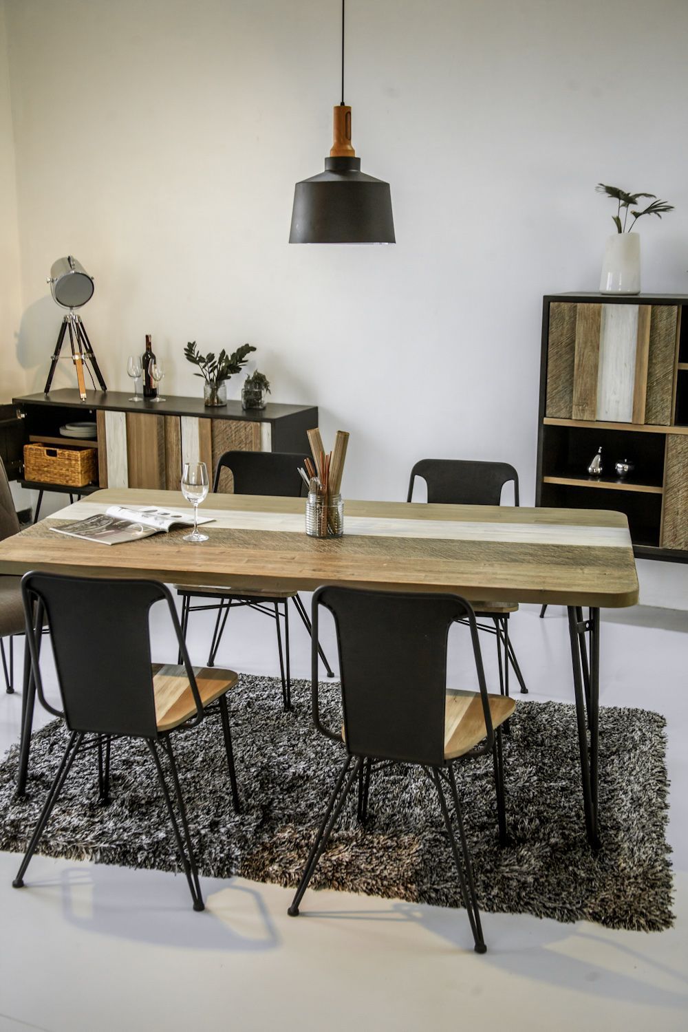 - Retro style table with an original brushed solid wood top. The table top has a variety of surface textures in various shades. The product has metal legs in black.
