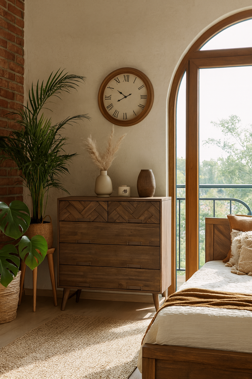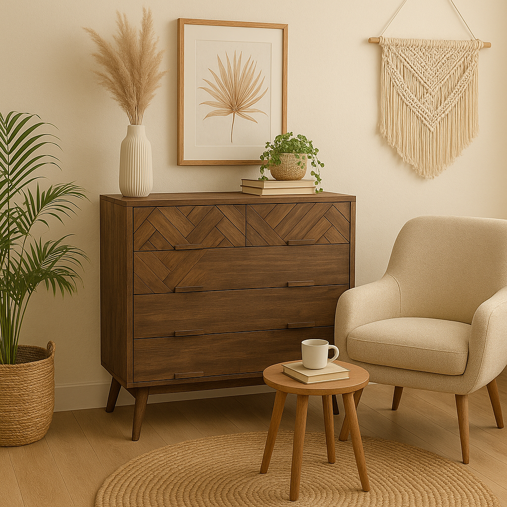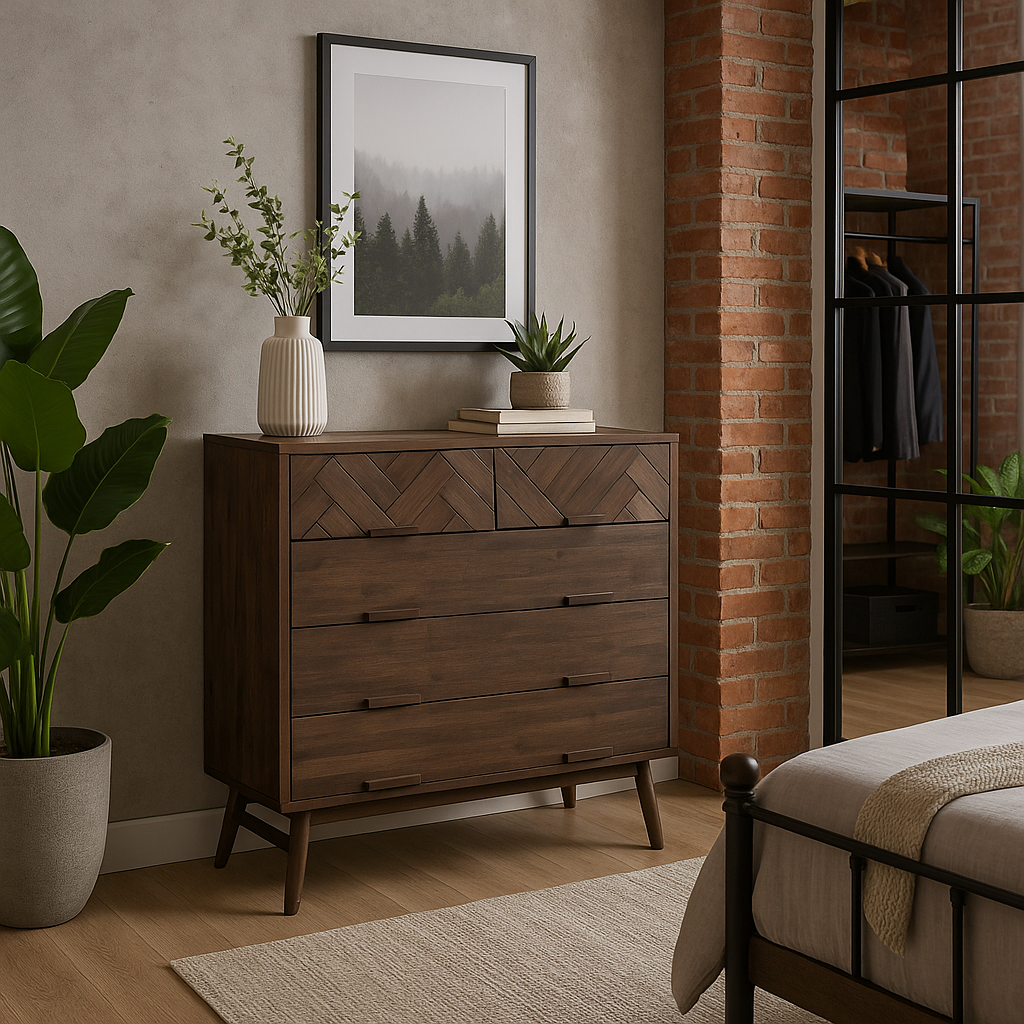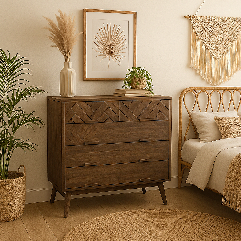 - A solid brushed wood chest of drawers, evocative of retro, vintage and boho styles, in a beautiful brown colouring with brass-coloured handles. The chest of drawers is fully wooden and has five drawers including a top section with herringbone inlay.