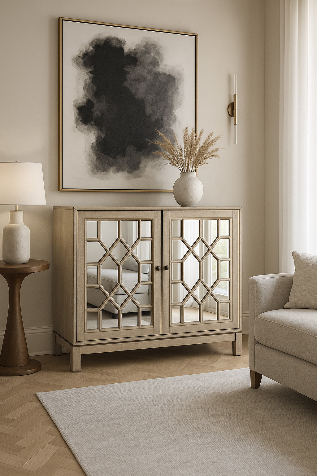 - Glamor style sideboard, made of solid acacia wood. Decorative muntins on the mirror surface of the fronts give style and elegance, while the color which is a combination of old gold with an admixture of silver and brown abrasions gives an amazing effect.