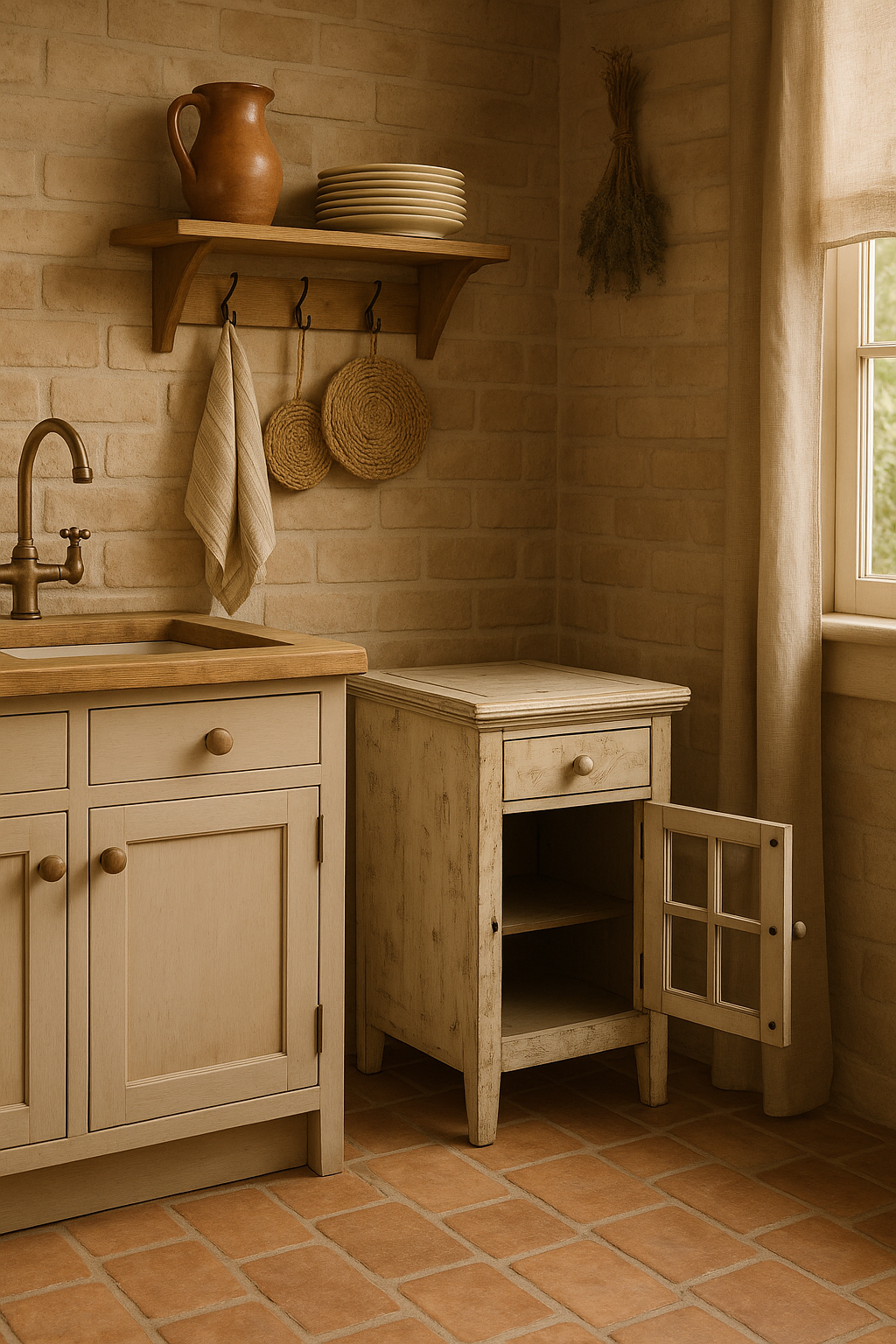 - A rustic cream-colored cabinet with characteristic aging and decorative slats. The product has a practical USB socket.