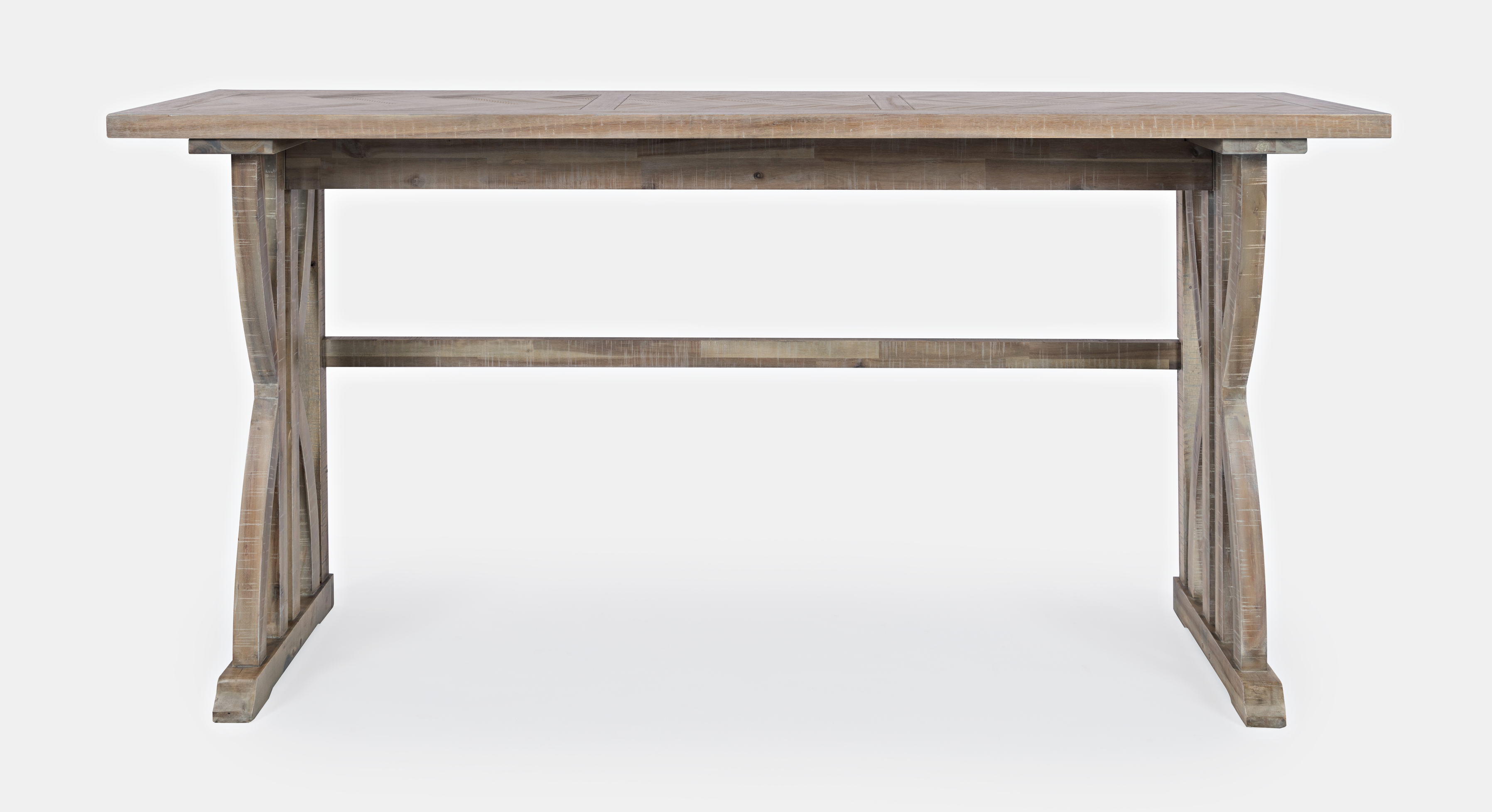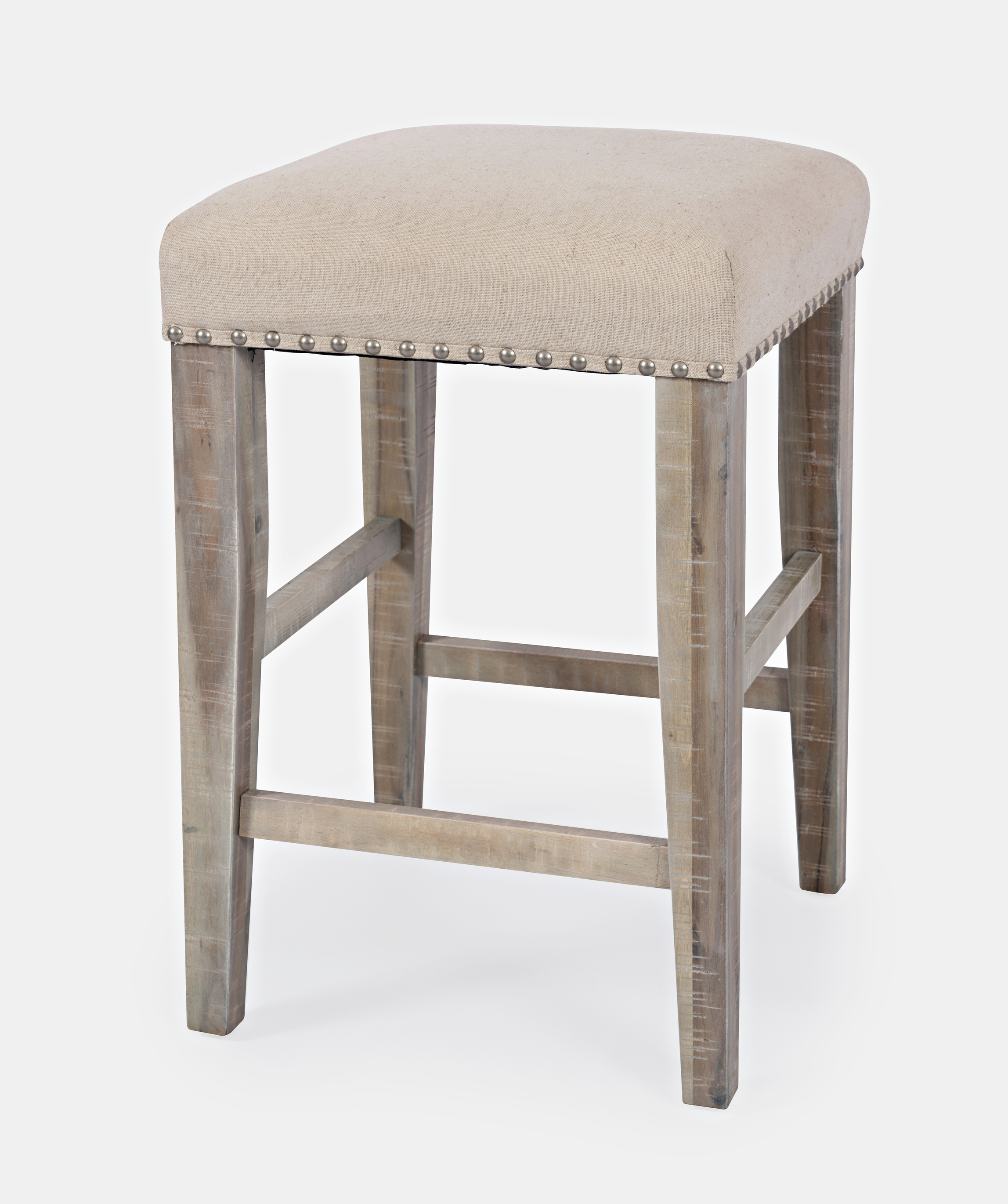 - Wooden bar table in a rustic style in light wood color. The solid top is characterized by a herringbone inlay and visible wood structure. The set includes three seats with beige upholstery and decorative studs.