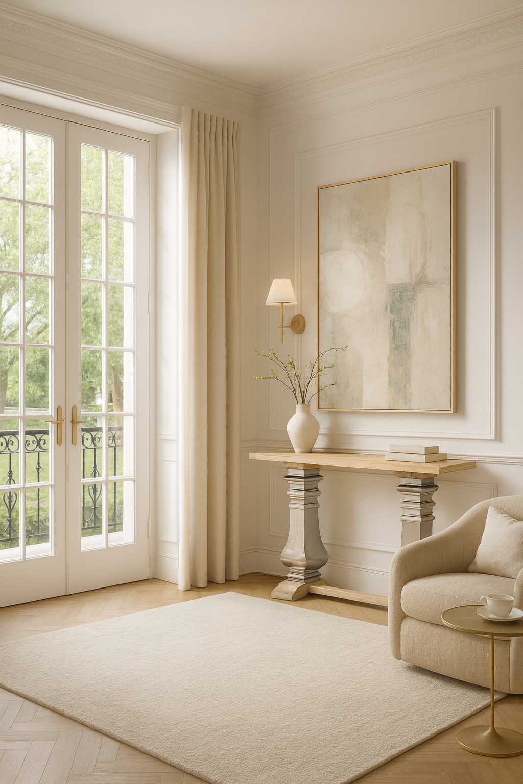 - Stylish console table on profiled stainless steel legs in a glamor, modern style. The top and the base are made of brushed recycled wood in the color of light, natural wood with bleaching. The top has a pattern inlay.
