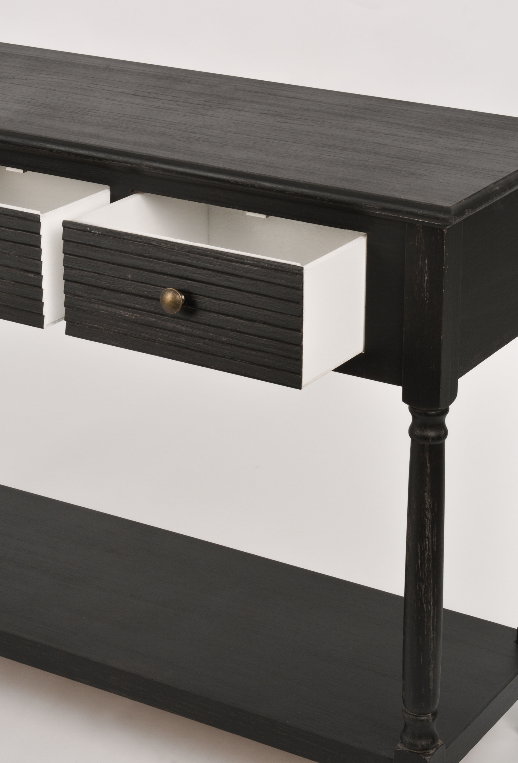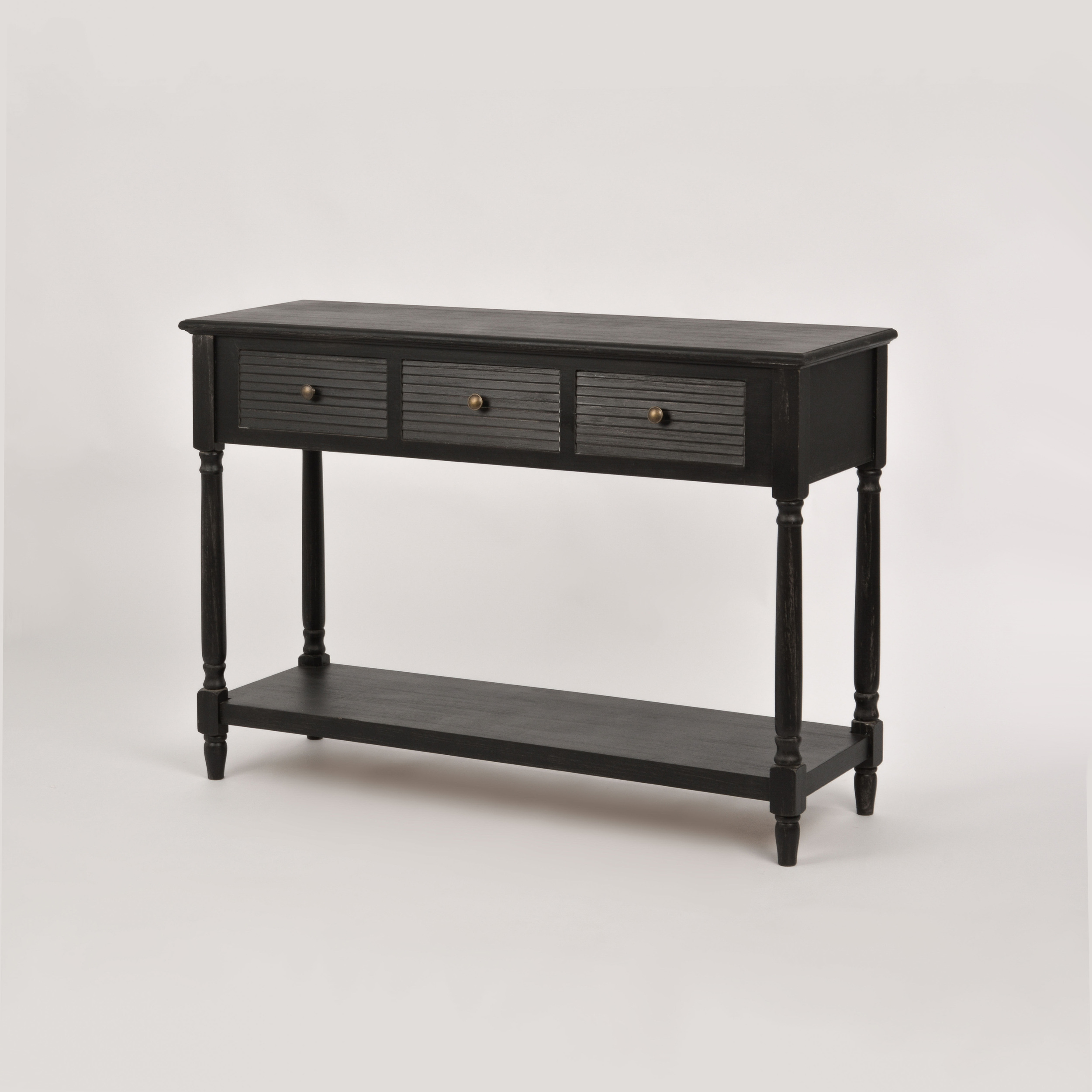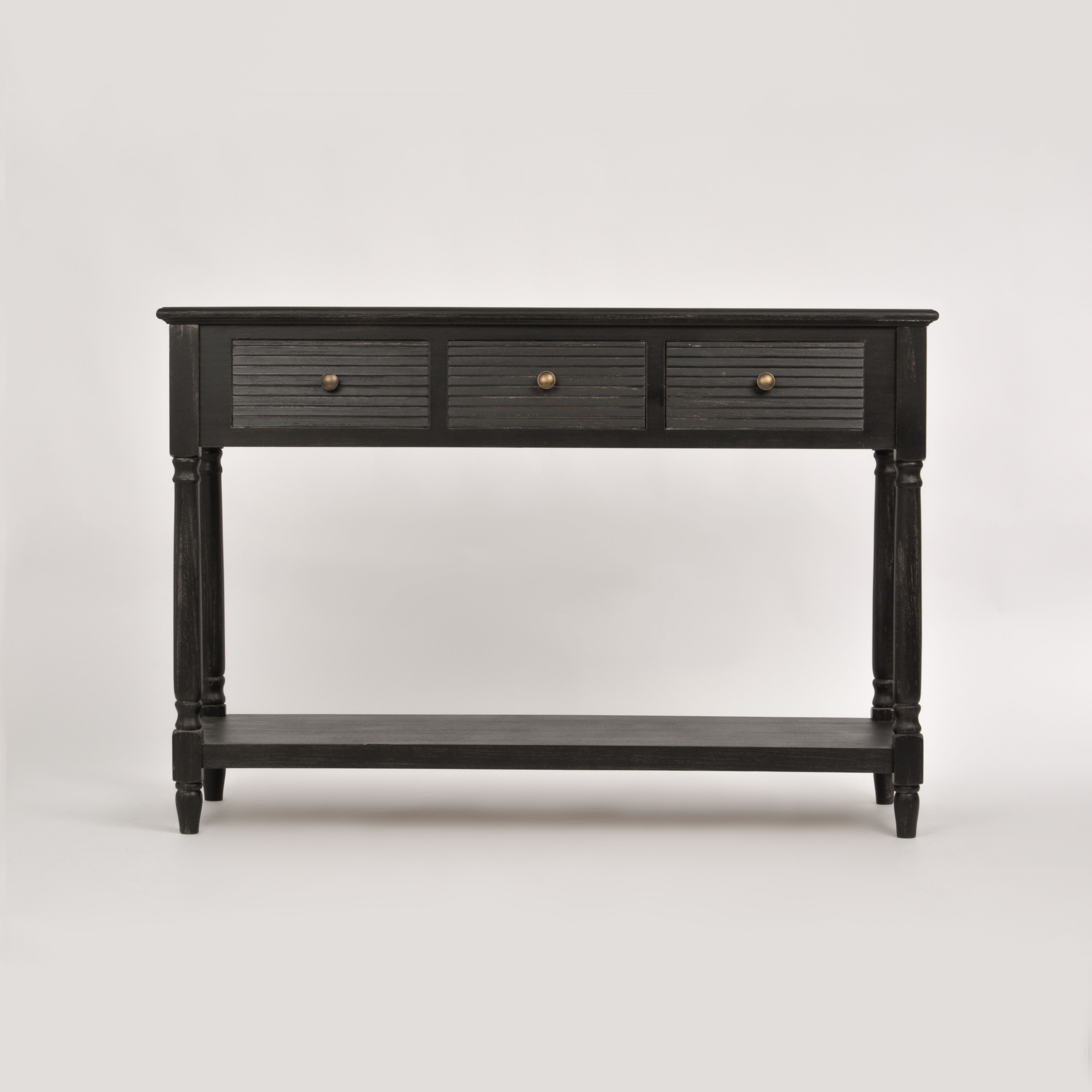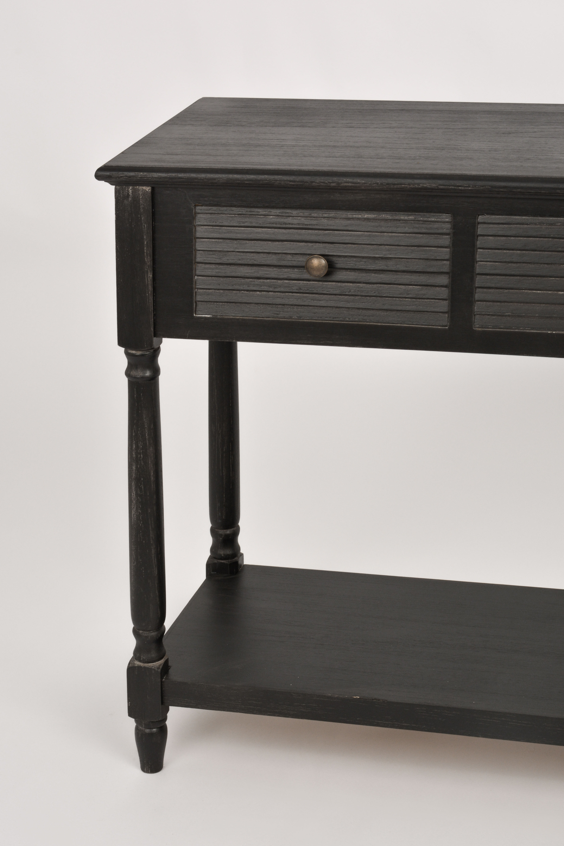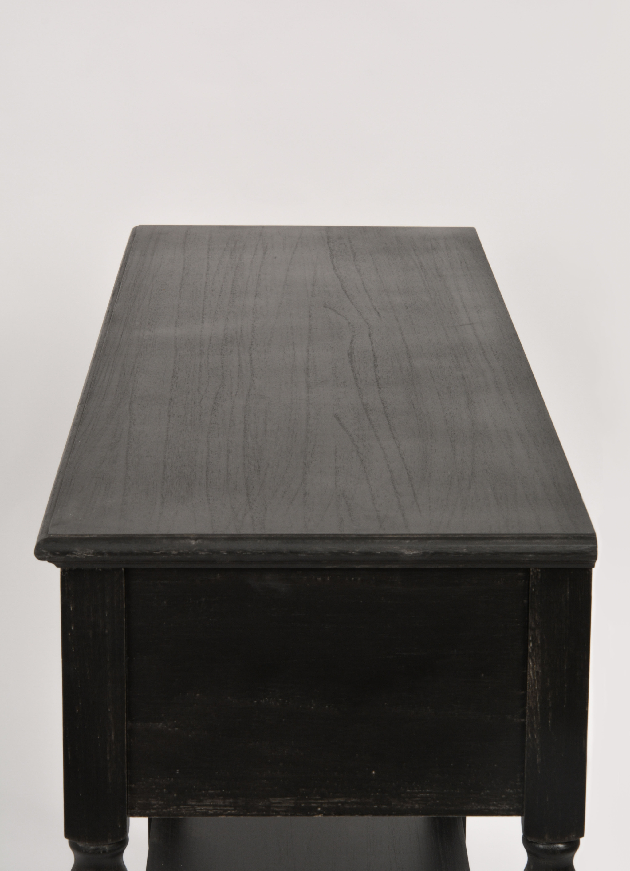 - Hand-painted console table features a Provençal, boho style. It features decorative brass-colored metal handles, milled drawer fronts, and turned legs. The uneven paint surface is distressed, revealing the wood grain.
