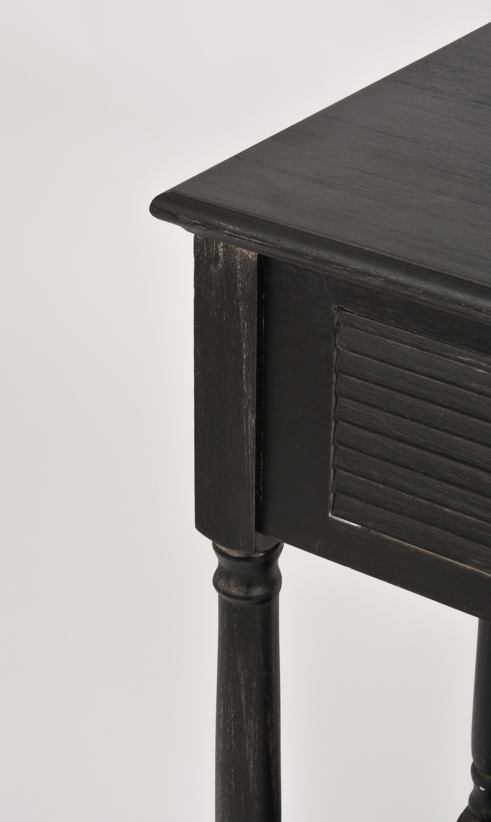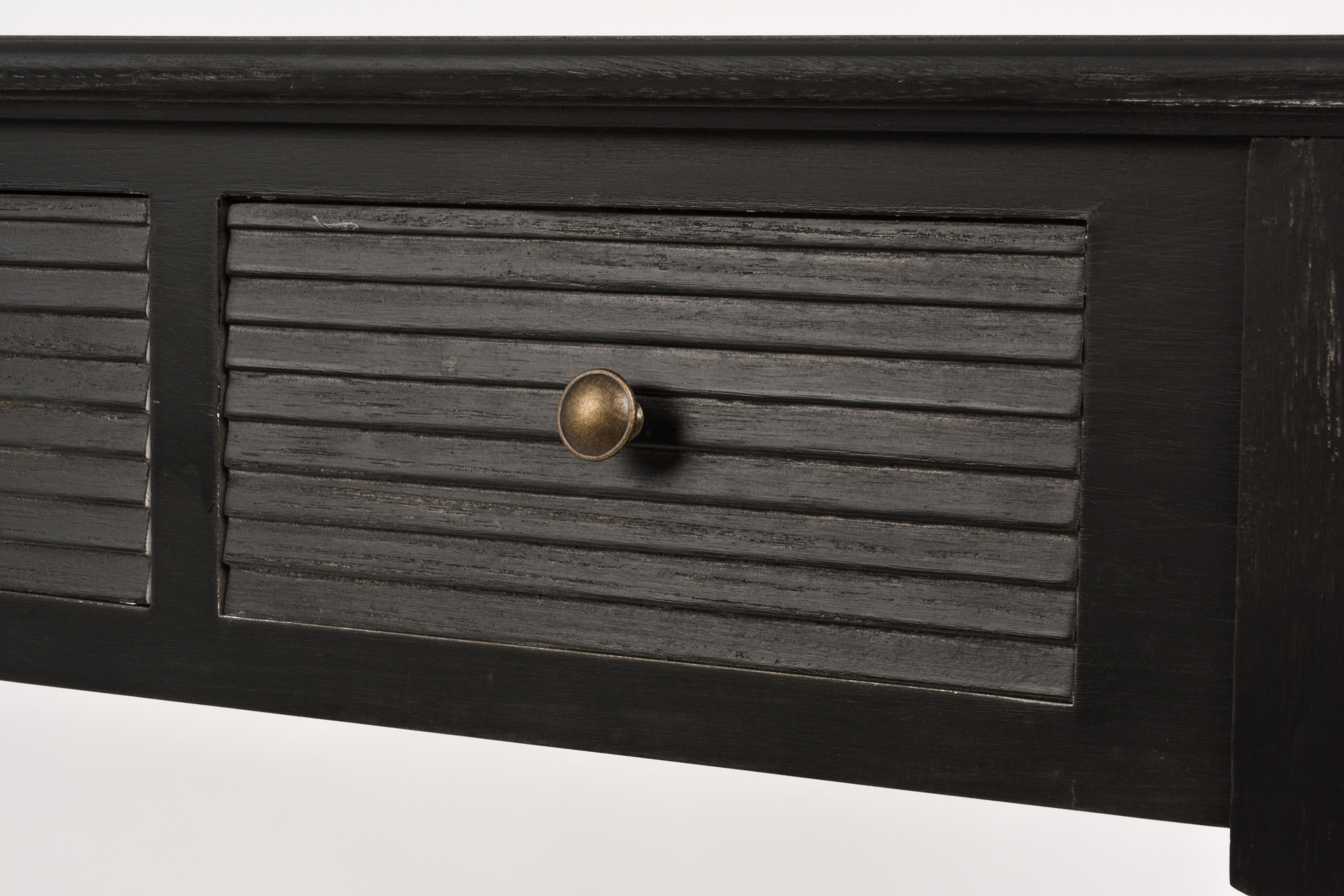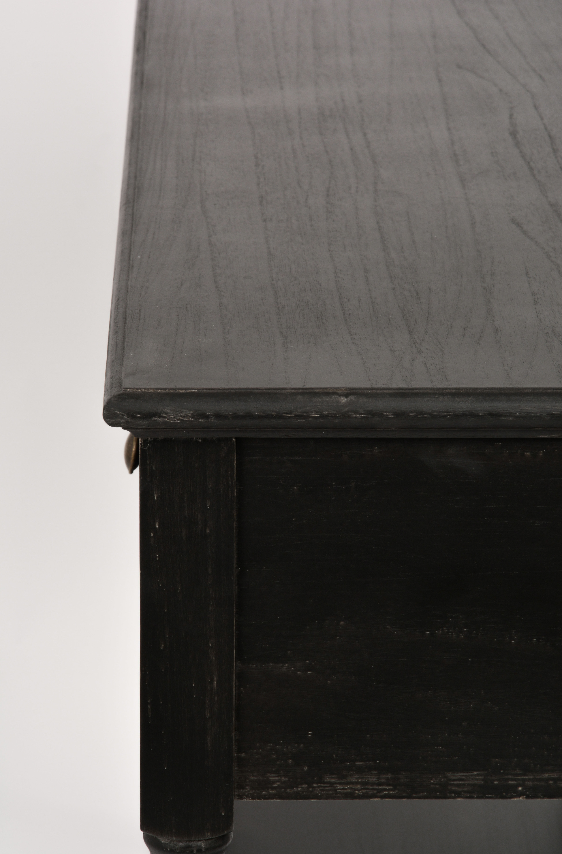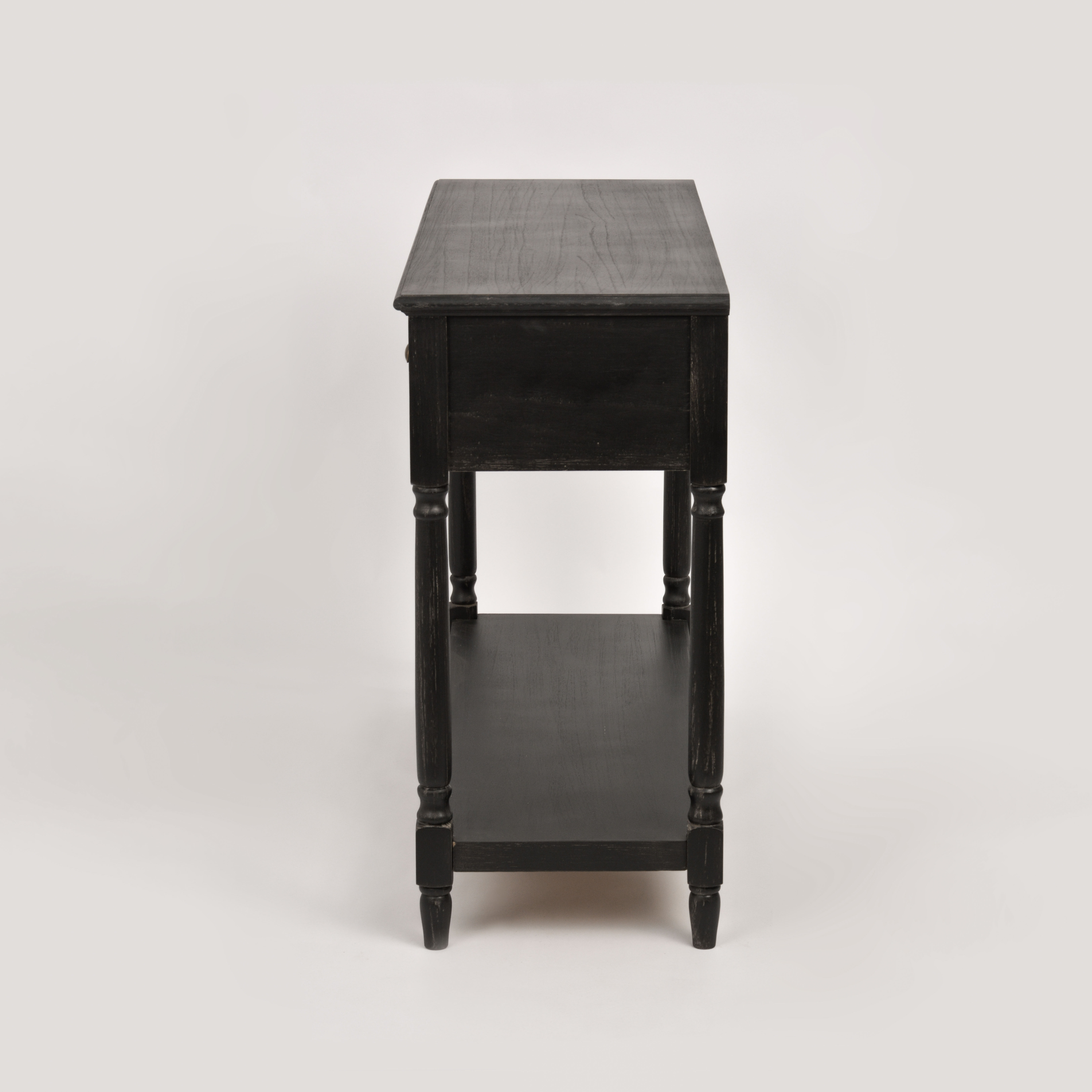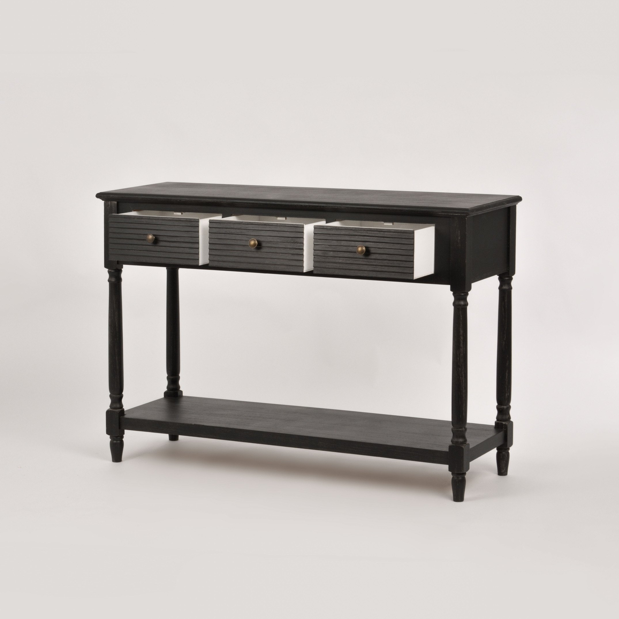 - Hand-painted console table features a Provençal, boho style. It features decorative brass-colored metal handles, milled drawer fronts, and turned legs. The uneven paint surface is distressed, revealing the wood grain.