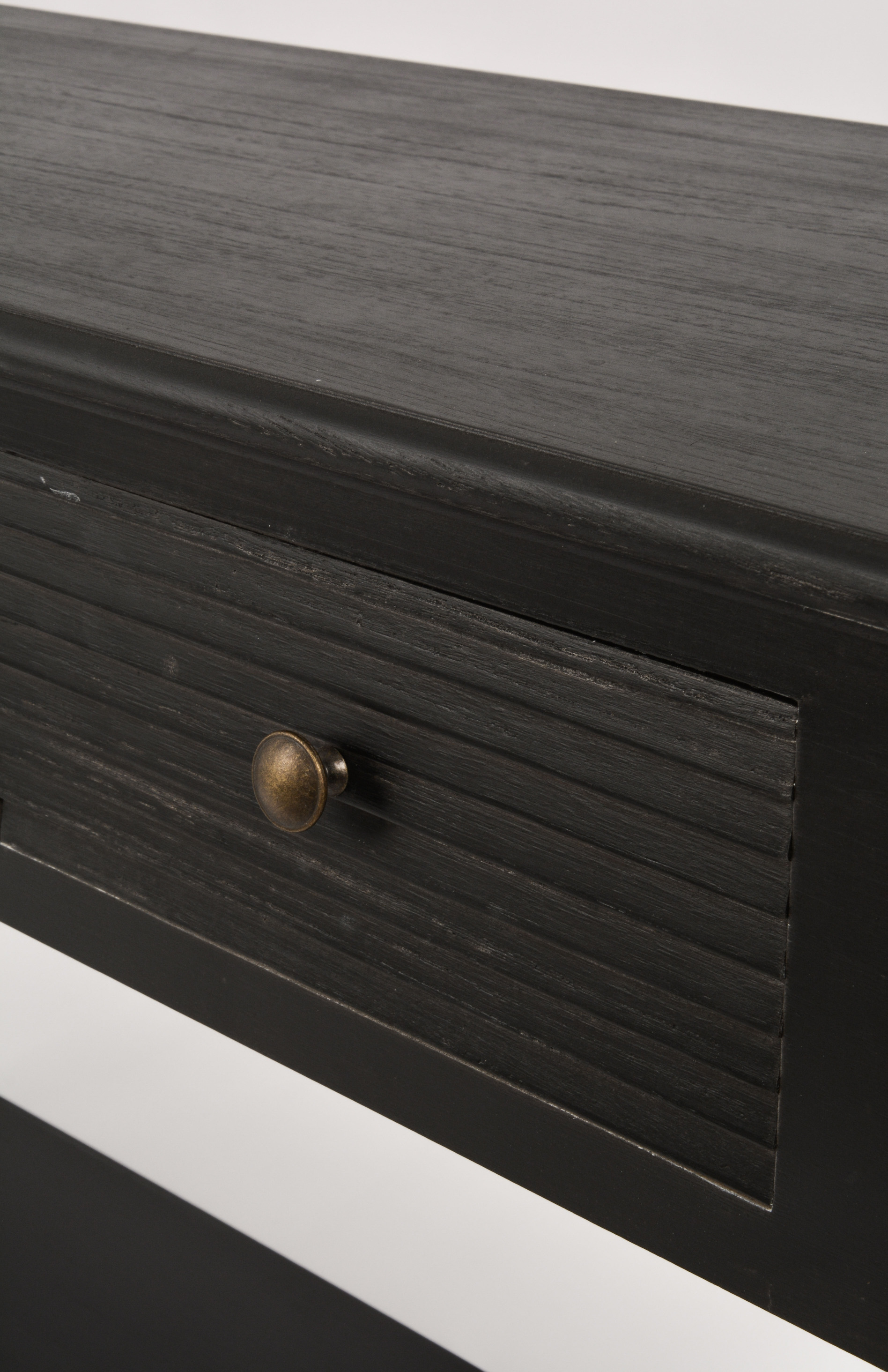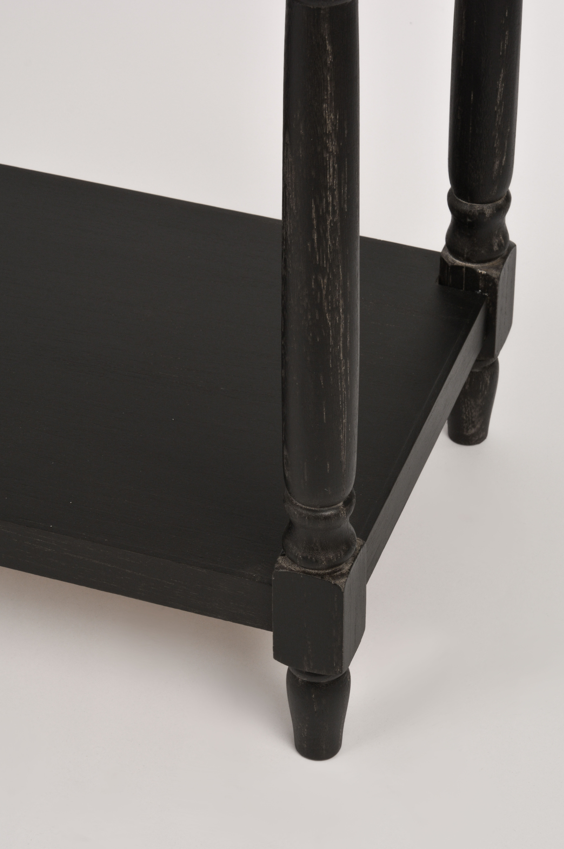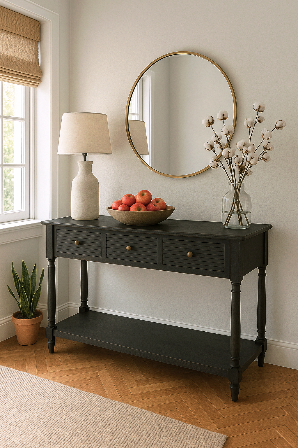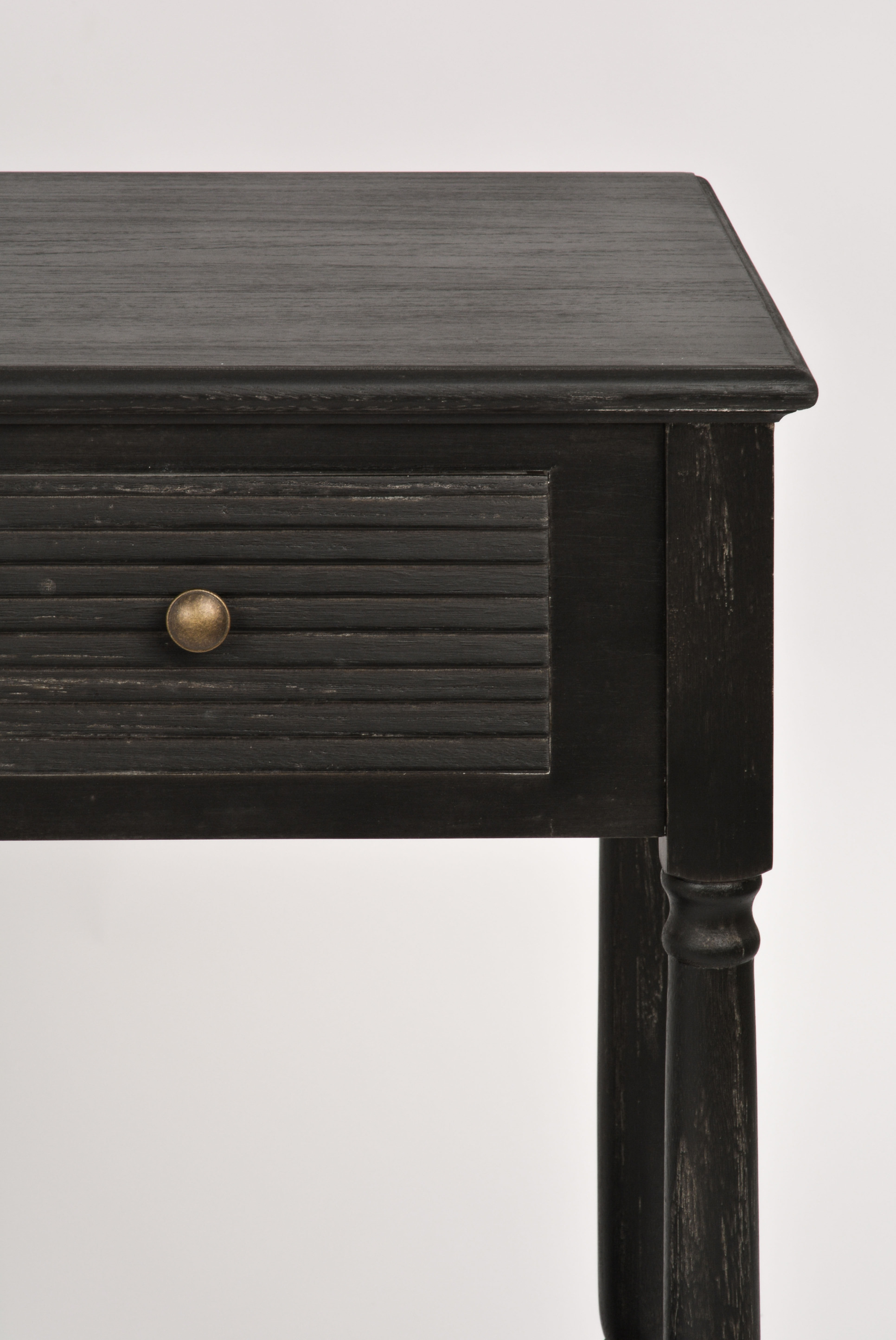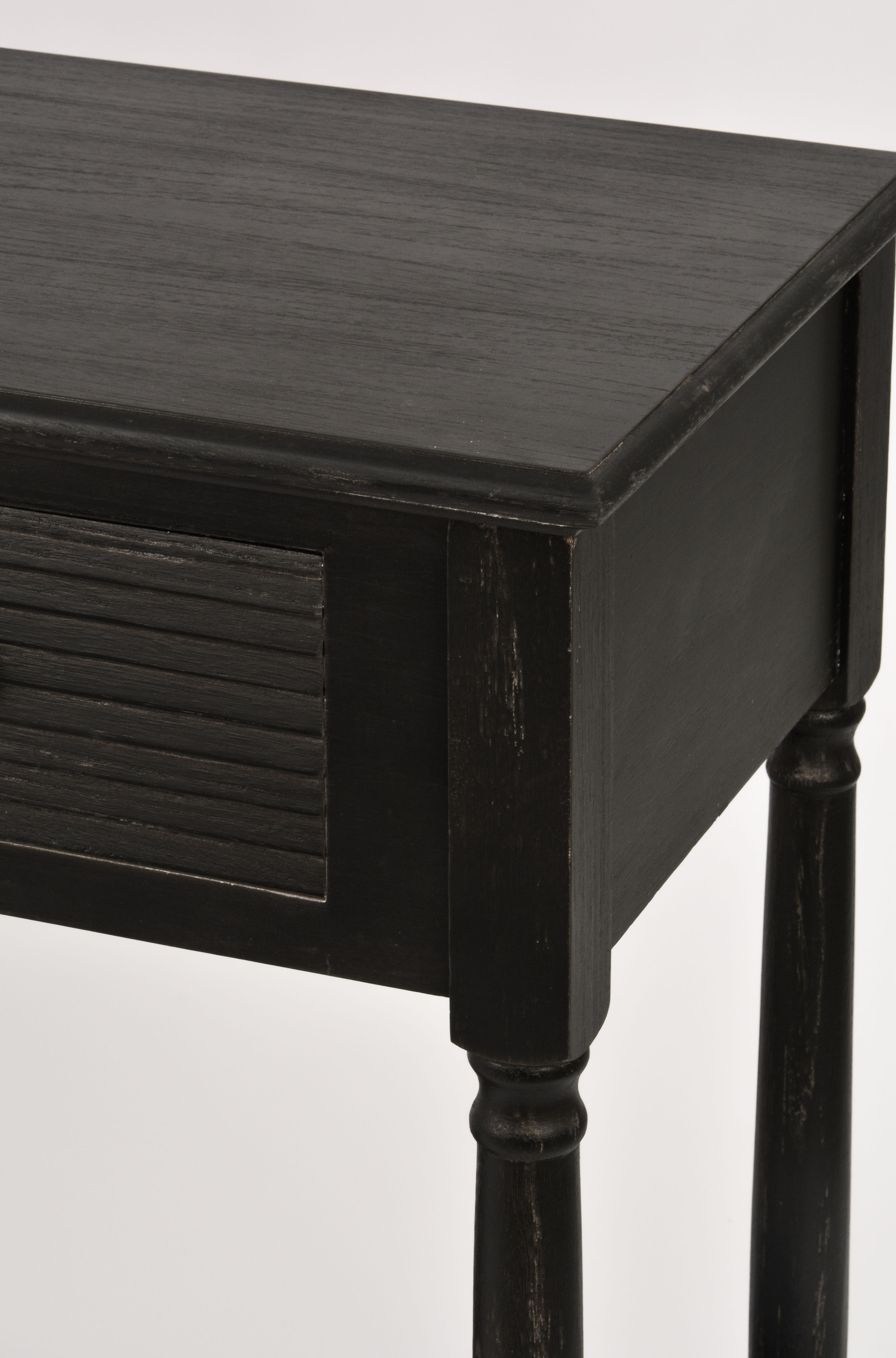 - Hand-painted console table features a Provençal, boho style. It features decorative brass-colored metal handles, milled drawer fronts, and turned legs. The uneven paint surface is distressed, revealing the wood grain.