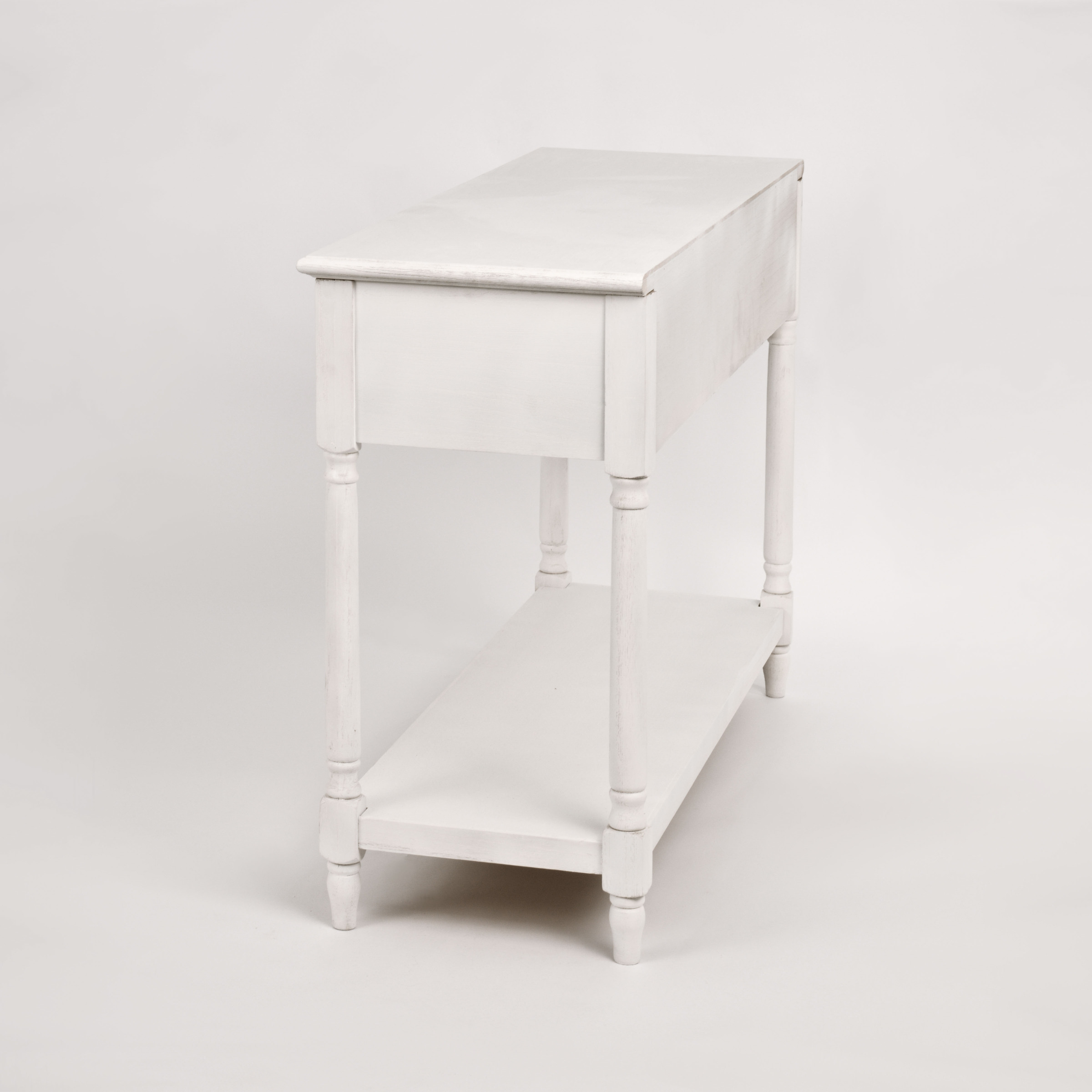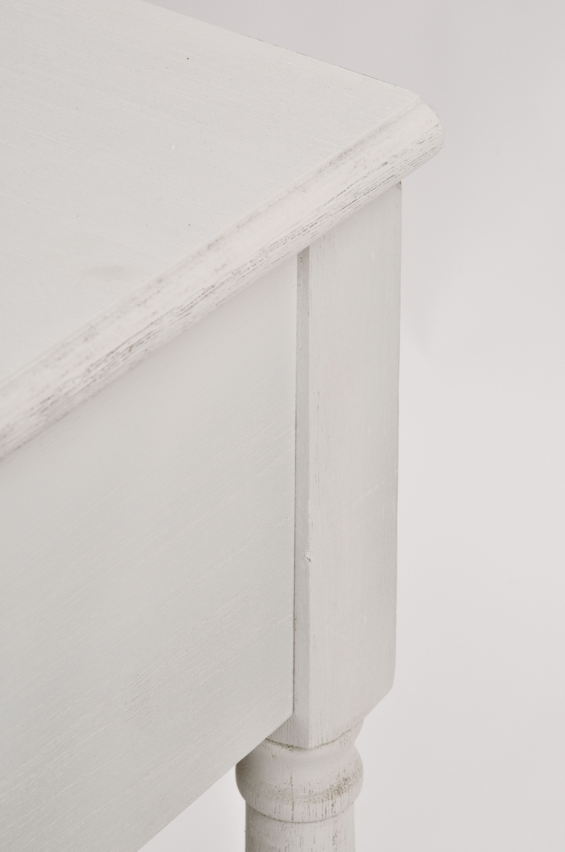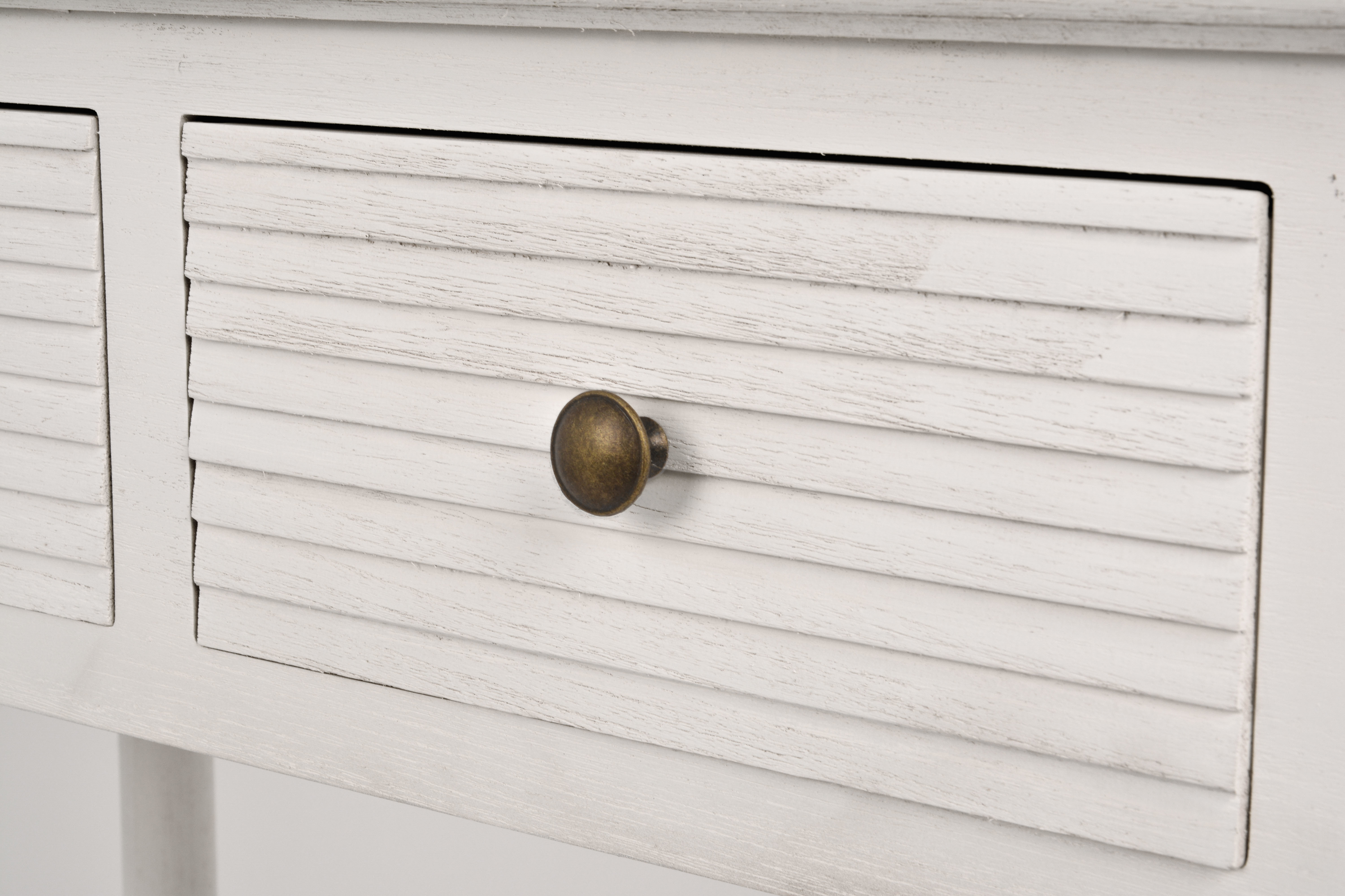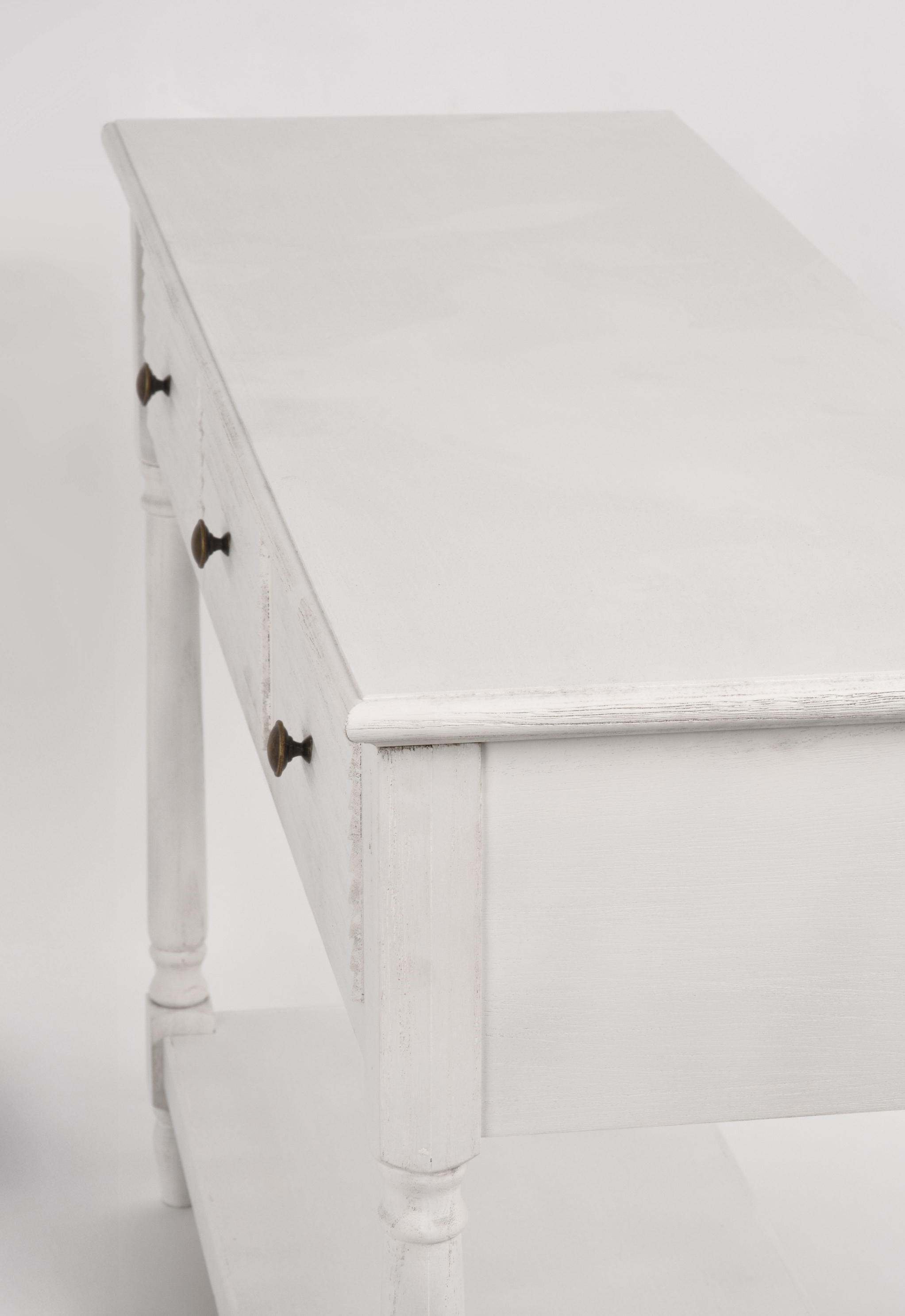- Hand-painted console table features a Provençal, boho style. It features decorative brass-colored metal handles, milled drawer fronts, and turned legs. The uneven paint surface is distressed, revealing the wood grain.