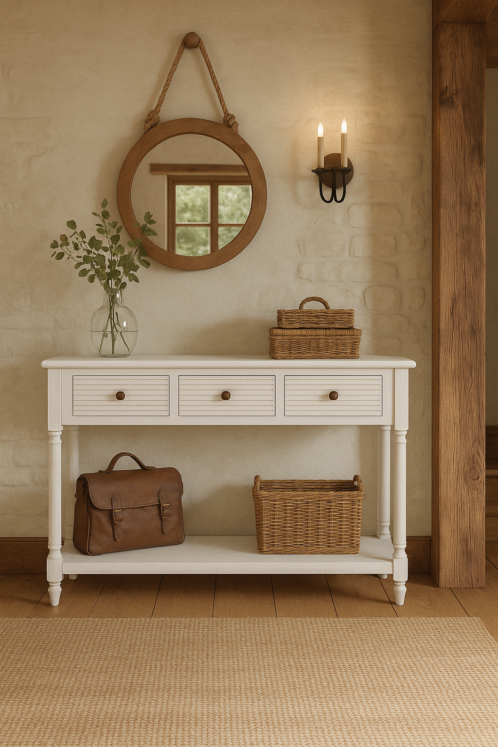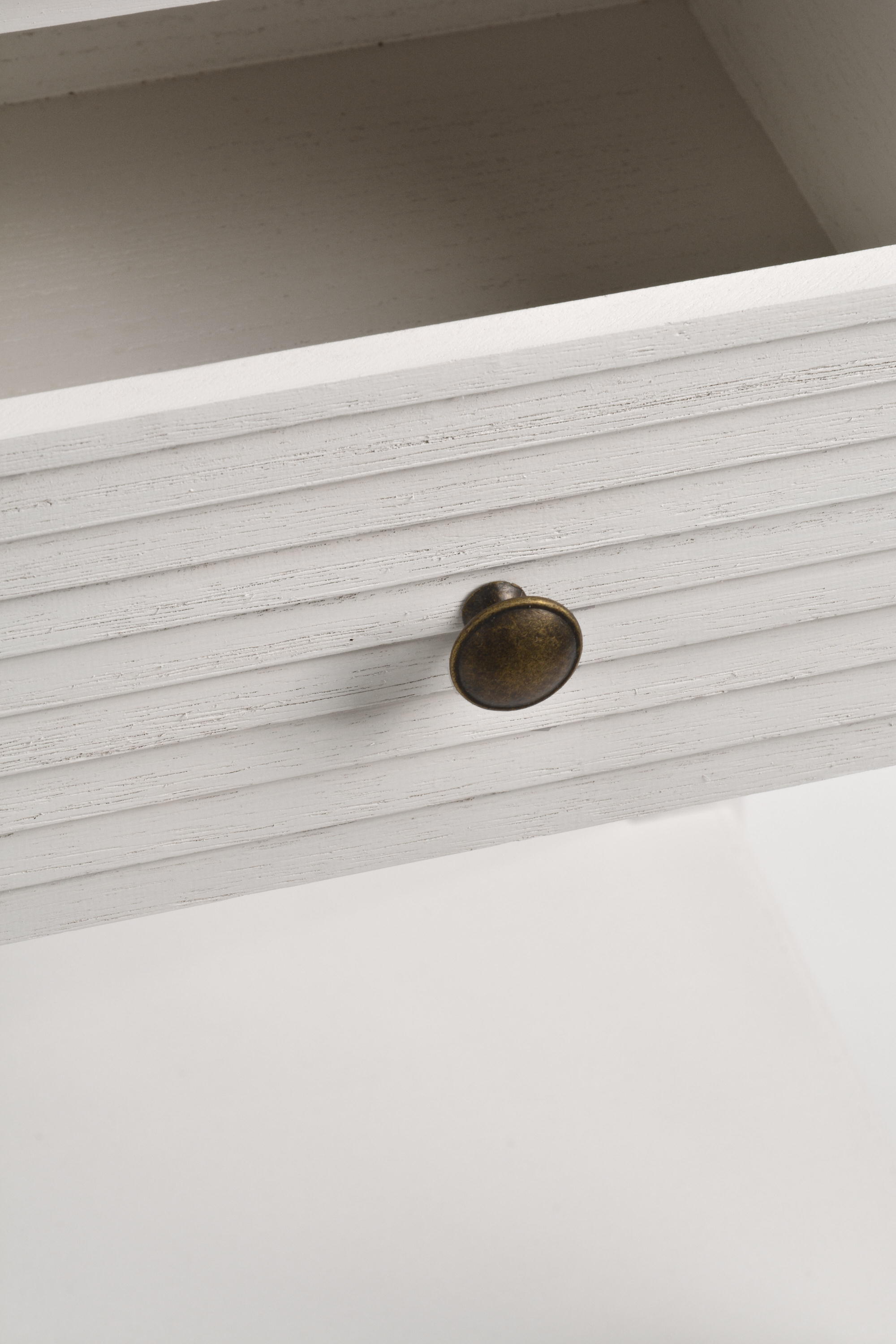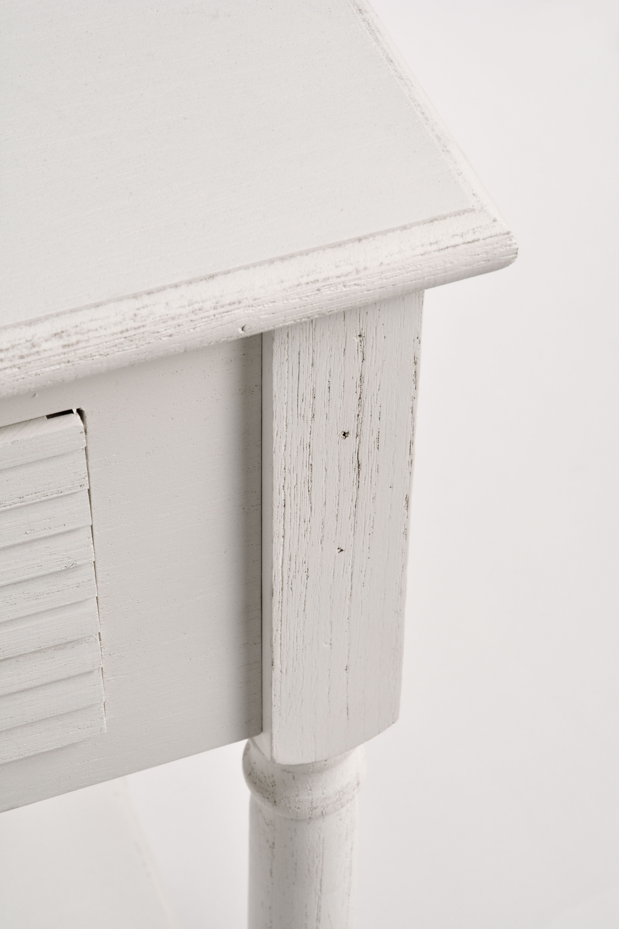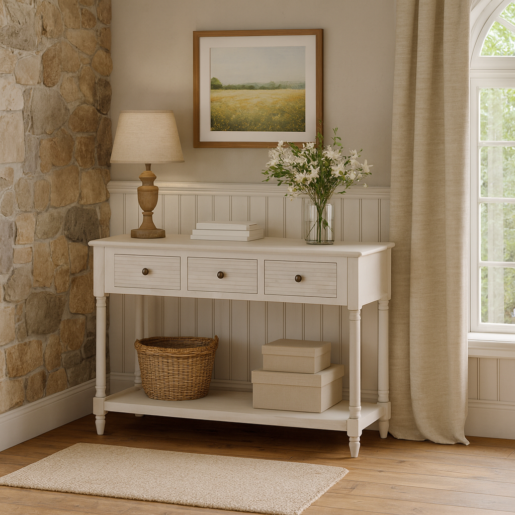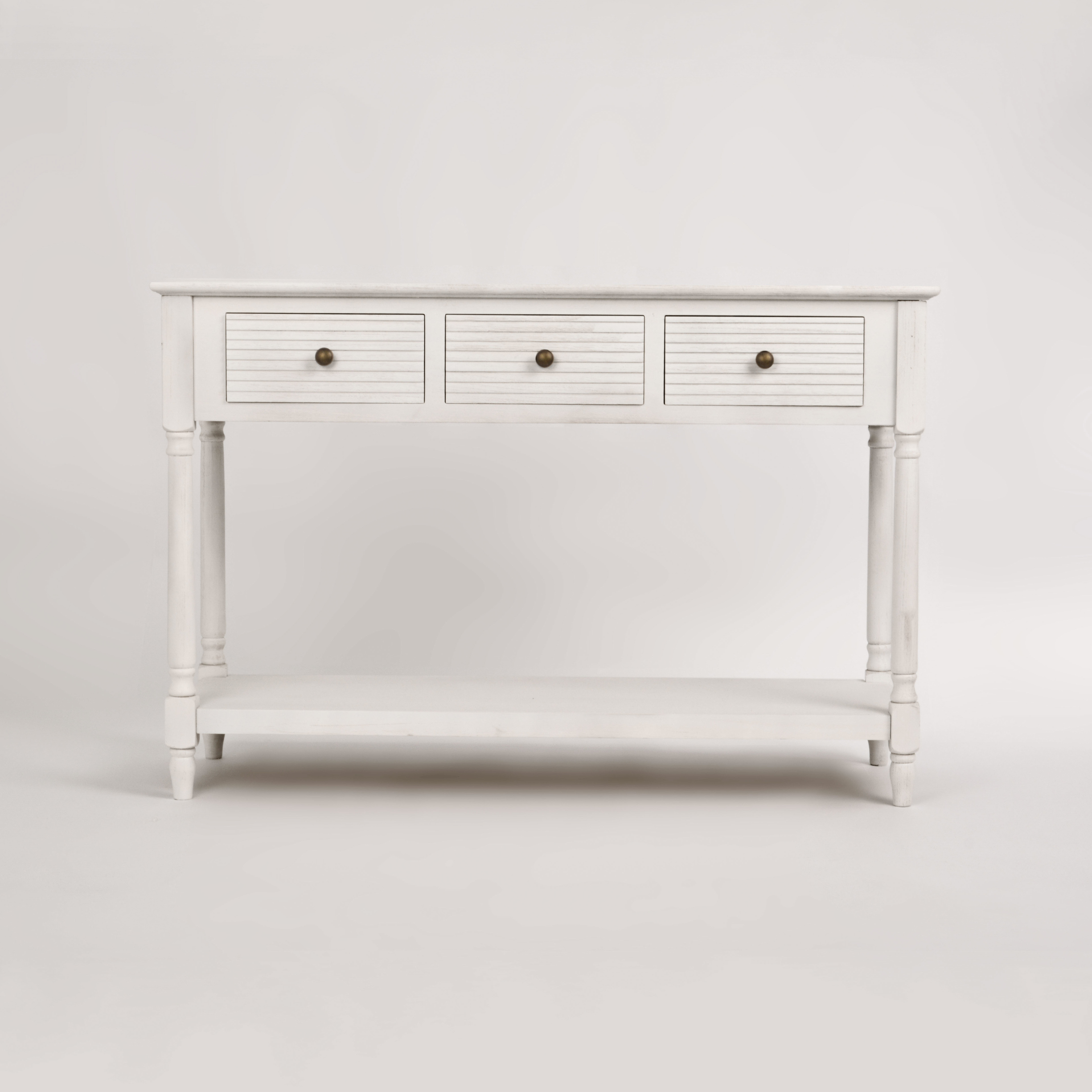 - Hand-painted console table features a Provençal, boho style. It features decorative brass-colored metal handles, milled drawer fronts, and turned legs. The uneven paint surface is distressed, revealing the wood grain.