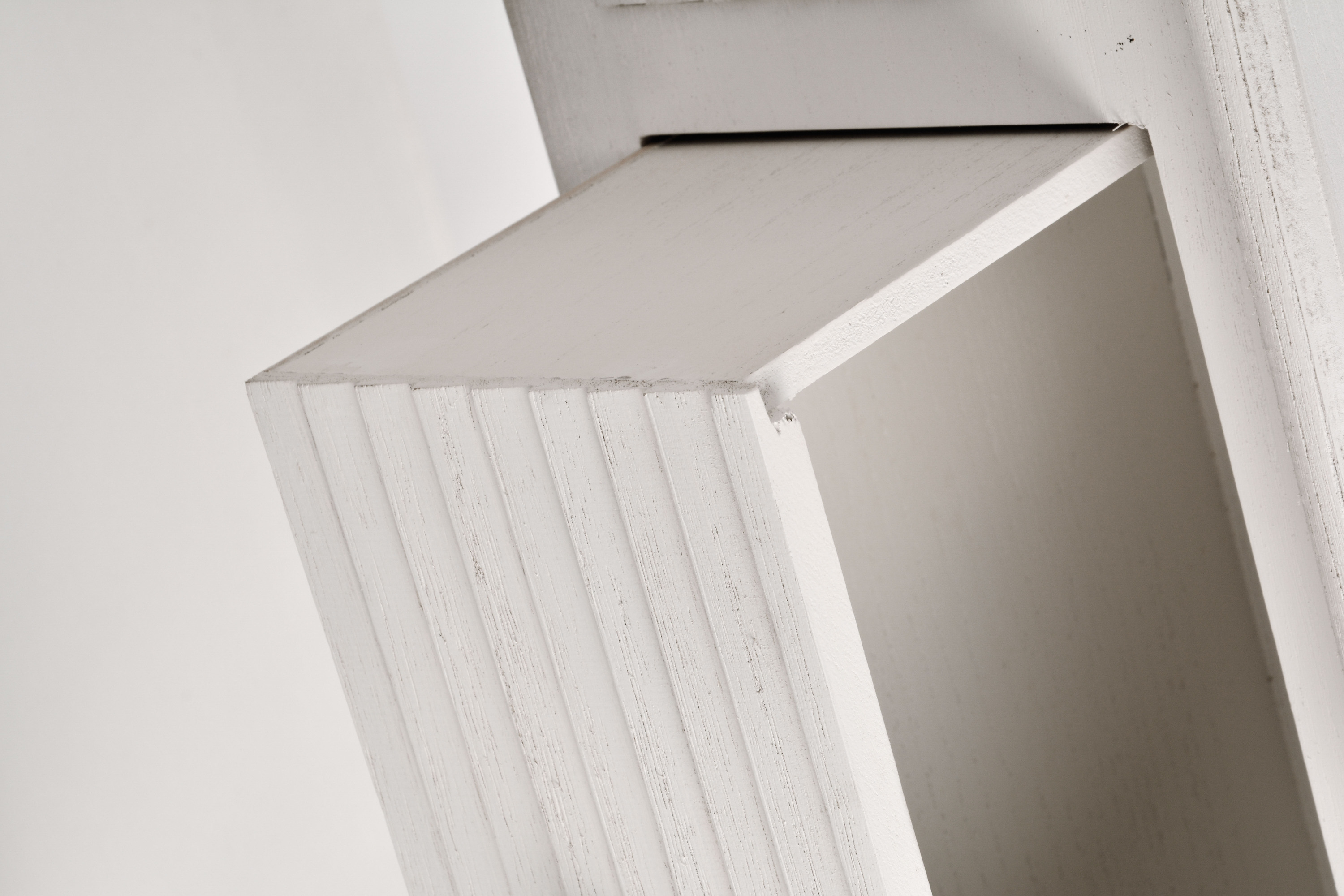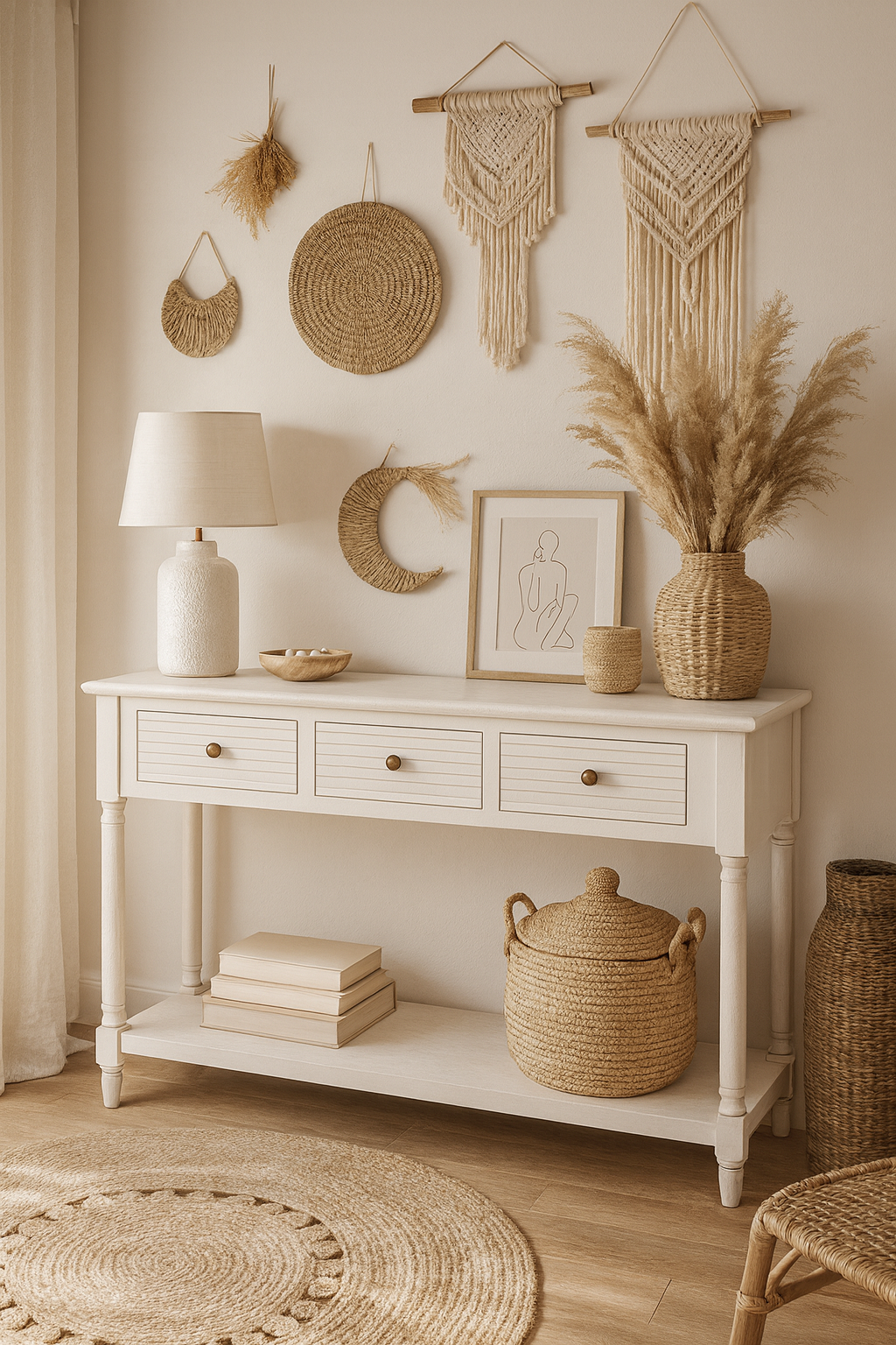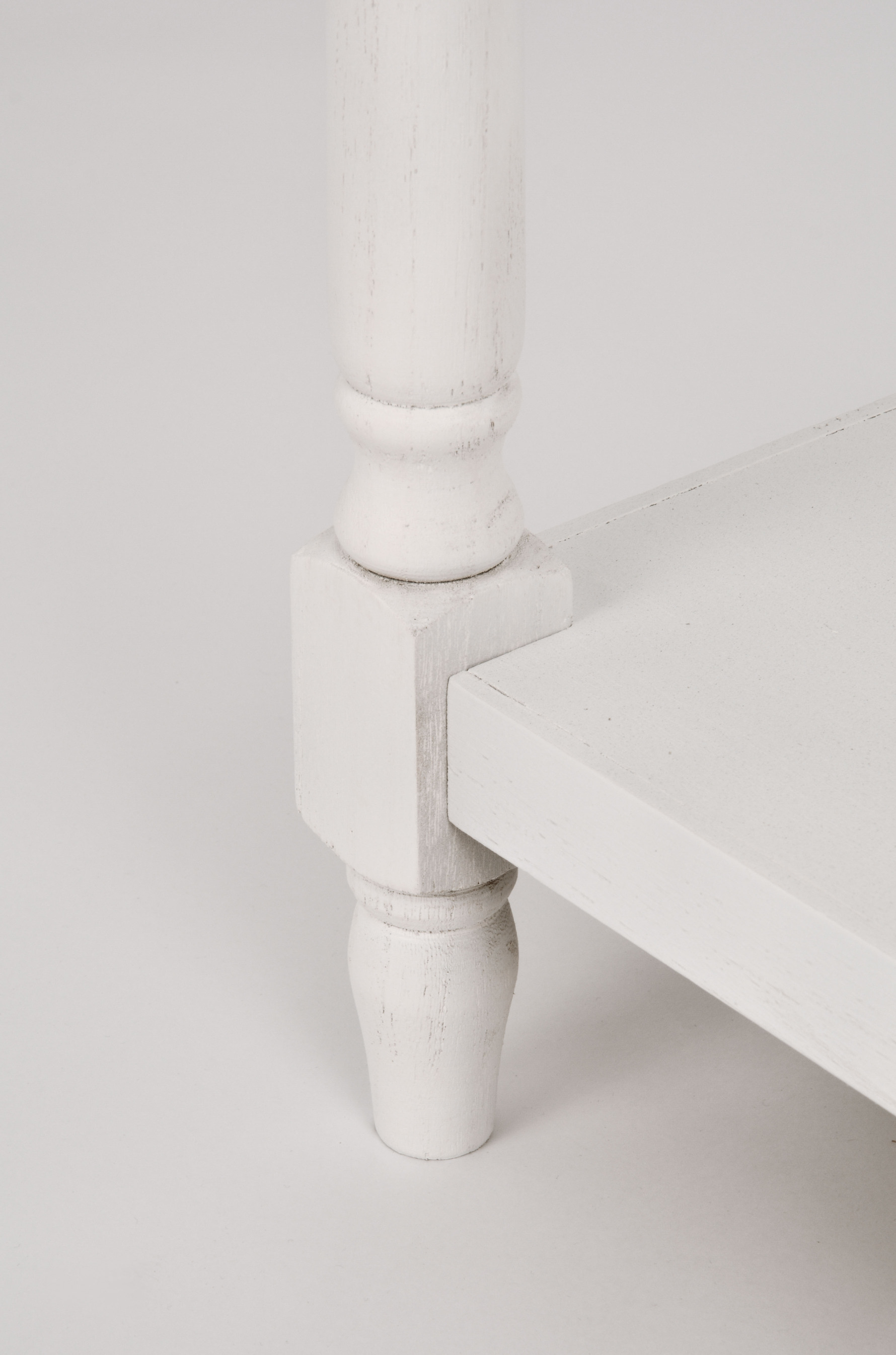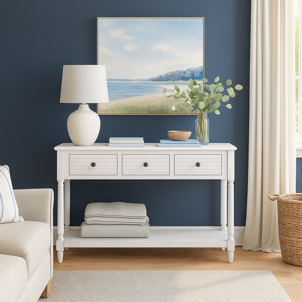 - Hand-painted console table features a Provençal, boho style. It features decorative brass-colored metal handles, milled drawer fronts, and turned legs. The uneven paint surface is distressed, revealing the wood grain.