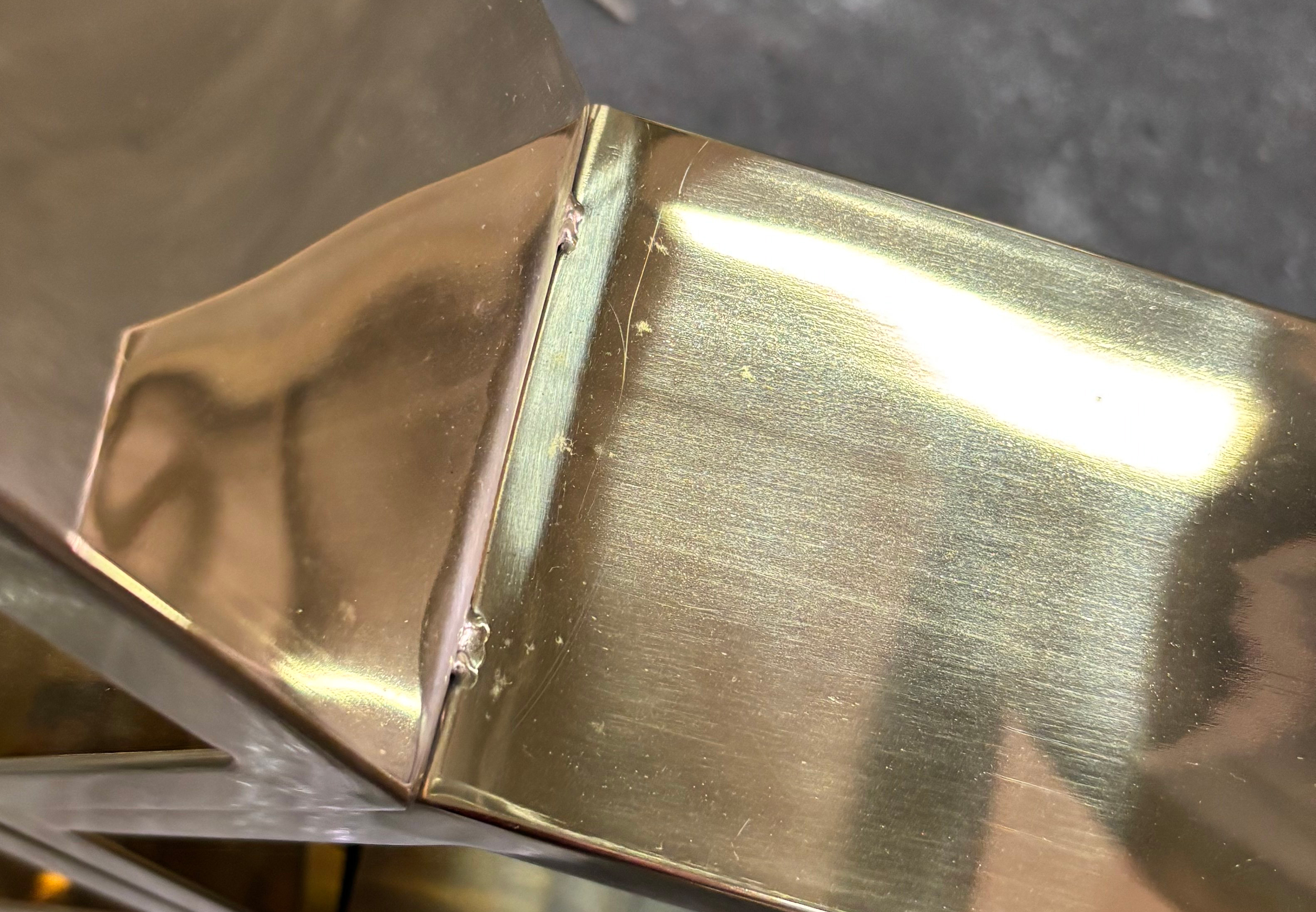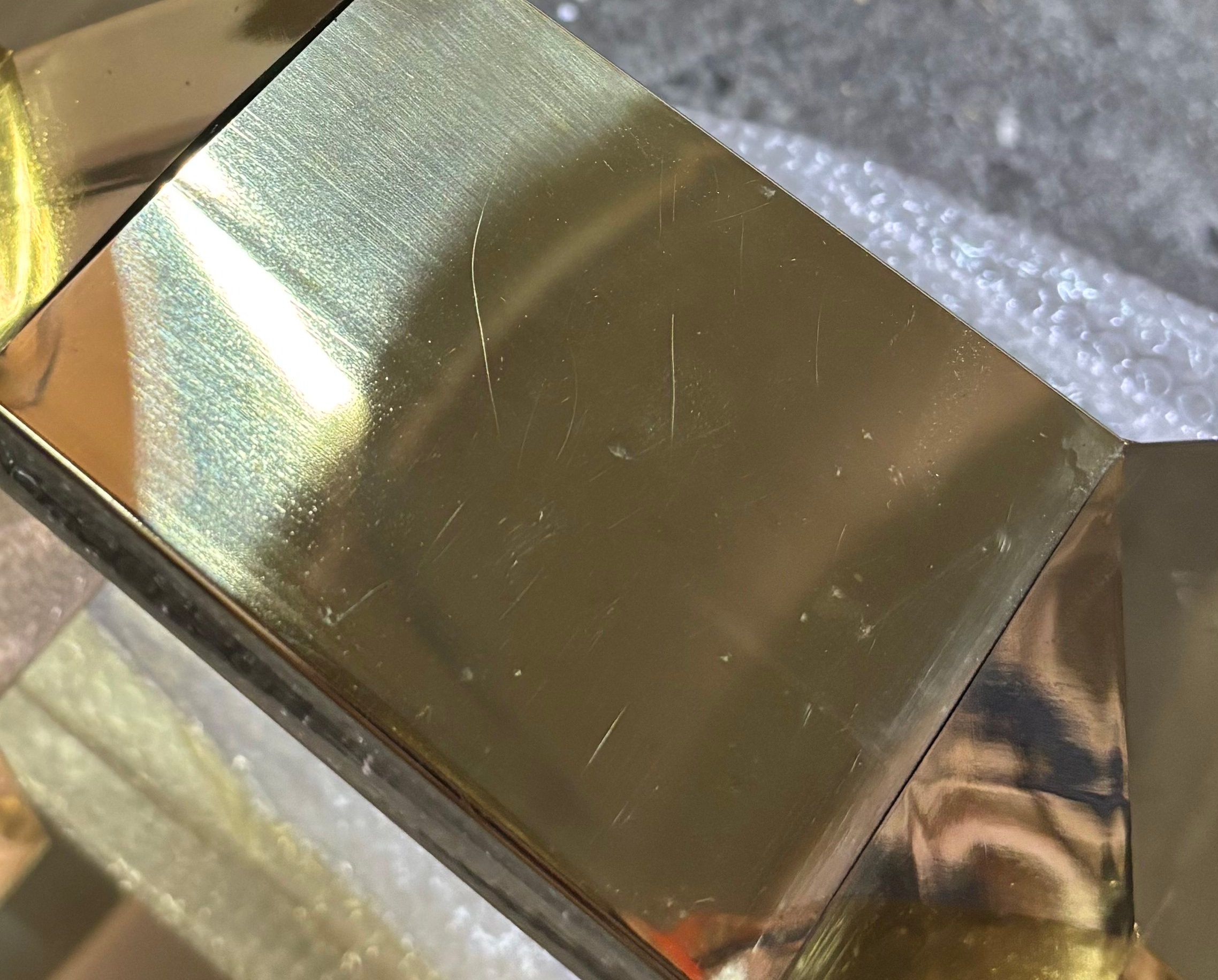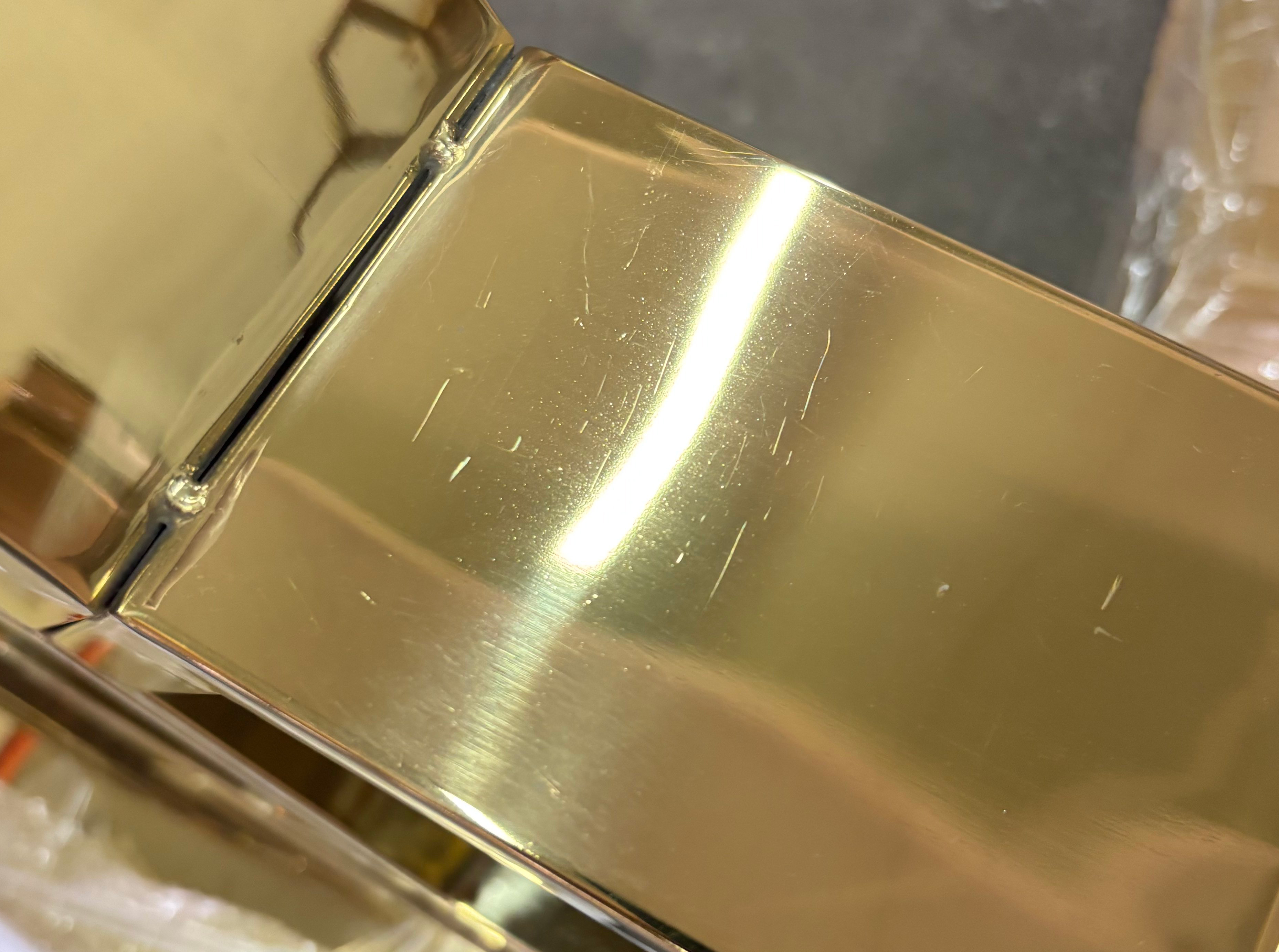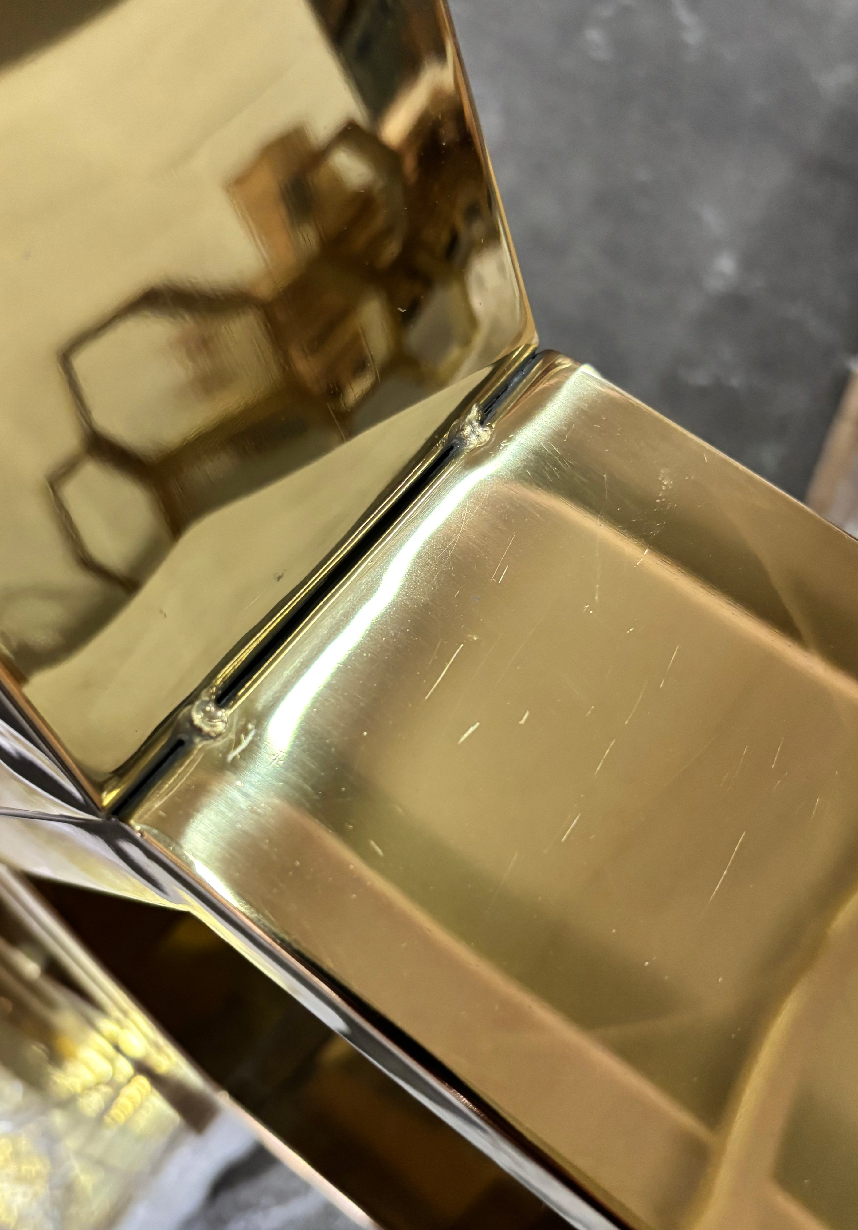 - The gold foil has scratches across the entire surface of the steel base, and the top has visible abrasions. The welds are uneven in places.