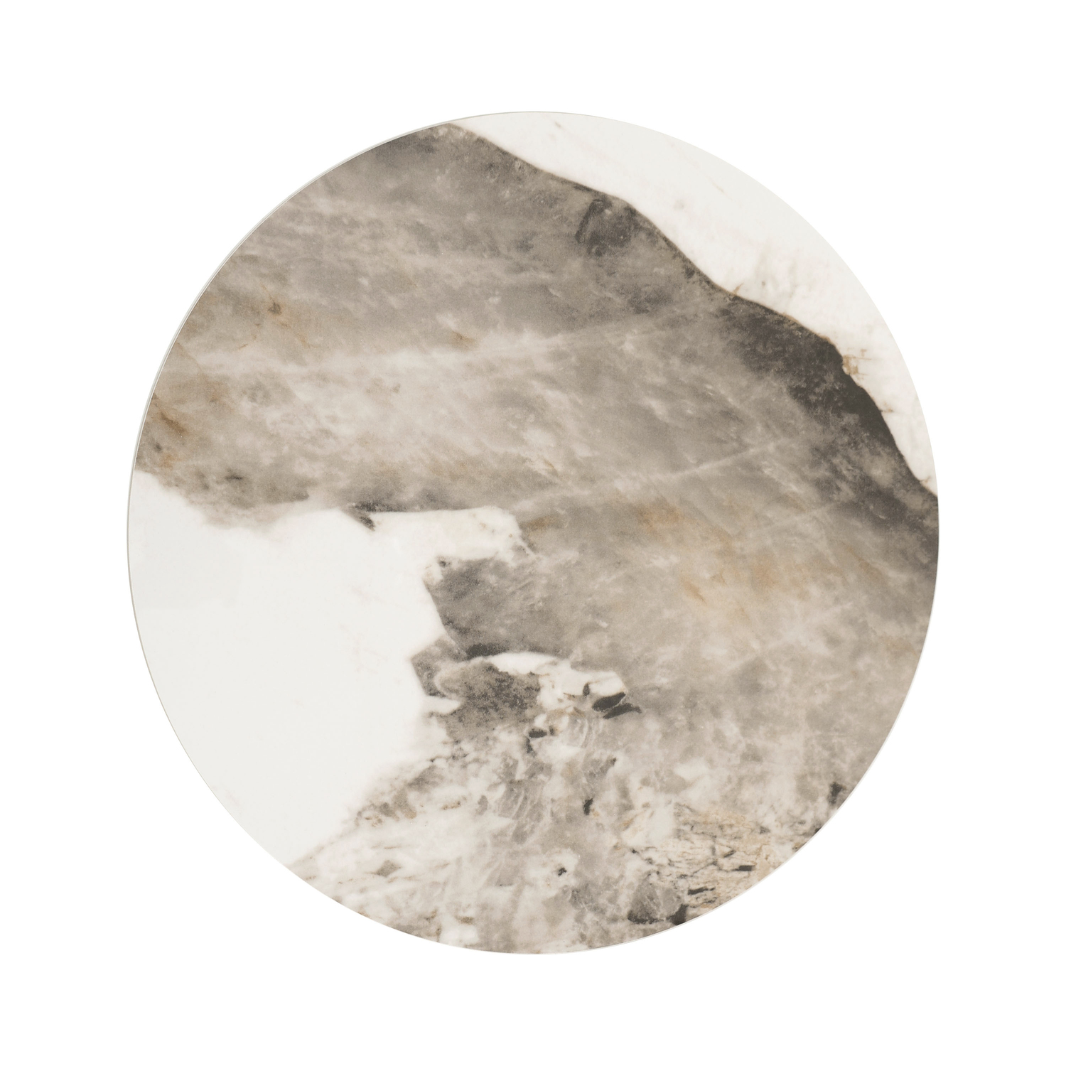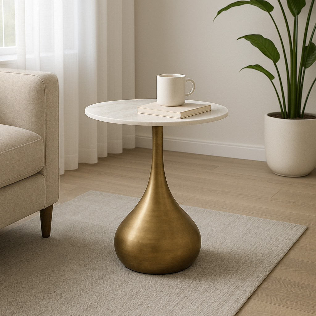 - A minimalist coffee table with a painted and brushed gold base. The round white tabletop imitates marble. Its modern design perfectly complements the white marble and gold.