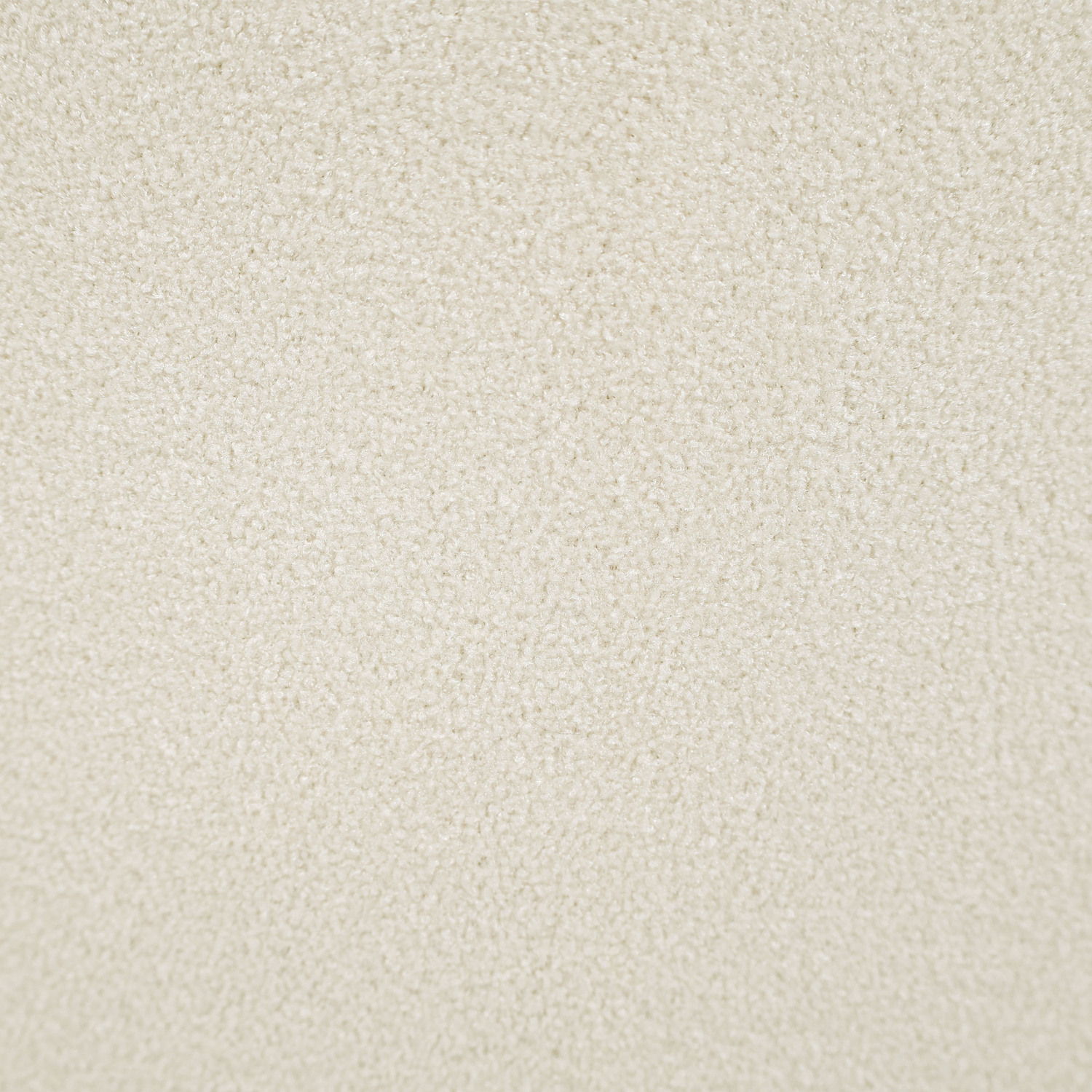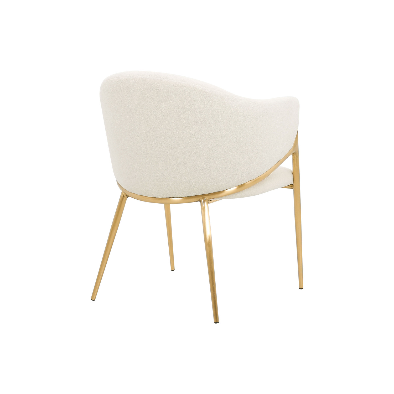 - This glamorous upholstered chair features a gold, asymmetrical frame and brushed stainless steel legs, paired with a soft, pearly white bouclé fabric with shimmering silver threads, adding a touch of elegance to any dining room.