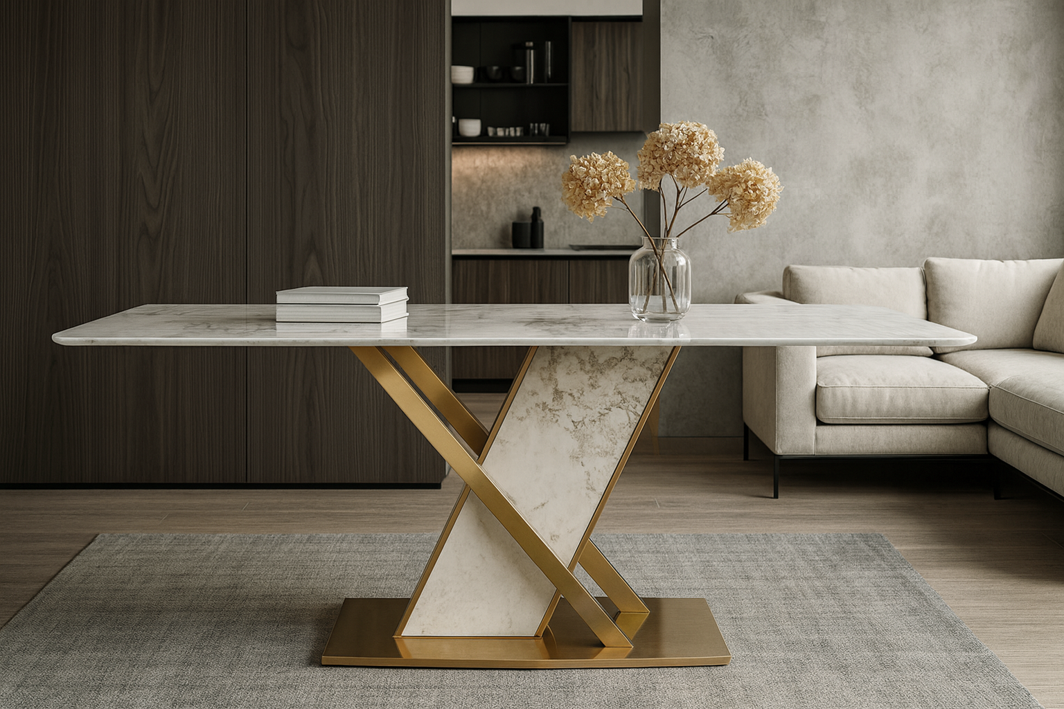 - Modern table with an X-shaped base made of white imitation marble and gold stainless steel. The rectangular white top has a pattern imitating marble.