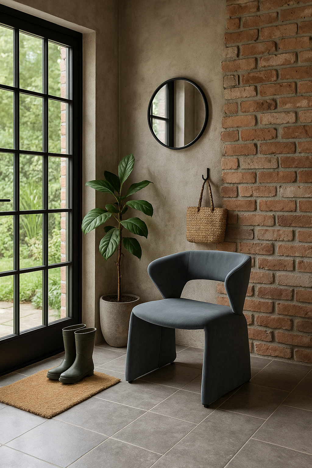 - A modern upholstered chair in graphite color with velvet fabric. The minimalist, geometric form and careful finishing allow the product to fit into any interior.