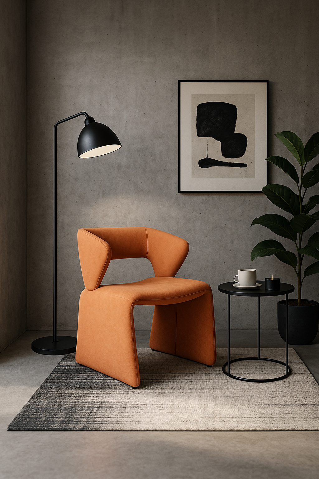 - A modern upholstered chair in orange with velvet fabric. The minimalist, geometric form and careful finishing allow the product to fit into any interior.