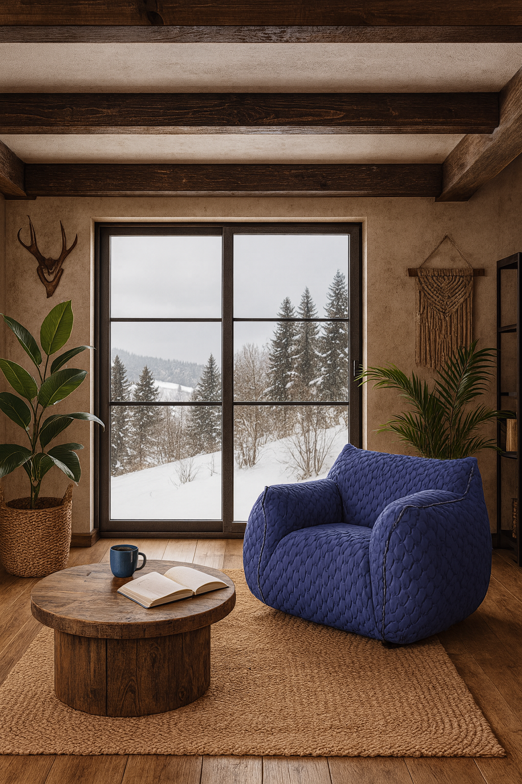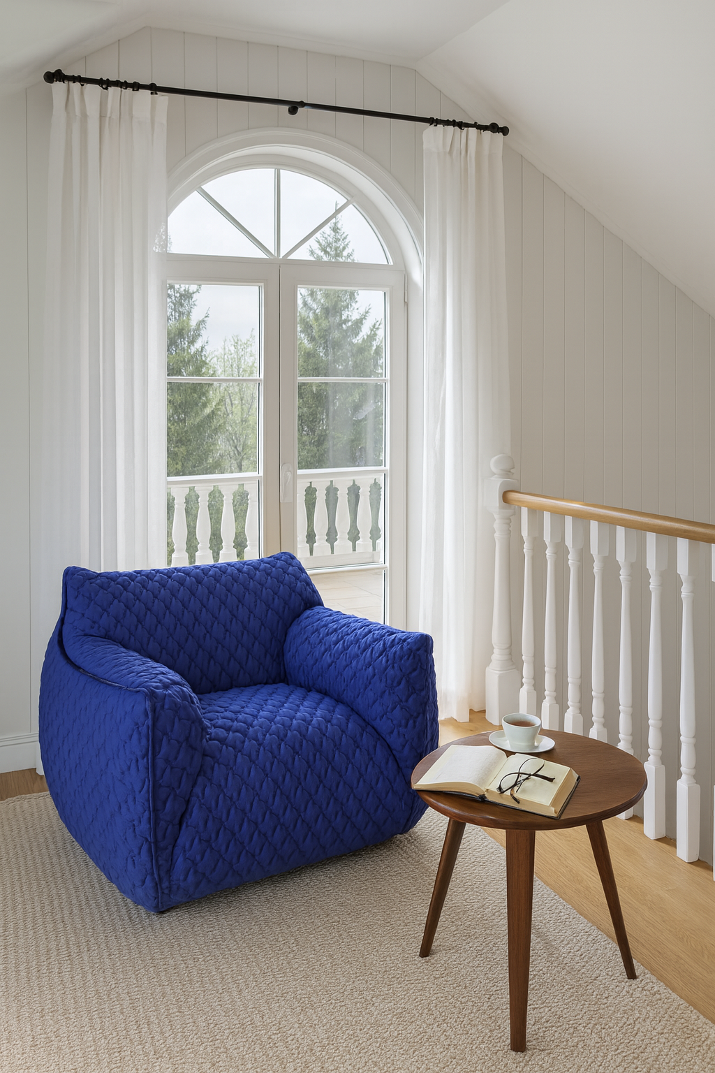 - A modern, large, oval armchair. The elastic blue fabric has quilting in the shape of four-pointed stars. The lounge chair is a combination of a simple form with soft sponge filling and an original material structure.