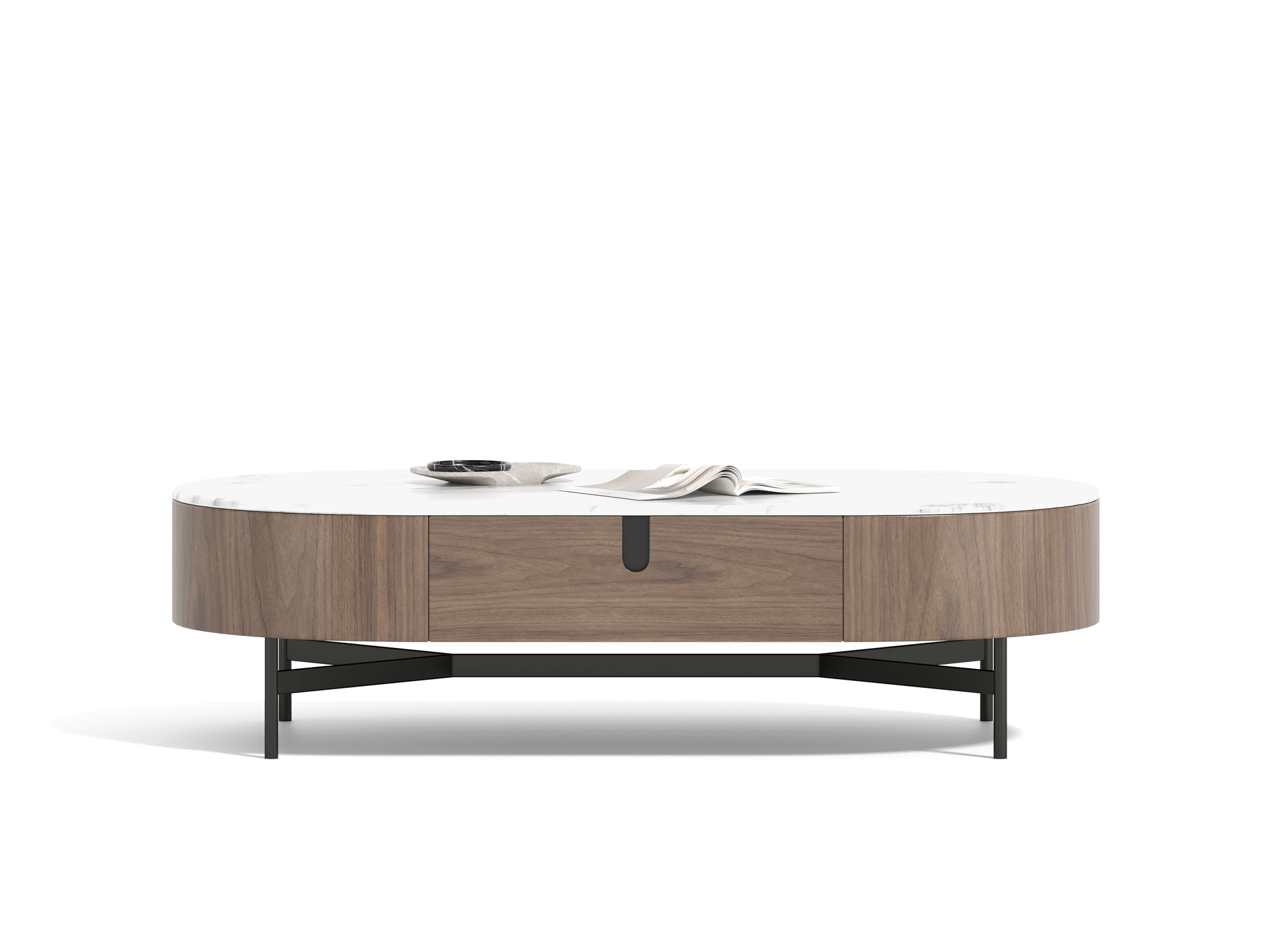 - A modern walnut-colored coffee table with visible wood grain. The tabletop is made of natural white marble. The streamlined shape is accentuated by arched details.