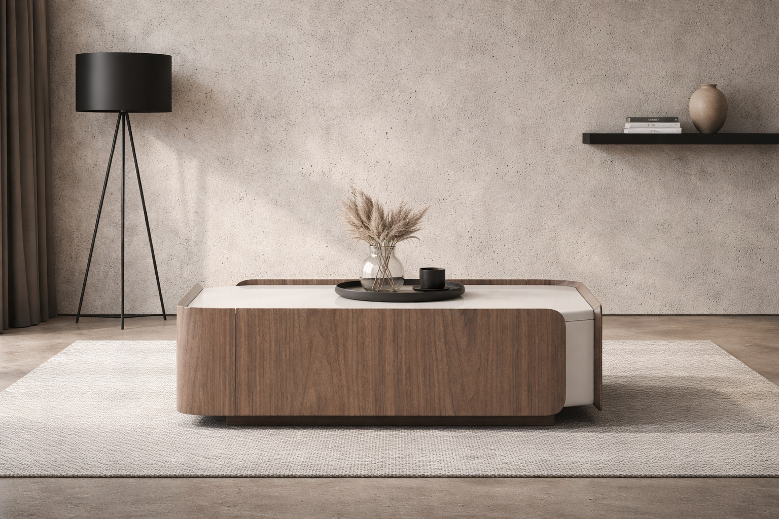 - A minimalist coffee table in cashmere and walnut with a visible wood grain. The body has rounded sides and rounded front edges.