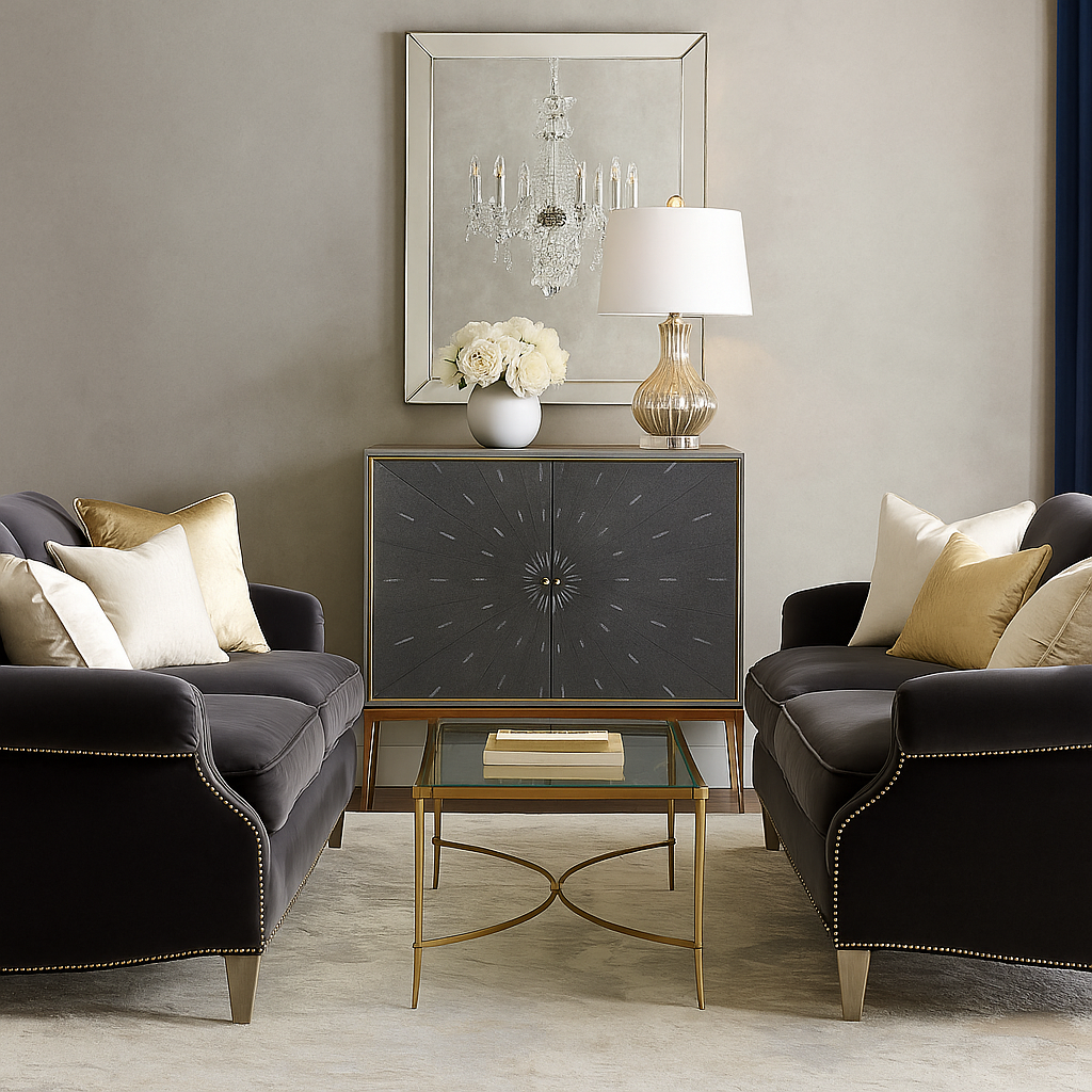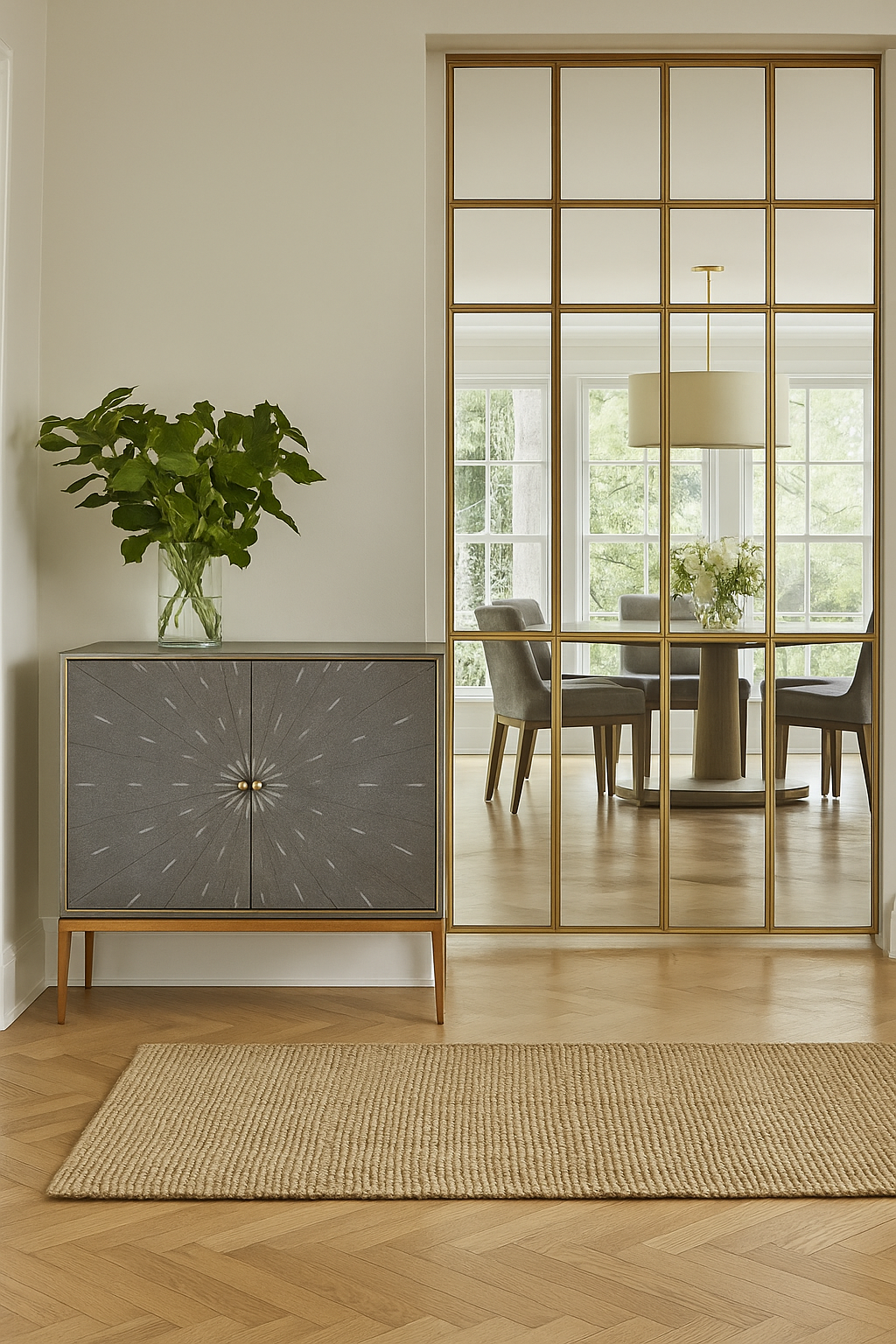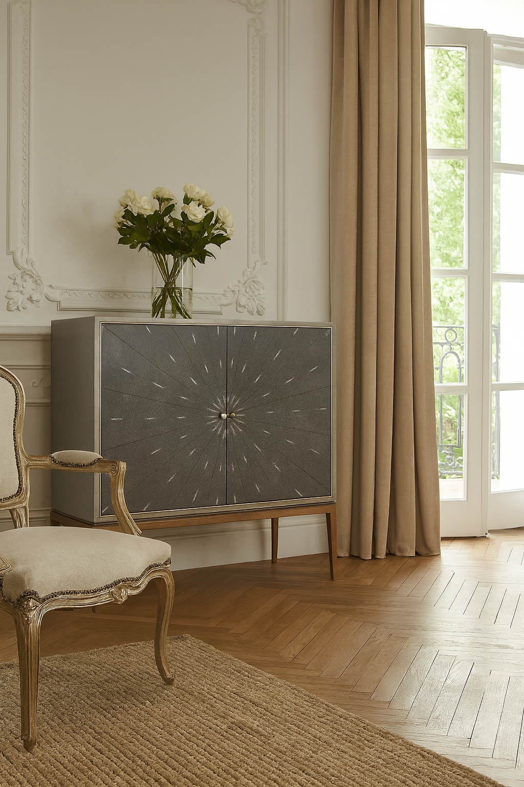 - Original grey sideboard with gold accents in the form of handles, legs and decorative strip around the door. The body is covered with veneer with a visible wood structure and the doors have faux shagreen with a pattern.