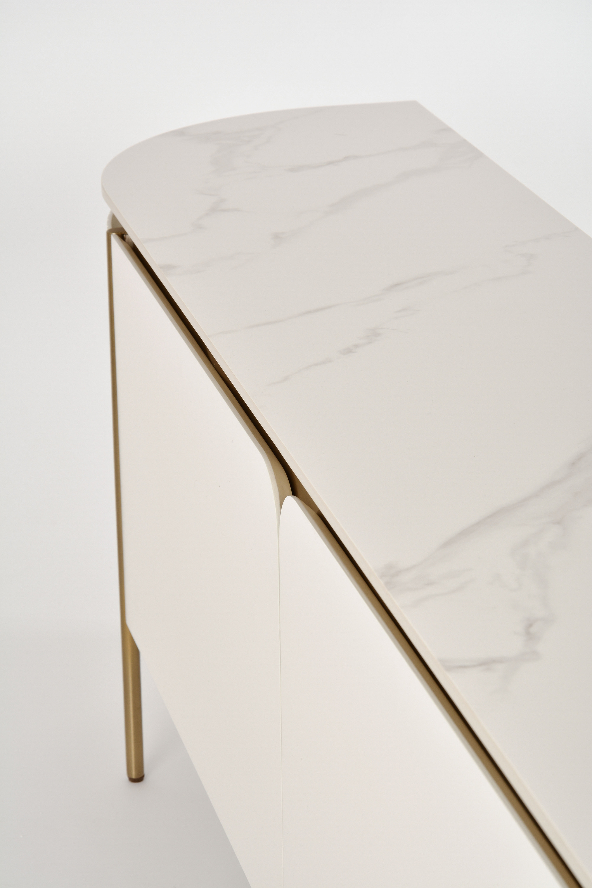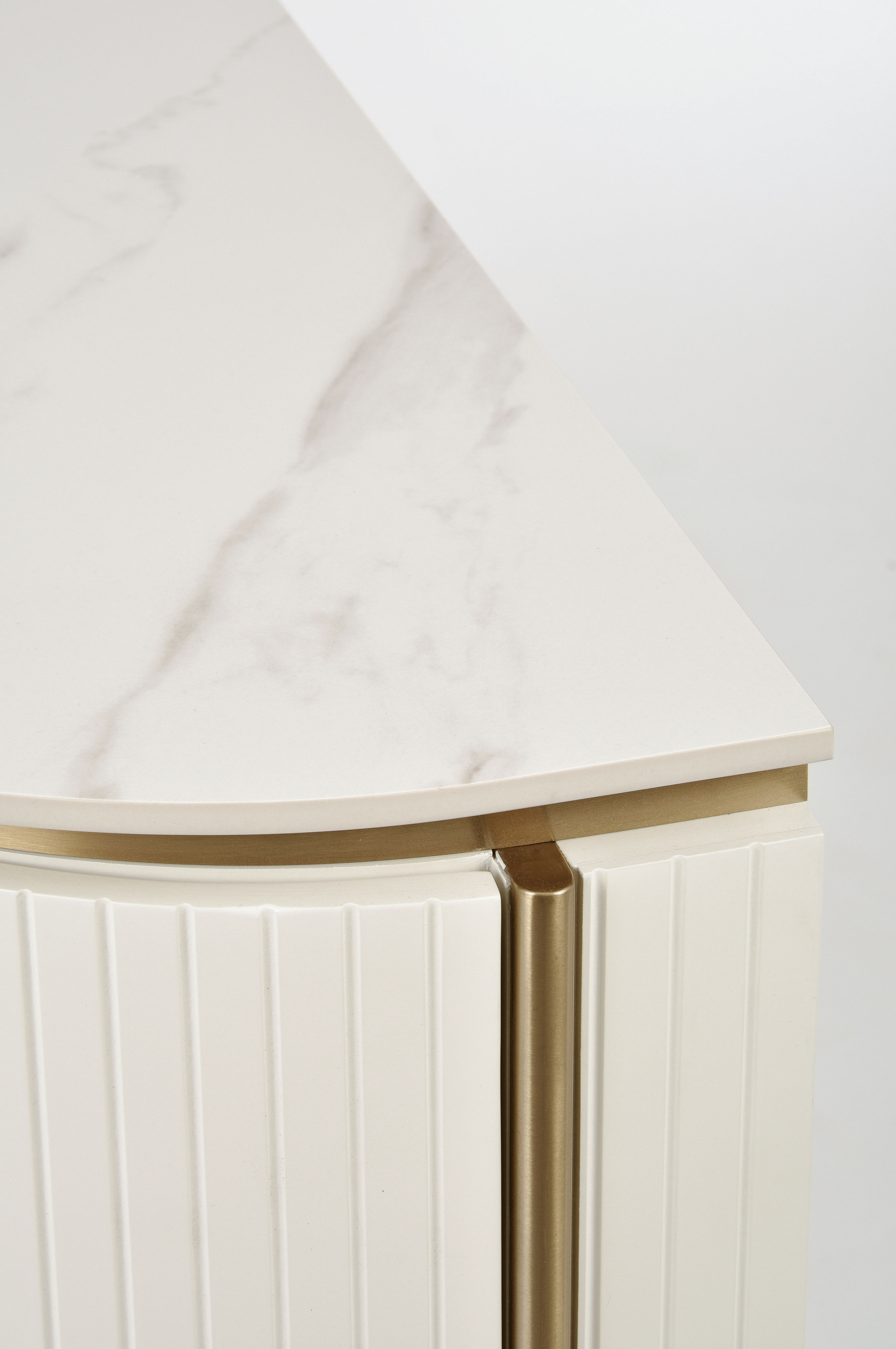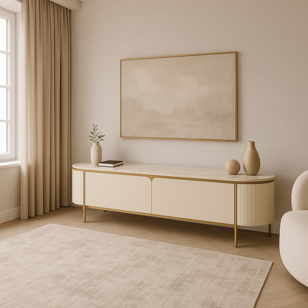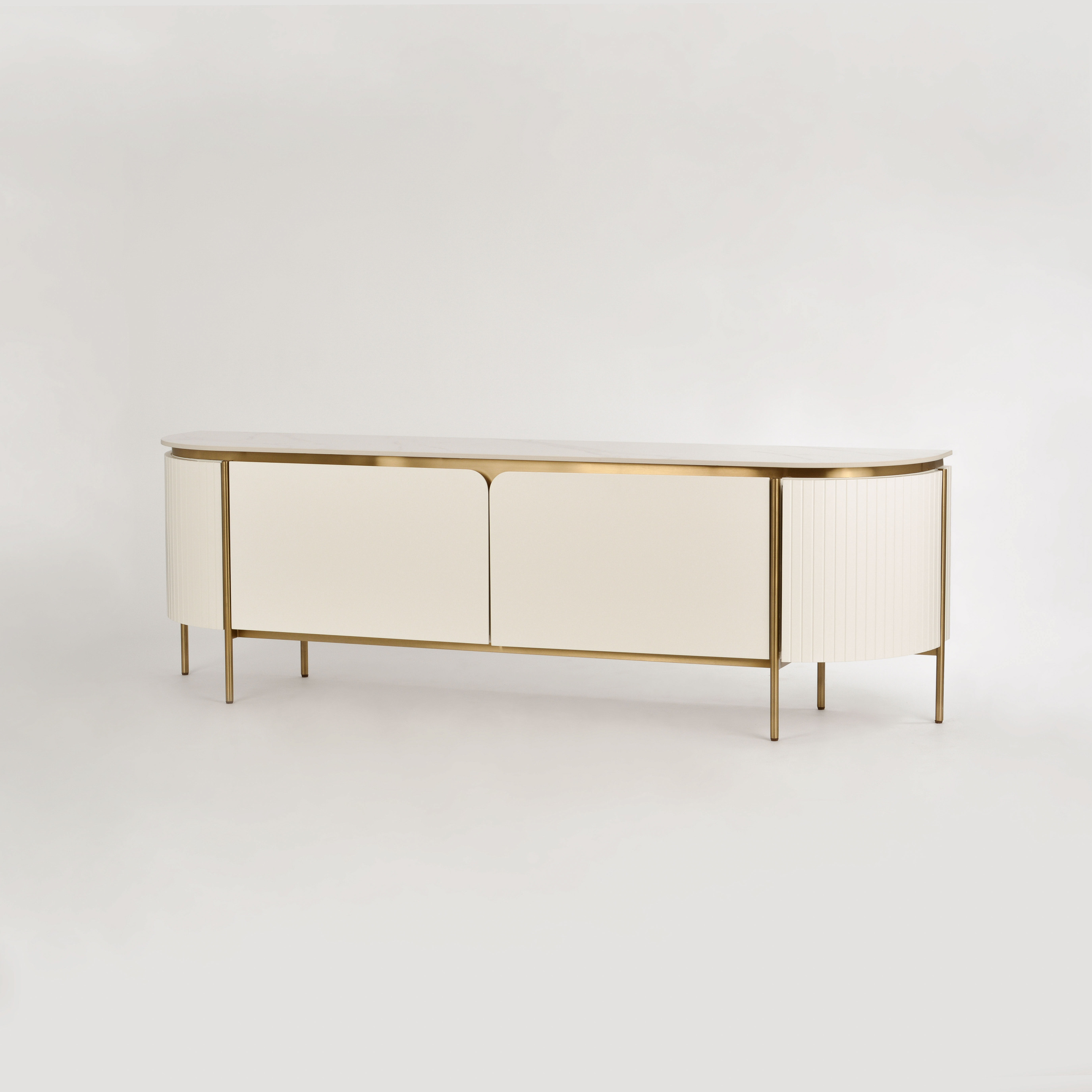 - Stylish white ecru TV cabinet with gold accents and legs. The body has grooved wood. The countertop has a marble finish.