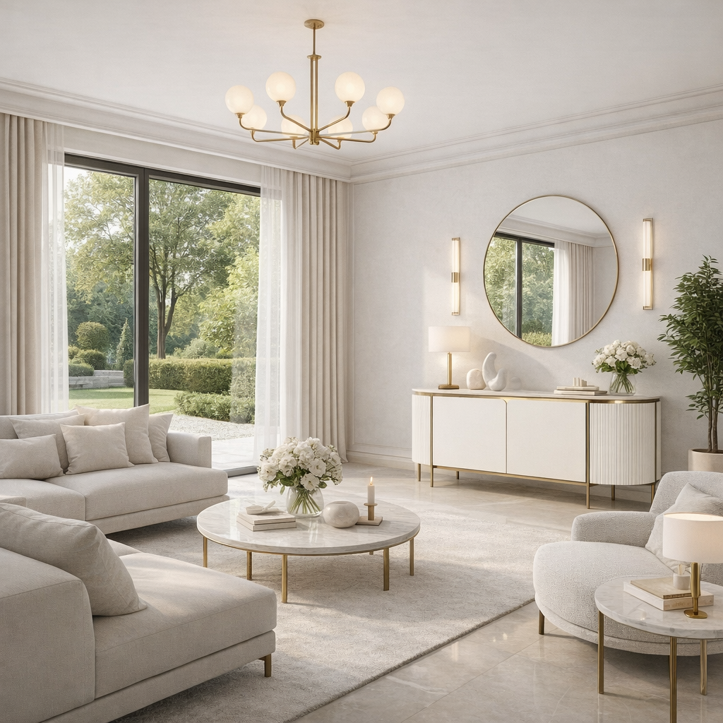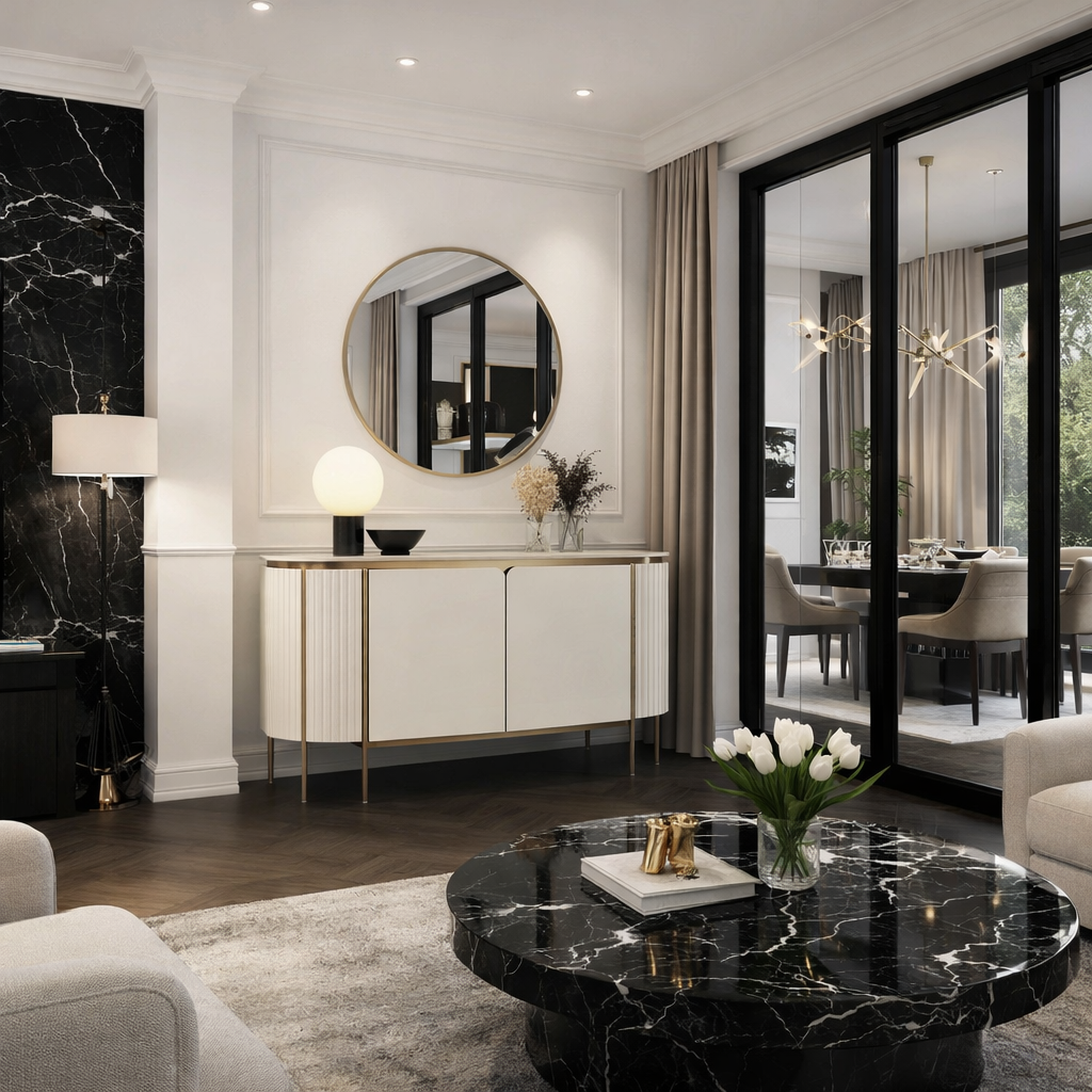 Off-white, white countertop, golden legs and accents