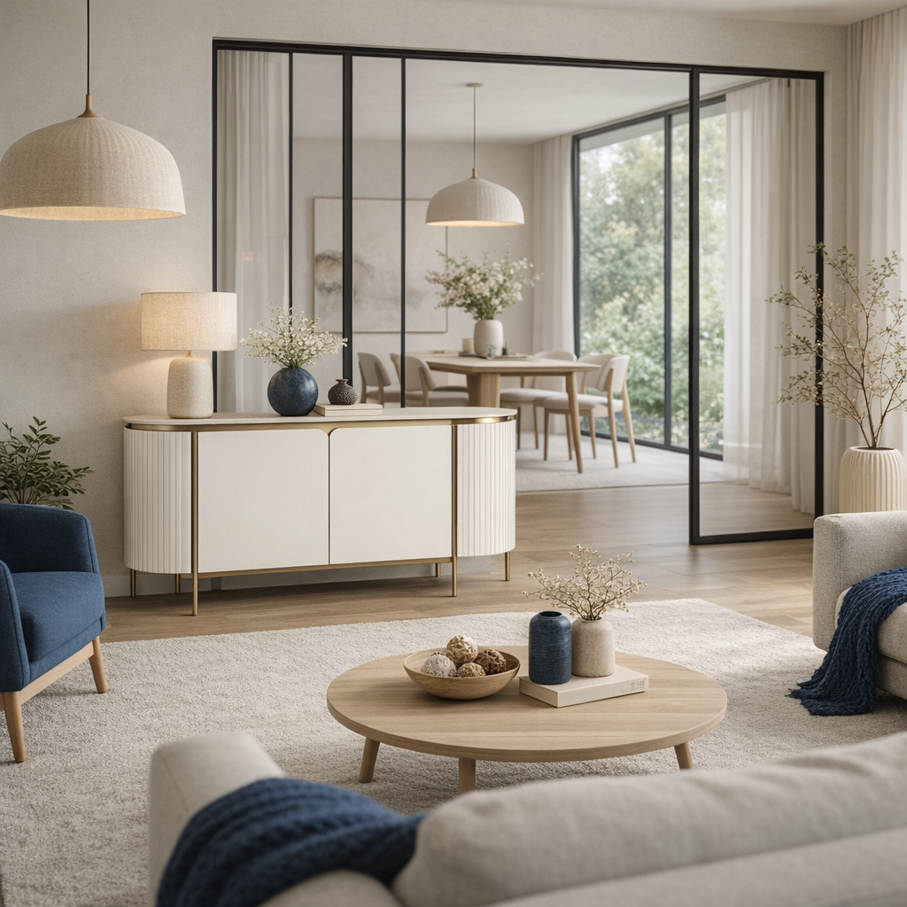 - A stylish off-white sideboard with gold accents and legs. The body has grooved wood on rounded sides and a smooth door with a stylish indentation in the central part and a table top with a marble finish.
