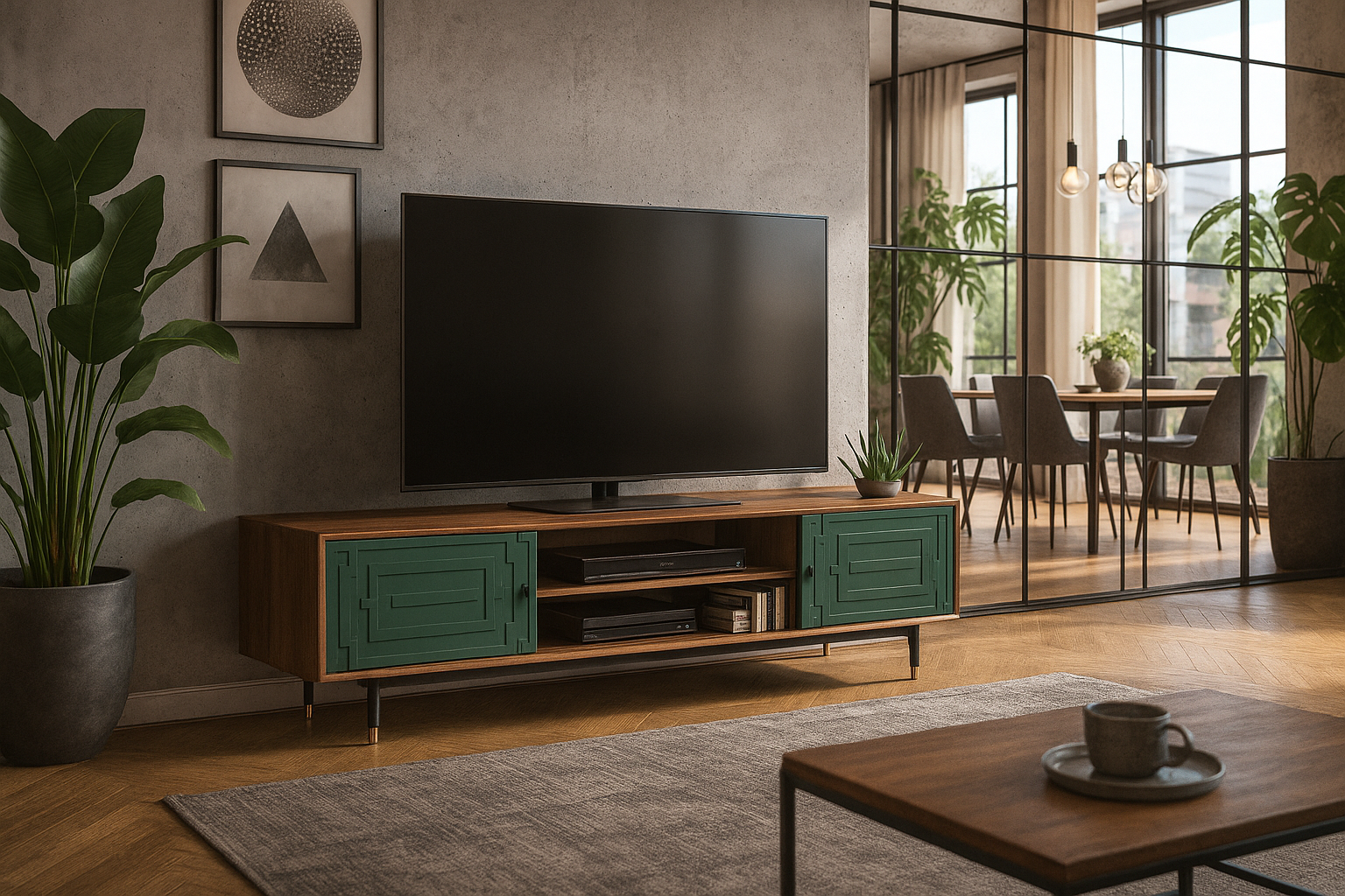 - Original walnut-colored TV cabinet with a mint-green front with an embossed geometric pattern. Black, straight legs are finished with a gold accent. The body is covered with veneer with a visible wood structure.