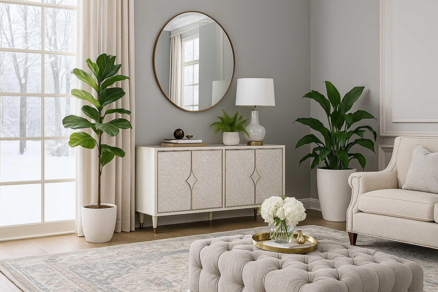 - Original ecru white sideboard with a front made of a natural shell resembling fish scales. The door is surrounded by golden strips and the whole is complemented by massive diamond-shaped handles. The white legs are finished with a gold accent.