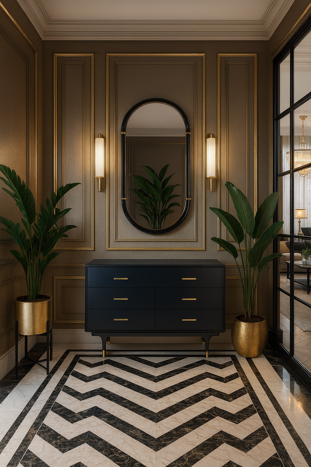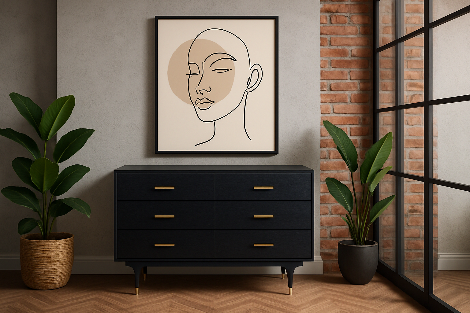- A stylish black dresser with gold handles and legs finished with a gold accent. The body is covered with veneer with a visible wood structure.