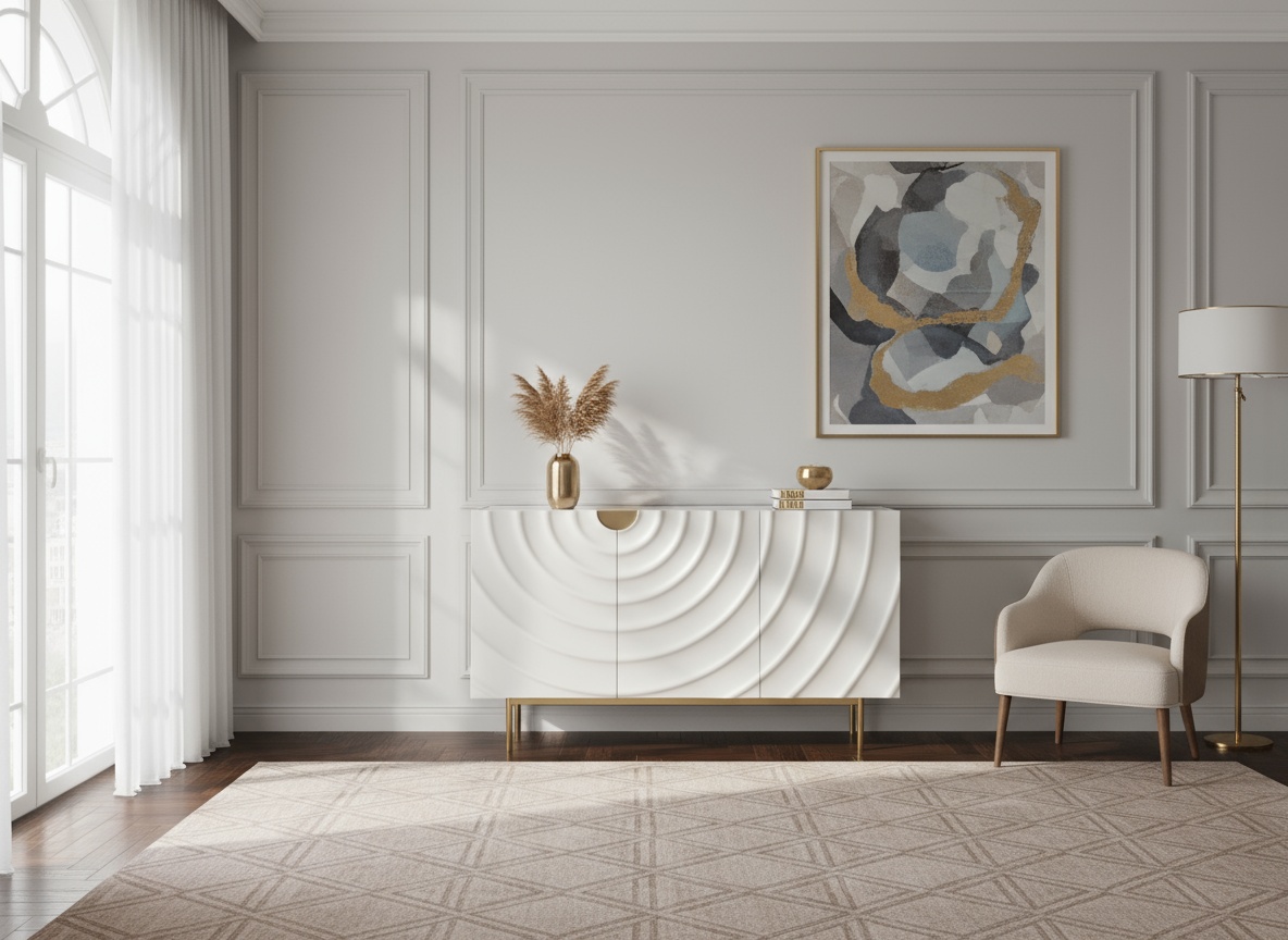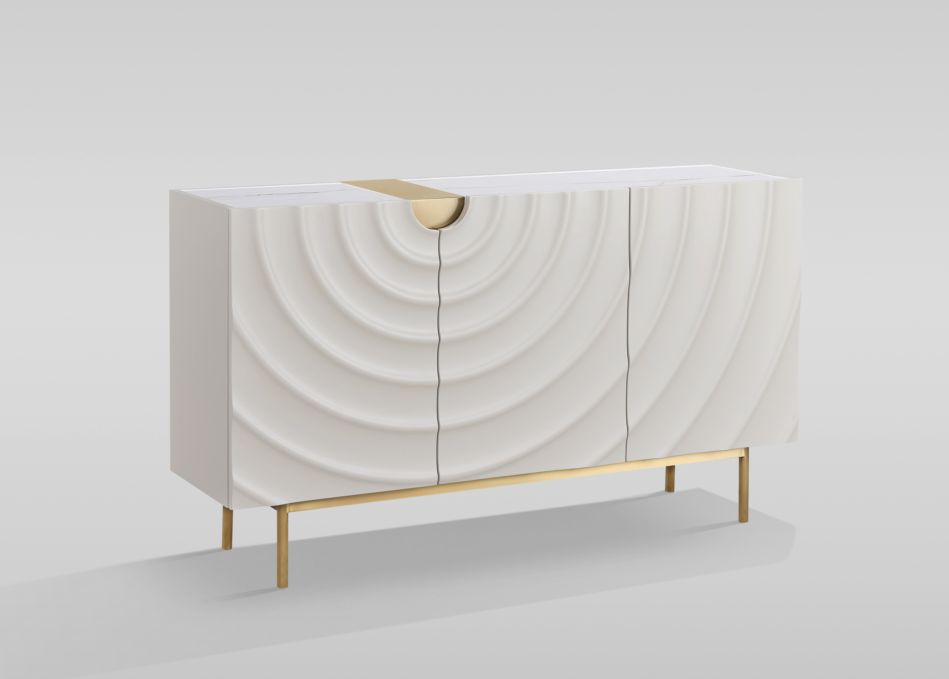 - This ecru-white chest of drawers with gold accents and legs evokes the Art Deco style. The door fronts are embossed with concentric circles, with a central, asymmetrical pattern merging with the marble-finished top.h.