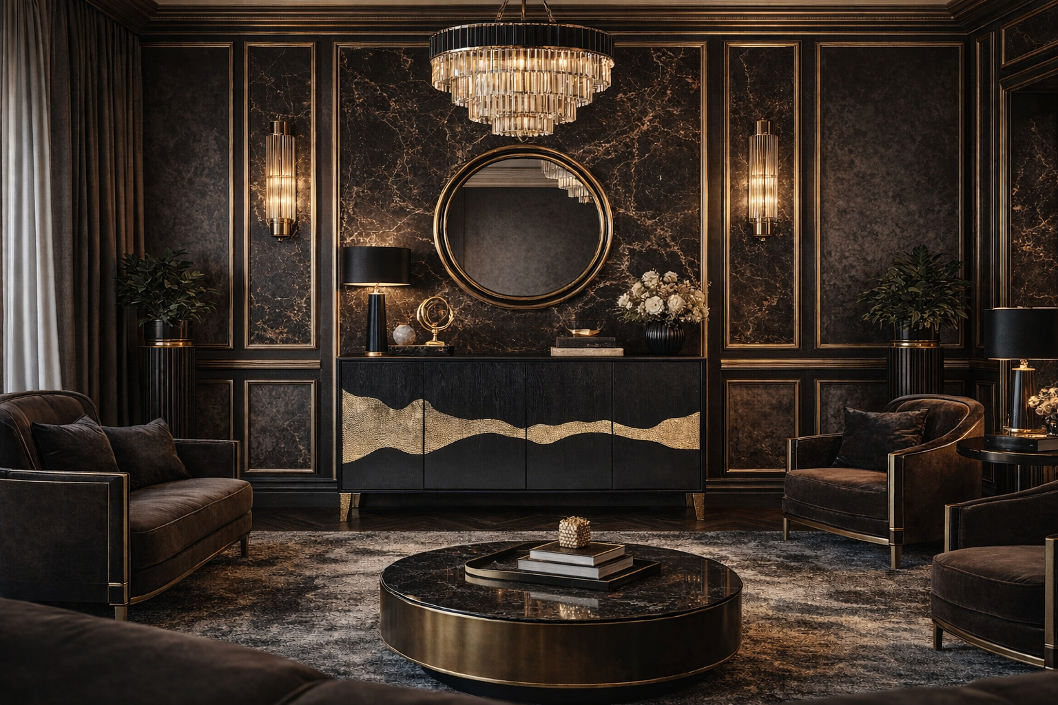 - An original black sideboard with gold accents in the form of a parametric pattern on the door and legs in an identical finish. The body is covered with veneer with a visible wood structure.