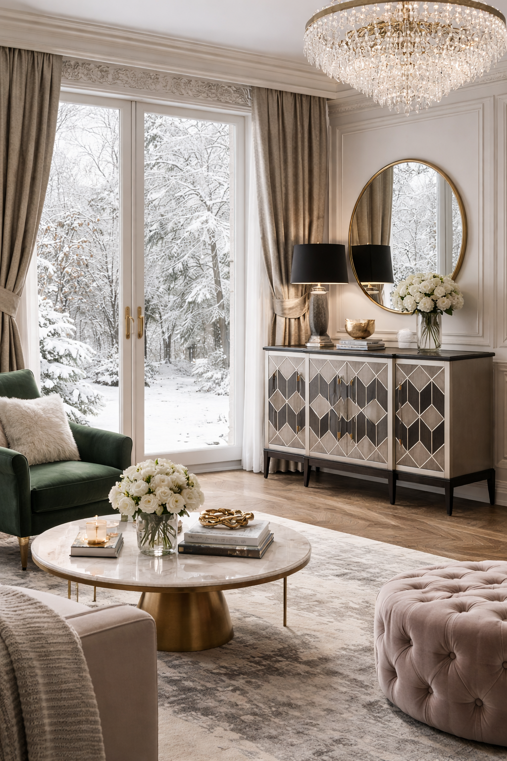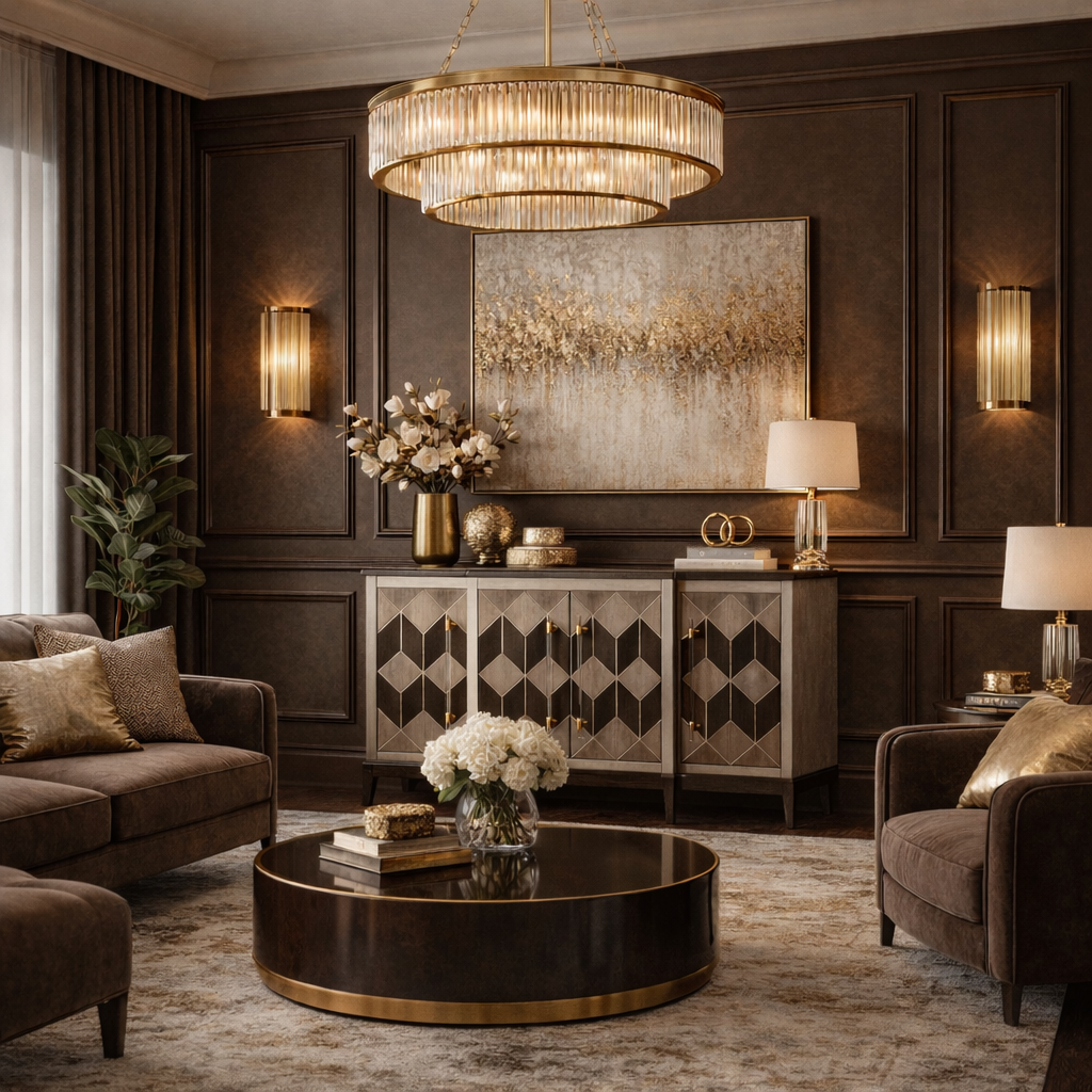 - Original grey sideboard with inlay giving a 3D effect. The pattern is highlighted with painted silver lines. The body is covered with veneer with a visible wood structure. Acrylic straight handles have gold metal accents.