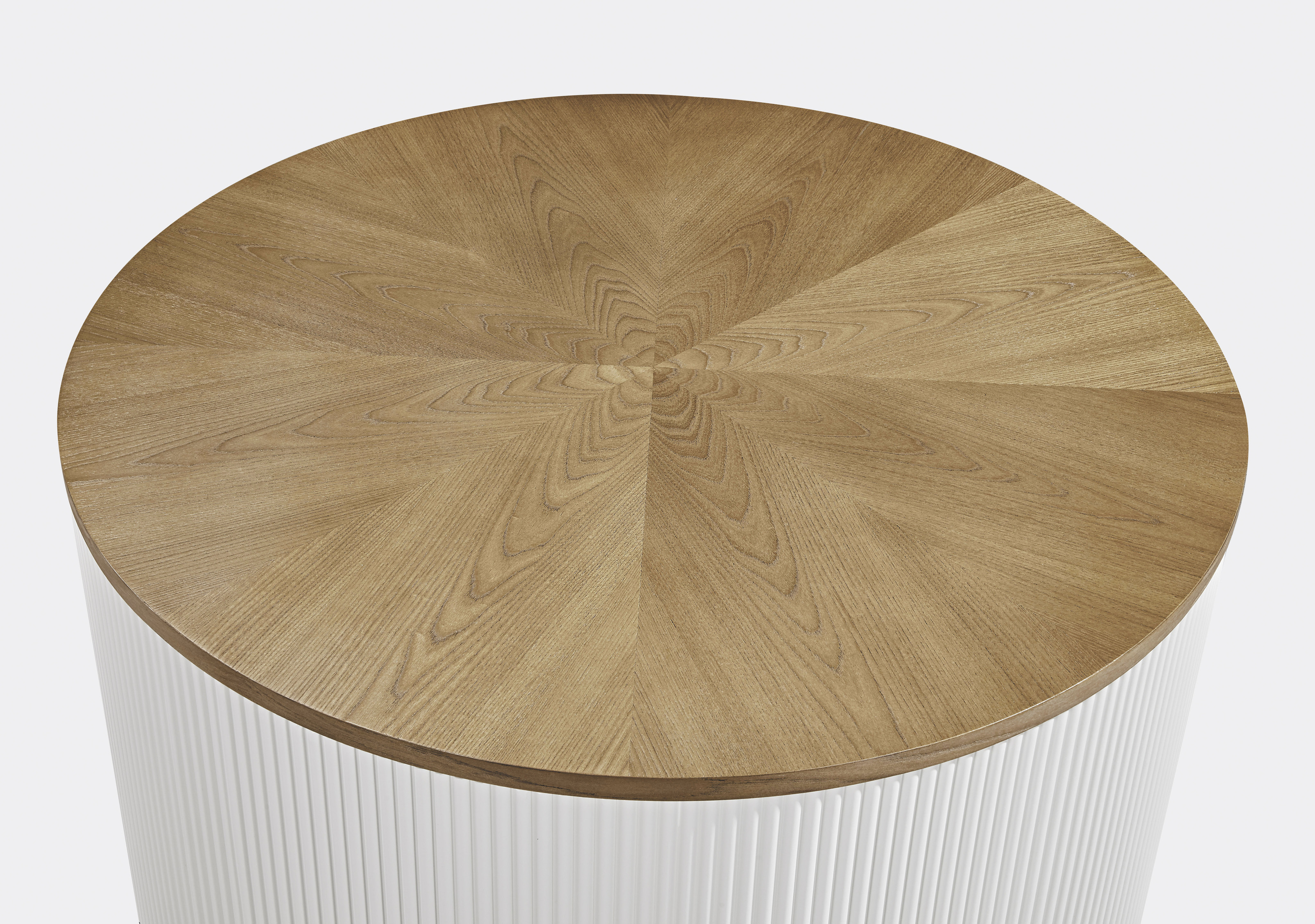 - A minimalist table in white and ecru with a lift-up top and storage compartment. The frame features grooved wood. The round tabletop is covered with a textured elm veneer.