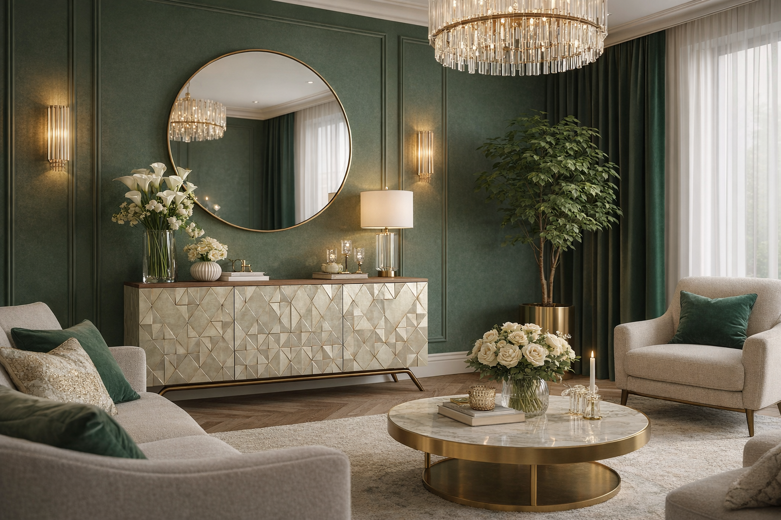 - Original sideboard in champagne gold. The simple design is broken by a parametric front with a geometric pattern referring to the art of origami. The shape of the legs refers to the retro style.