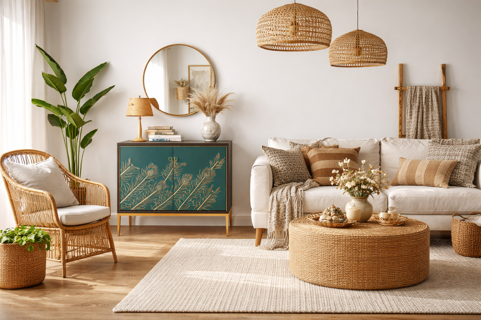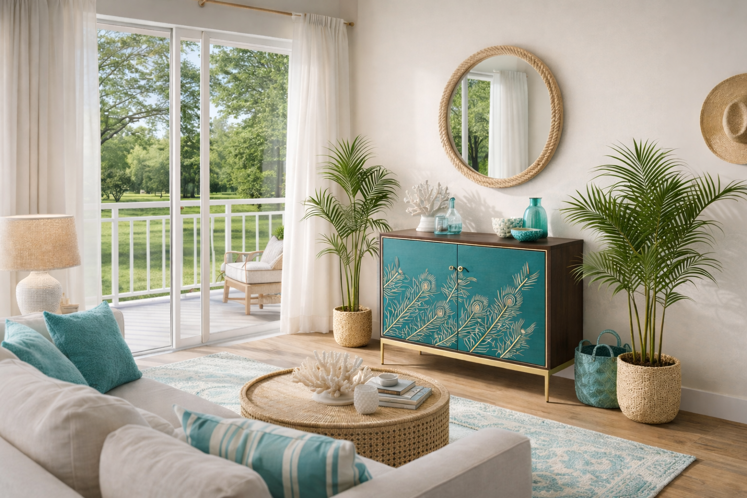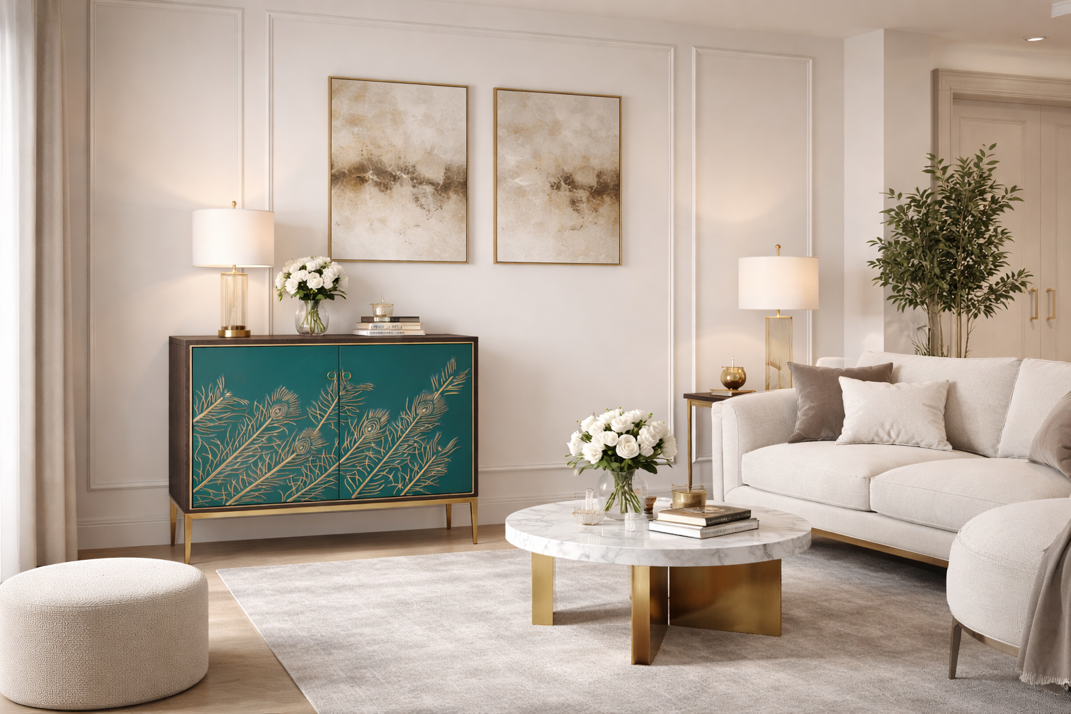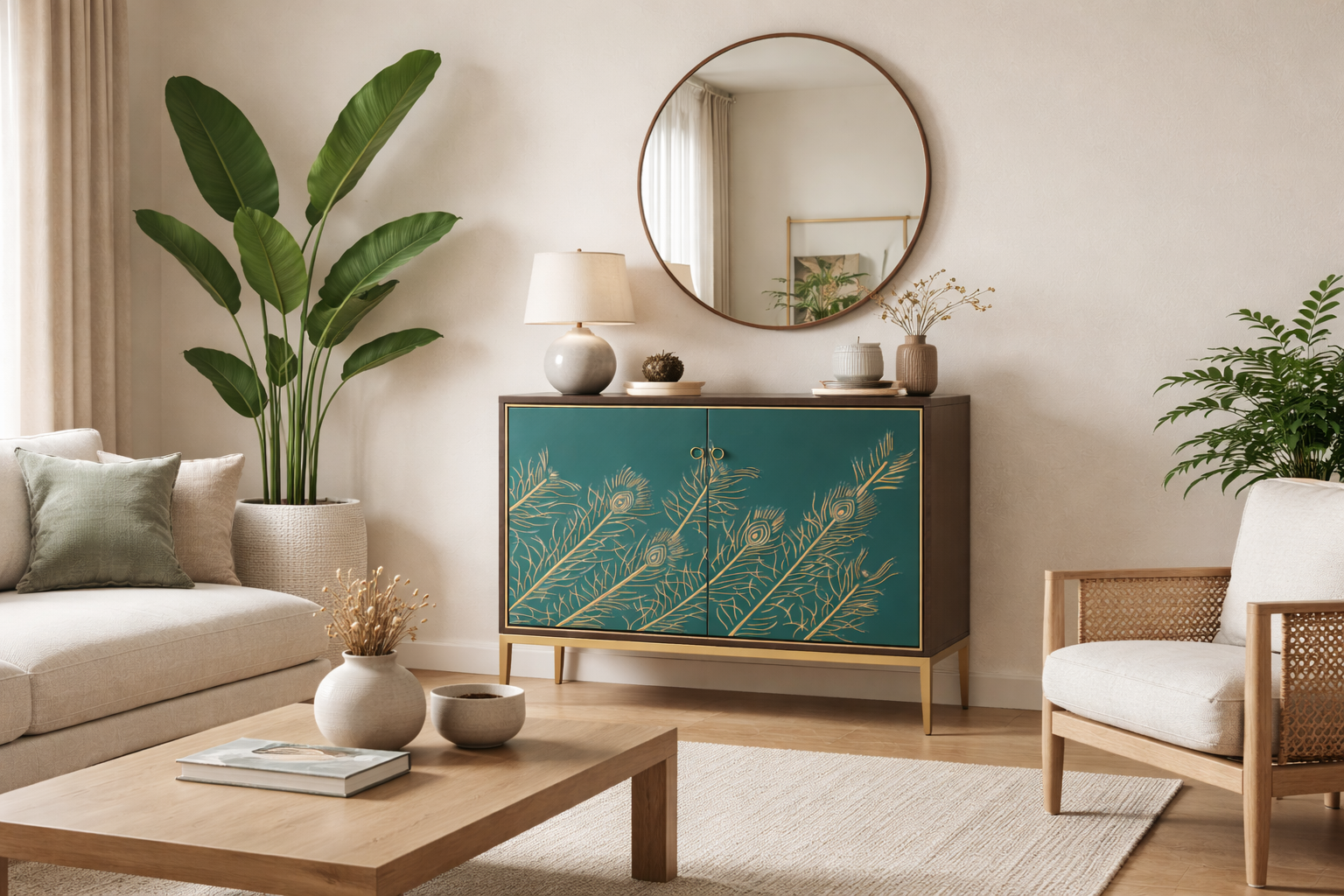 - An original walnut color sideboard with a turquoise front with gold accents in the form of embossed pattern in the shape of peacock feathers, a decorative strip around the door and gold legs. The body is covered with veneer with a visible wood structure.