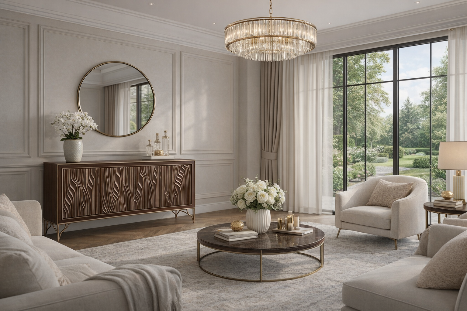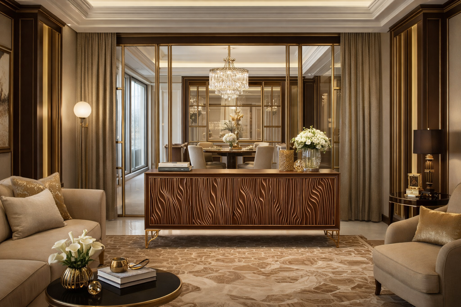 - An extraordinary sideboard in walnut color. The carved front, arranged in soft lines, is emphasized by gold paint, which harmonizes with the color of the legs. The smooth and painted body imitates the structure of wood.