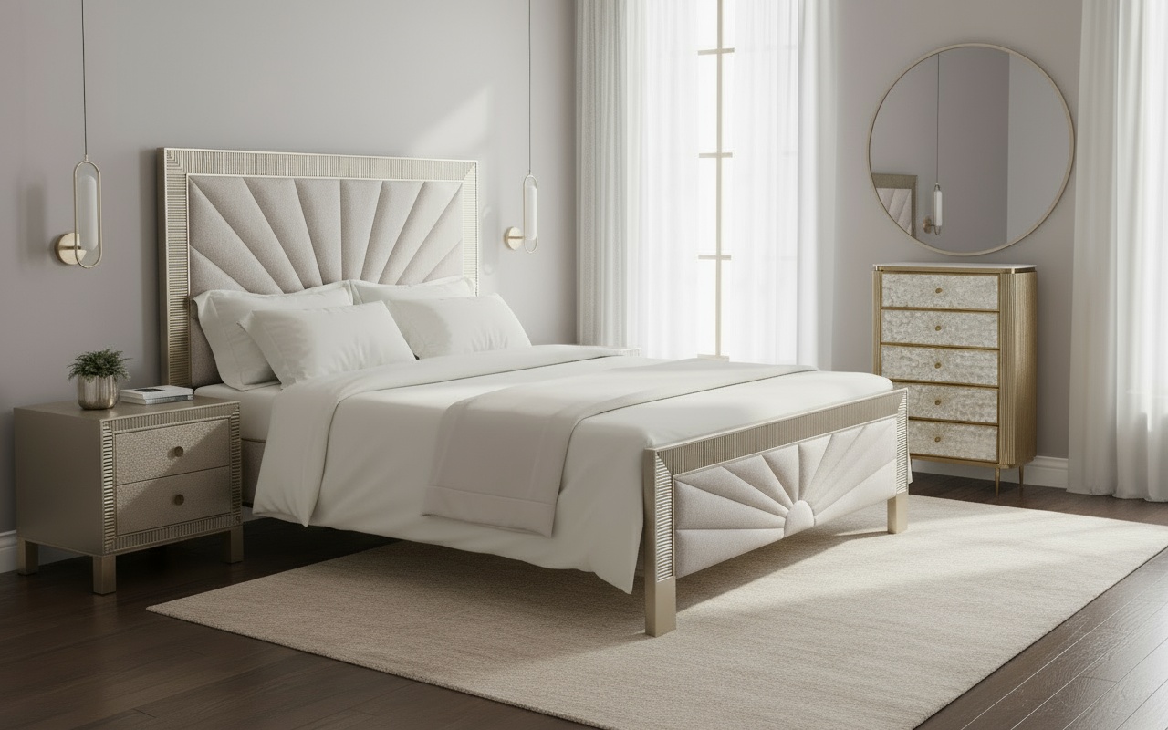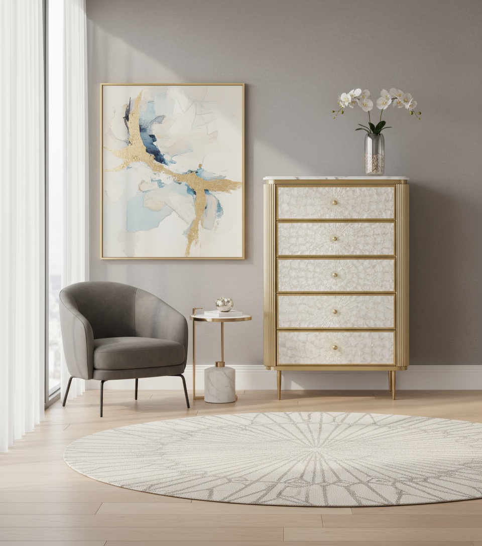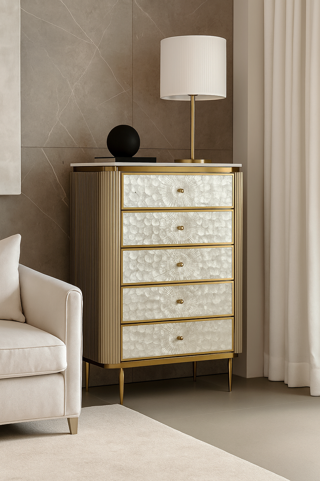 - This unique champagne gold chest of drawers features drawer fronts crafted from natural shell in a symmetrical pattern. The body features grooved wood and a marble-finished top.