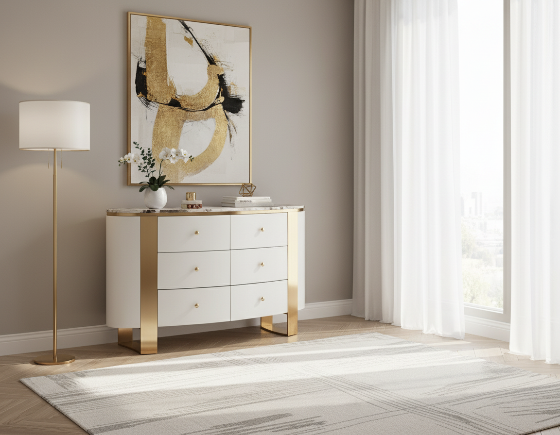 - A stylish, oval off-white chest of drawers with gold accents in the form of a strip under the countertop and legs connecting along the fronts to the countertop, which has a marble finish.