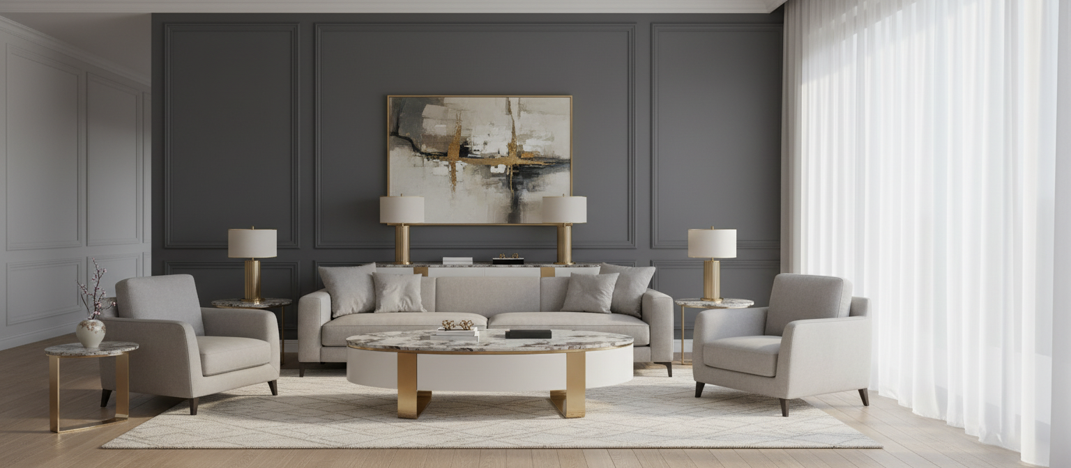 - An original, oval coffee table in off-white with gold accents in the form of a strip under the tabletop and legs connecting along the fronts to the tabletop, which has a marble finish.