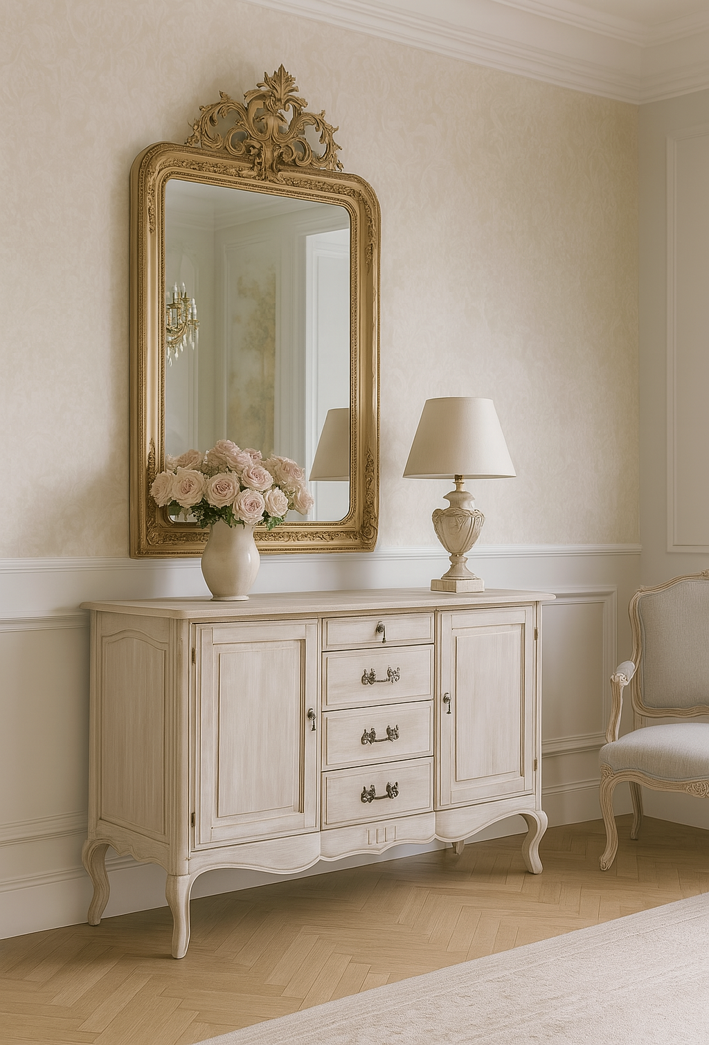 - Wooden chest of drawers on bent, milled legs in Provençal style. The body in a non-uniform light beige semi-matte. The chest of drawers has decorative metal handles in dark brass color and milling.