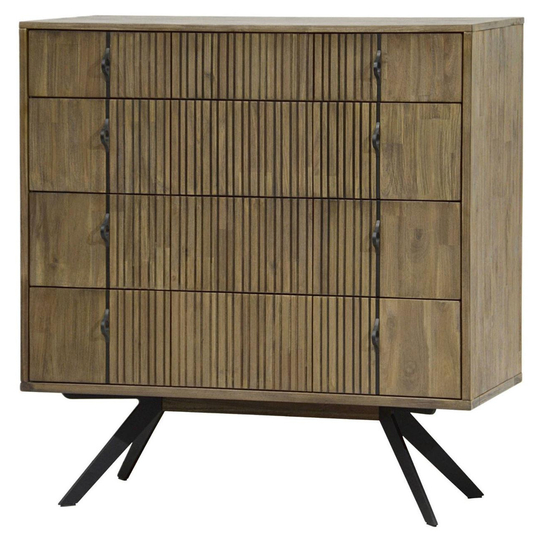 Proste, geometryczne bryły, nietuzinkowa struktura frontów, modne lamele i funkcjonalność elementów kolekcji docenią wszyscy domownicy. Charakterystyczne odchylone na boki, metalowe nóżki łączą się płynnie z odcieniami brązu mebla. Dodatkowym metalowym detalem są ciemne uchwyty, które swoim rozstawem podkreślające nowoczesny design. Połączenie metalu z drewnem to ponadczasowy hit modowy w dziedzinie aranżacji wnętrz.