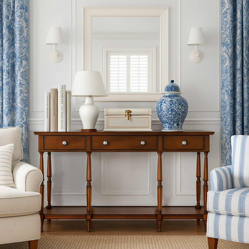 - Elegancka konsola w stylu hampton na toczonych nóżkach. Produkt posiada funkcjonalne szuflady z prostymi uchwytami oraz półkę a także charakterystyczne postarzenia w postaci kornikowania na blacie, półce i frontach.