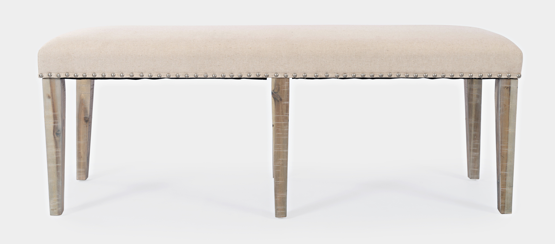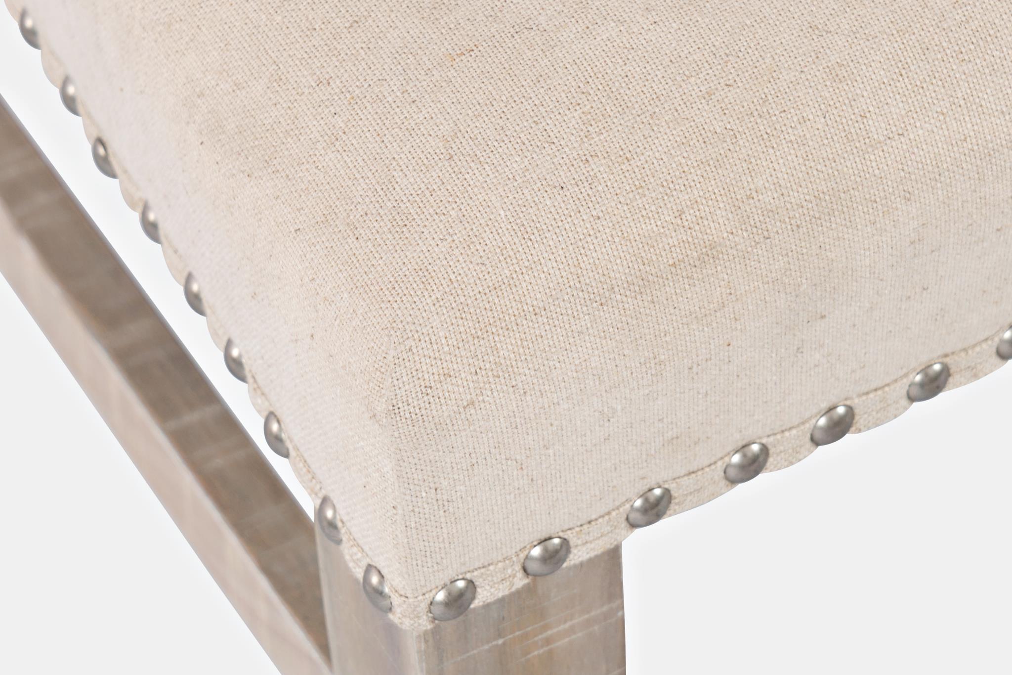 Ławka tapicerowana w stylu rustykalnym w kolorze jasnego drewna z charakterystycznymi przetarciami shabby-chic. Prostą formę o surowym wykończeniu przełamuje tapicerka z ćwiekami.
