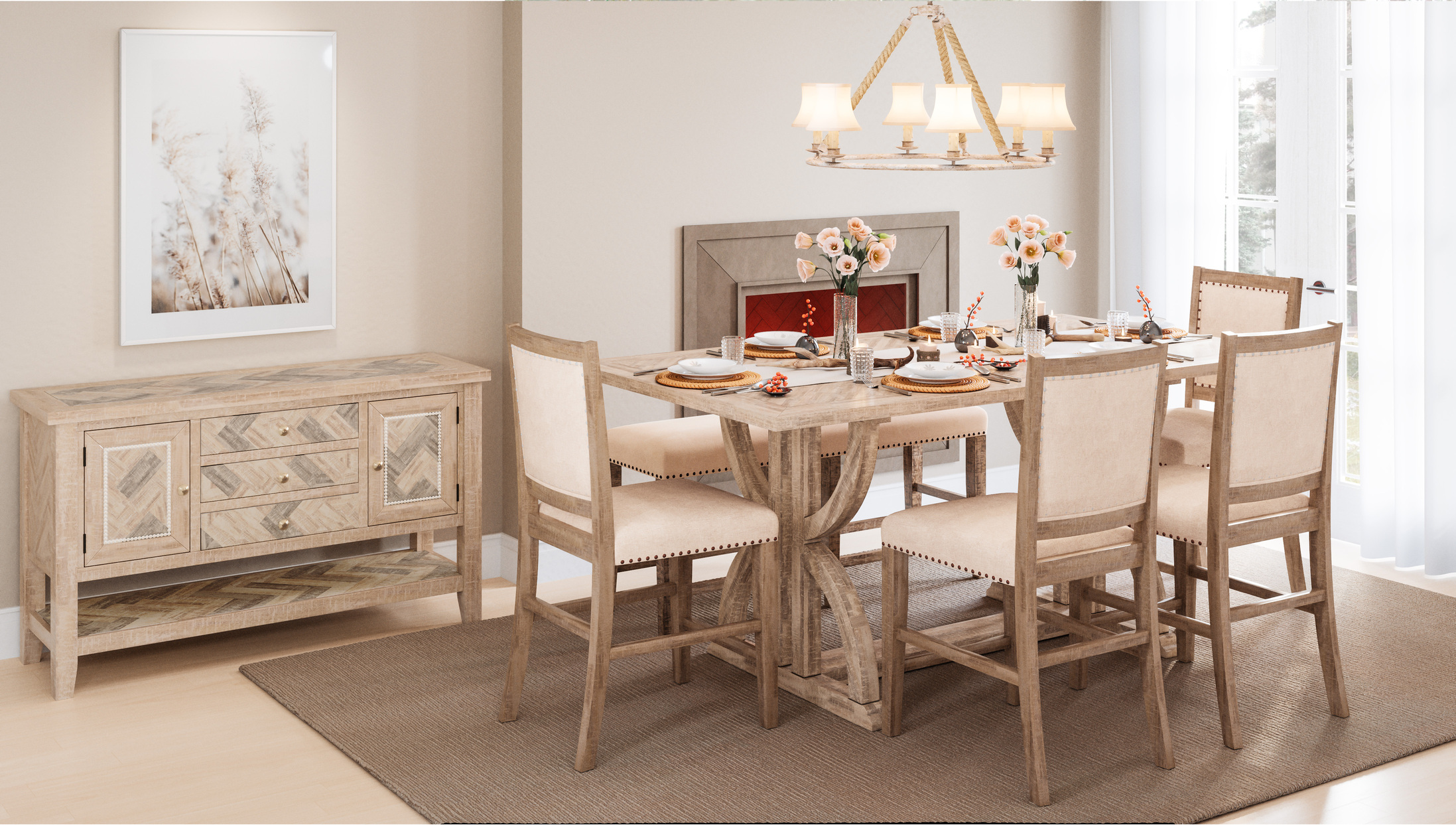 Stół drewniany w stylu klasycznym, prowansalskim na nogach w kształcie krzyża o zaokrąglonym kształcie, w kolorze jasnego dębu. Masywny blat charakteryzuje się intarsją w jodełkę. Mebel posiada widoczną strukturę drewna.