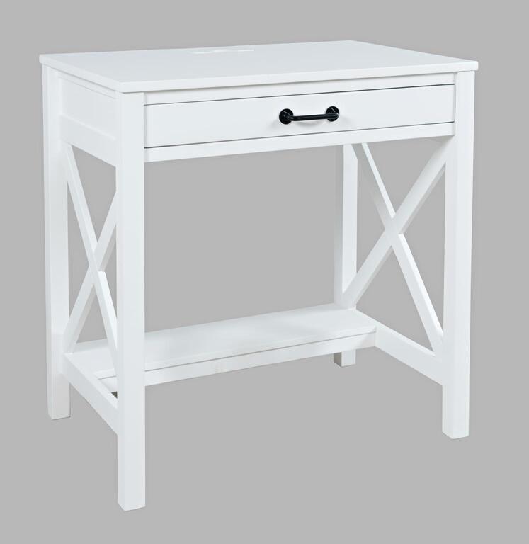 - Klasyczne, białe biurko o kompaktowych wymiarach. Produkt posiada funkcjonalną szufladę, wbudowane w blat gniazdo i porty usb oraz praktyczny podnóżek zapewniający ergonomię pracy. Doskonały mebel do zagospodarowania niewielkich przestrzeni.