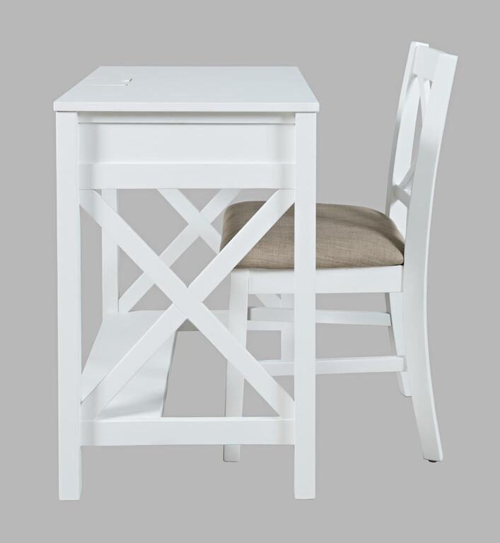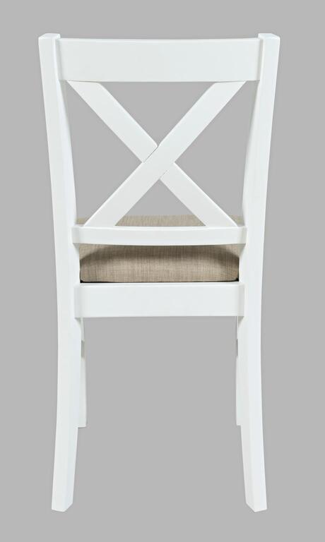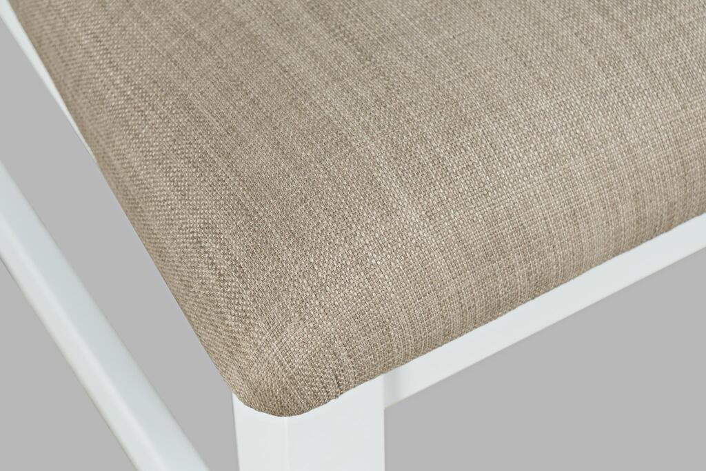 - Krzesło tapicerowane w stylu rustykalnym w kolorze białym. Prostą formę przełamują plecy z oparciem krzyżowym oraz kremowe siedzisko tapicerowane.