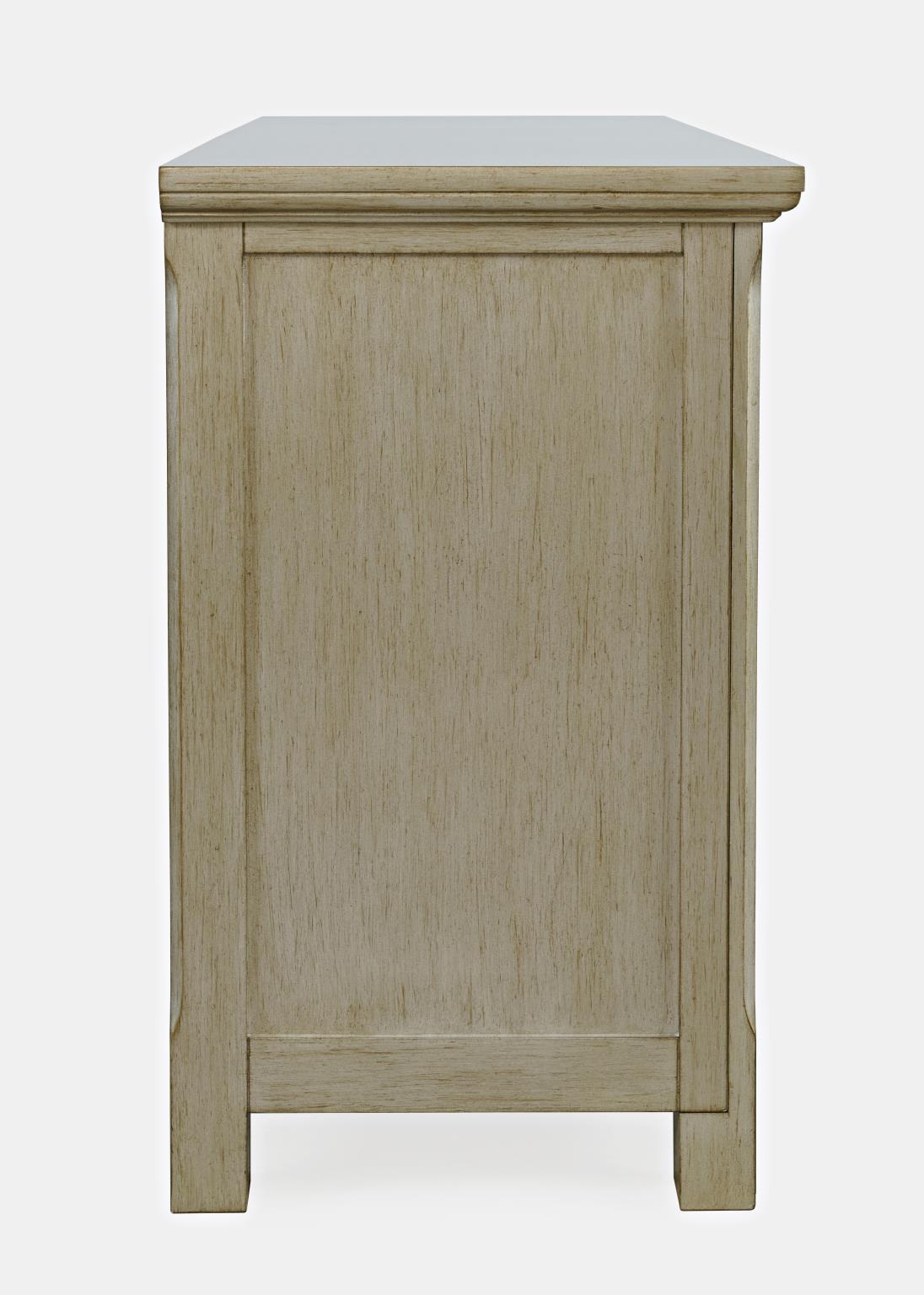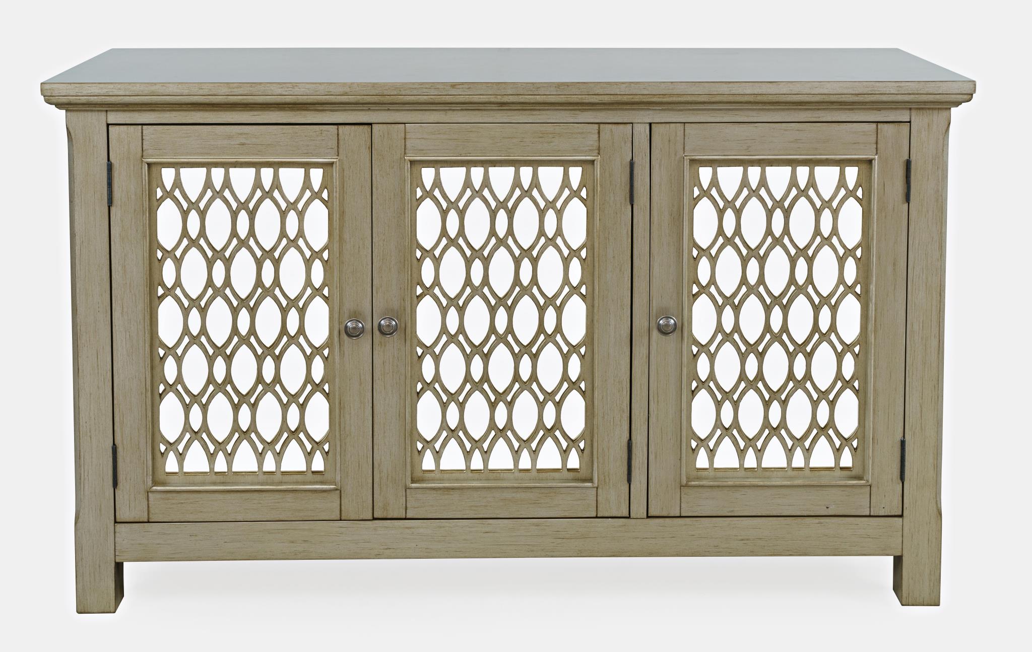 - Elegancka komoda w kolorze złotym z lustrzanymi drzwiami wykończonymi ozdobnymi szprosami. Mebel wykonany z drewna akacji z gładkim wykończeniem powierzchni.