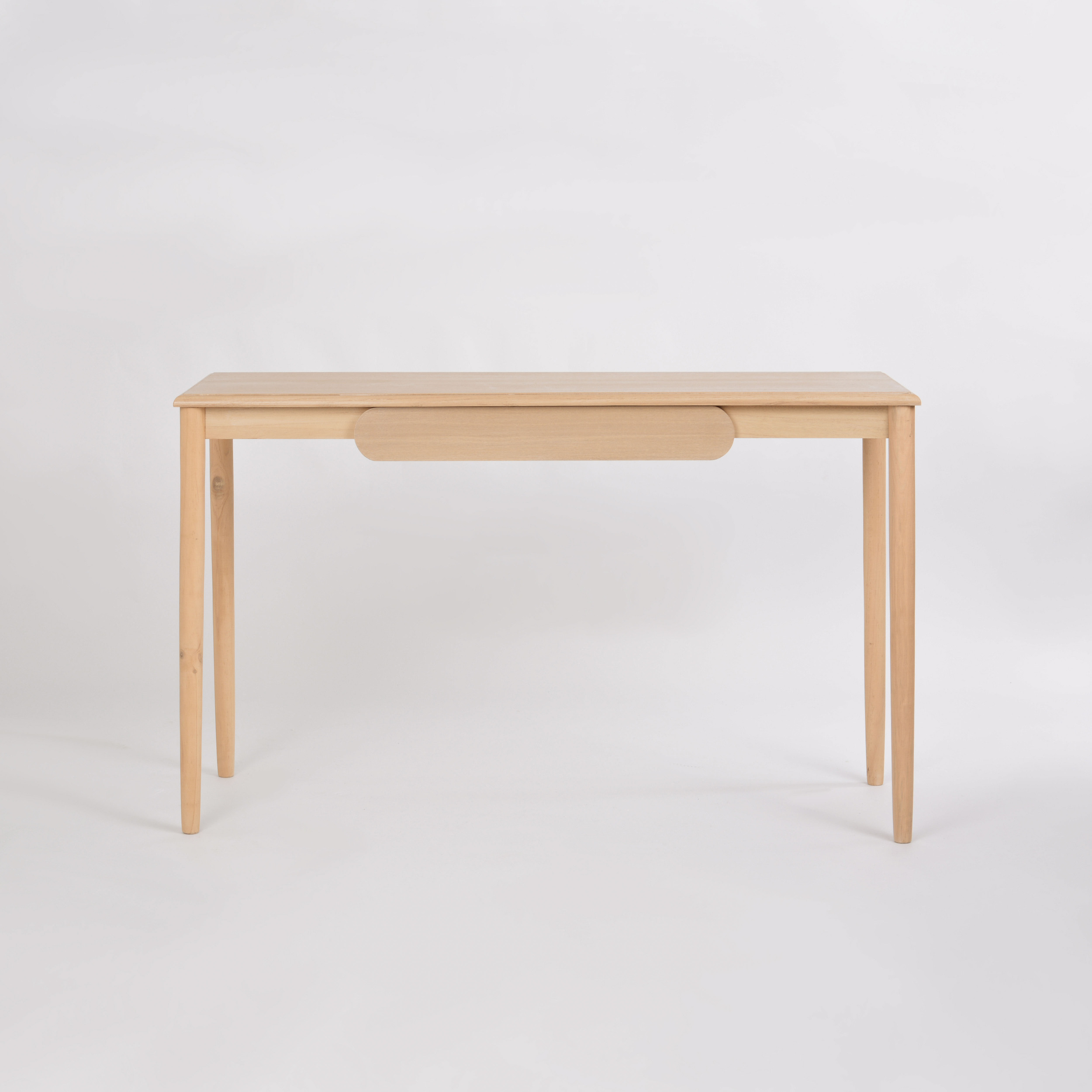 - Minimalistyczna konsola w stylu skandynawskim wykonana z drewna paulowni w kolorze bielonego dębu. Praktyczna szuflada z frontem w kształcie owalu idealnie współgra z prostą formą konstukcji.