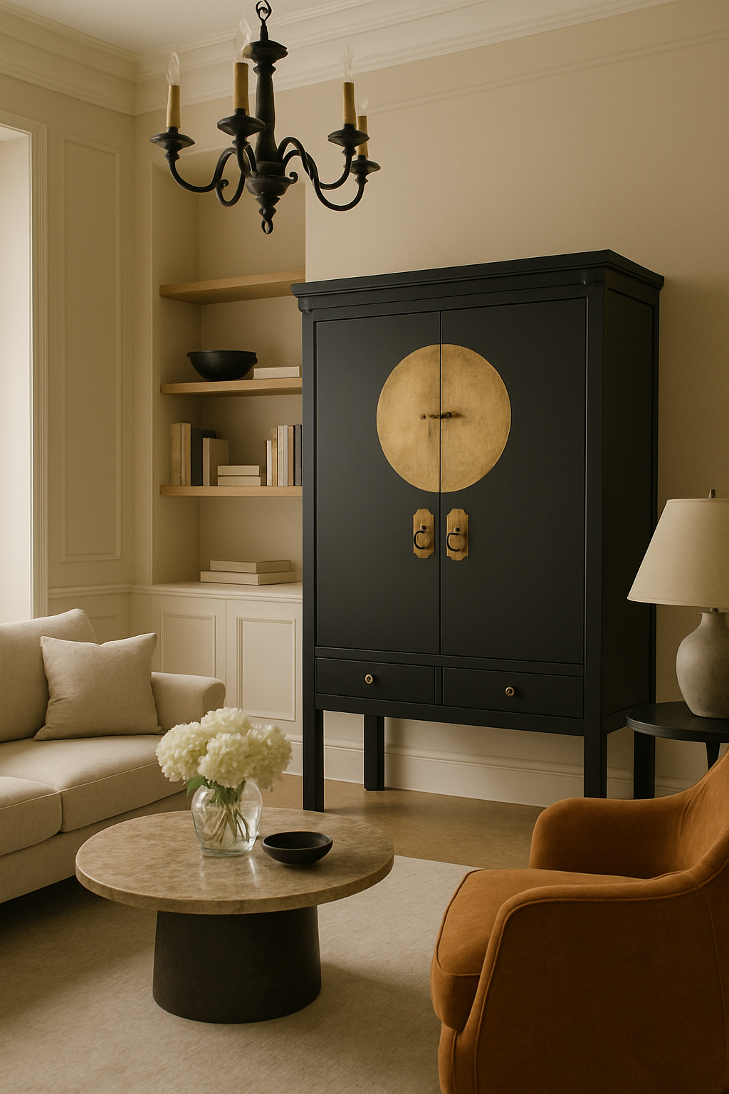 - Stylowa szafa w kolorze czarnym z eleganckimi, złotymi okuciami i nietuzinkowymi zdobieniami. Charakterystyczne czerwone przetarcia i frezowane elementy na froncie wzbogacają prosty kształt mebla.