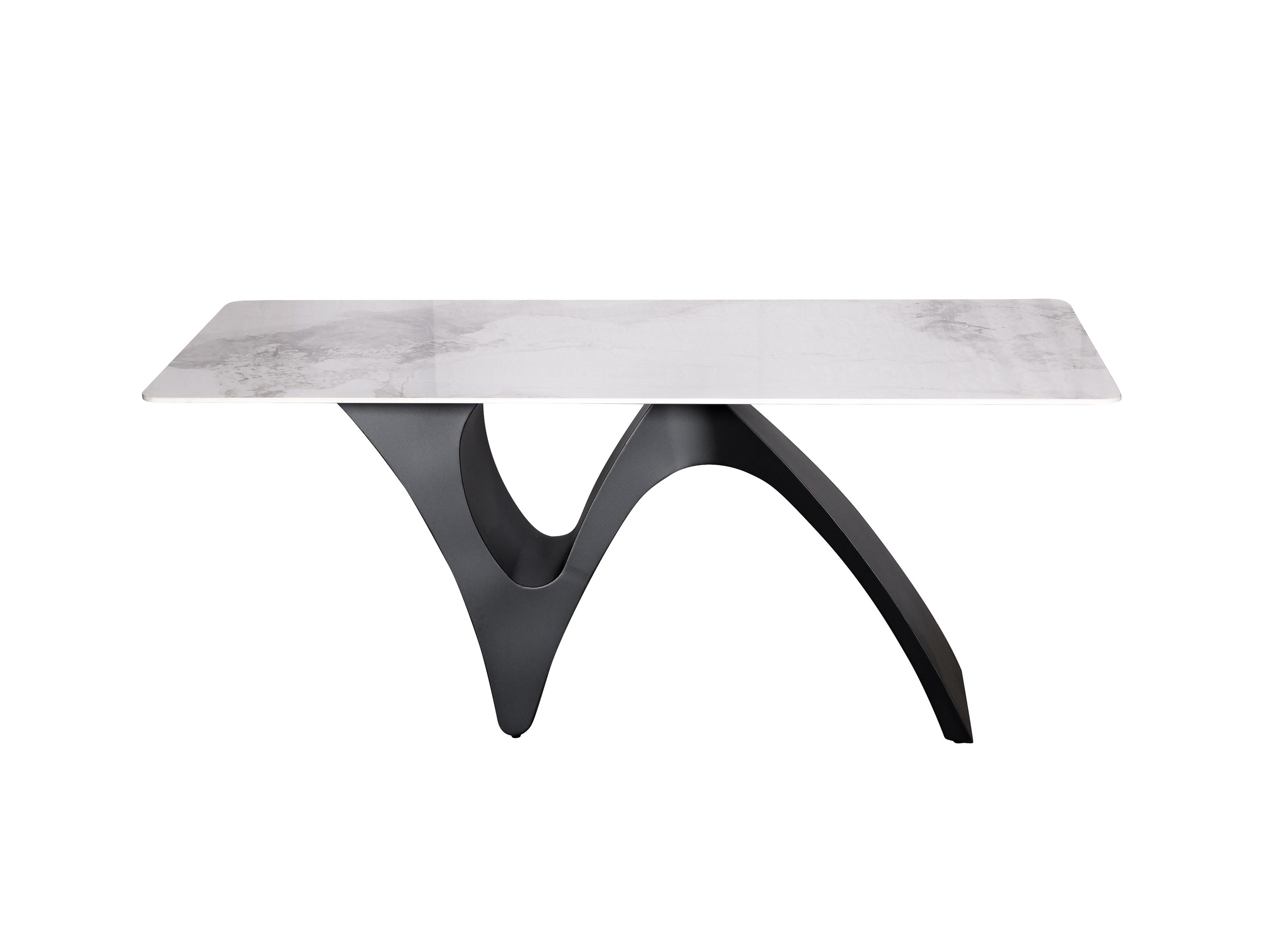 - Oryginalny stół o podstawie wykonanej ze stali nierdzewnej w kolorze grafitowym, w kształcie geometrycznej bryły przestrzennej. Prostokątny blat w kolorze białym ma wzór imitujący marmur.