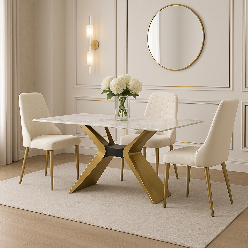 - Krzesło tapicerowane w stylu glamour. Złote nogi ze szczotkowanej stali nierdzewnej w połączeniu z miękką, welurową tkaniną w kolorze łamanej bieli nadadzą szyku i elegancji każdej jadalni.